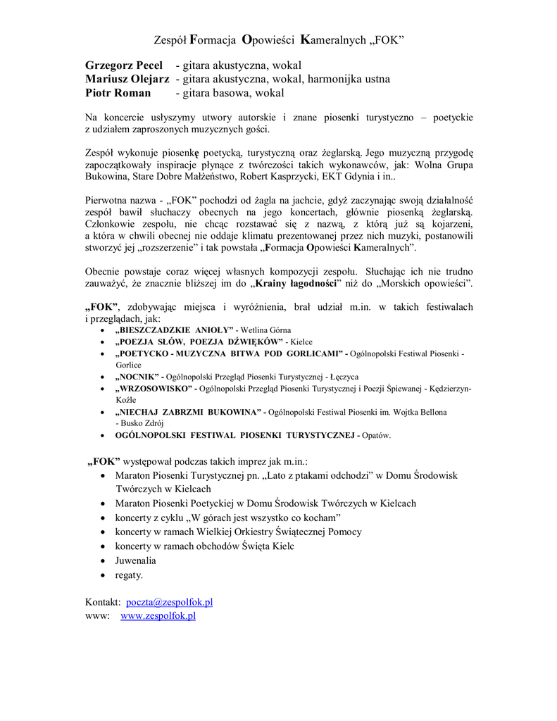 Zespół Formacja Opowieści Kameralnych „FOK” Grzegorz Pecel - gitara akustyczna, wokal Mariusz Olejarz - gitara akustyczna, wokal, harmonijka ustna Piotr Roman - gitara basowa, wokal Na koncercie usłyszymy utwory autorskie i znane piosenki turystyczno – poetyckie z udziałem zaproszonych muzycznych gości. Zespół wykonuje piosenkę poetycką, turystyczną oraz żeglarską. Jego muzyczną przygodę zapoczątkowały inspiracje płynące z twórczości takich wykonawców, jak: Wolna Grupa Bukowina, Stare Dobre Małżeństwo, Robert Kasprzycki, EKT Gdynia i in.. Pierwotna nazwa - „FOK” pochodzi od żagla na jachcie, gdyż zaczynając swoją działalność zespół bawił słuchaczy obecnych na jego koncertach, głównie piosenką żeglarską. Członkowie zespołu, nie chcąc rozstawać się z nazwą, z którą już są kojarzeni, a która w chwili obecnej nie oddaje klimatu prezentowanej przez nich muzyki, postanowili stworzyć jej „rozszerzenie” i tak powstała „Formacja Opowieści Kameralnych”. Obecnie powstaje coraz więcej własnych kompozycji zespołu. Słuchając ich nie trudno zauważyć, że znacznie bliższej im do „Krainy łagodności” niż do „Morskich opowieści”. „FOK”, zdobywając miejsca i wyróżnienia, brał udział m.in. w takich festiwalach i przeglądach, jak: • • • • • • • „BIESZCZADZKIE ANIOŁY” - Wetlina Górna „POEZJA SŁÓW, POEZJA DŹWIĘKÓW” - Kielce „POETYCKO - MUZYCZNA BITWA POD GORLICAMI” - Ogólnopolski Festiwal Piosenki Gorlice „NOCNIK” - Ogólnopolski Przegląd Piosenki Turystycznej - Łęczyca „WRZOSOWISKO” - Ogólnopolski Przegląd Piosenki Turystycznej i Poezji Śpiewanej - KędzierzynKoźle „NIECHAJ ZABRZMI BUKOWINA” - Ogólnopolski Festiwal Piosenki im. Wojtka Bellona - Busko Zdrój OGÓLNOPOLSKI FESTIWAL PIOSENKI TURYSTYCZNEJ - Opatów. „FOK” występował podczas takich imprez jak m.in.: • Maraton Piosenki Turystycznej pn. „Lato z ptakami odchodzi” w Domu Środowisk Twórczych w Kielcach • Maraton Piosenki Poetyckiej w Domu Środowisk Twórczych w Kielcach • koncerty z cyklu „W górach jest wszystko co kocham” • koncerty w ramach Wielkiej Orkiestry Świątecznej Pomocy • koncerty w ramach obchodów Święta Kielc • Juwenalia • regaty. Kontakt: [email protected] www: www.zespolfok.pl