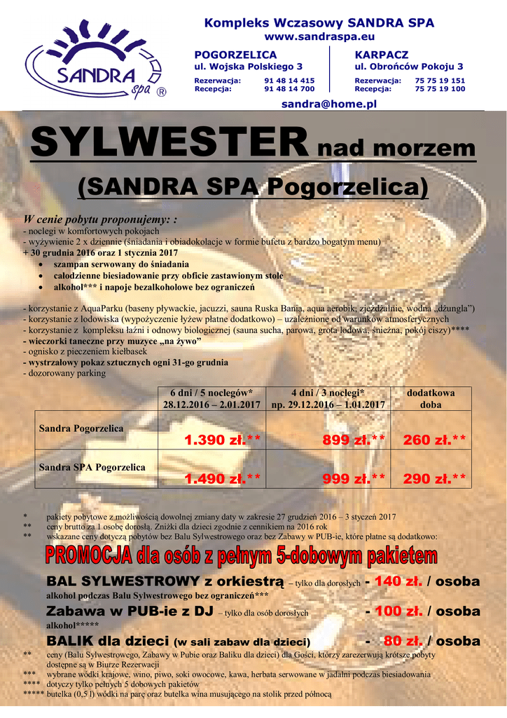 Kompleks Wczasowy SANDRA SPA www.sandraspa.eu POGORZELICA KARPACZ ul. Wojska Polskiego 3 ul. Obrońców Pokoju 3 Rezerwacja: Recepcja: Rezerwacja: Recepcja: 91 48 14 415 91 48 14 700 75 75 19 151 75 75 19 100 [email protected] SYLWESTER nad morzem (SANDRA SPA Pogorzelica) W cenie pobytu proponujemy: : - noclegi w komfortowych pokojach - wyżywienie 2 x dziennie (śniadania i obiadokolacje w formie bufetu z bardzo bogatym menu) + 30 grudnia 2016 oraz 1 stycznia 2017 szampan serwowany do śniadania całodzienne biesiadowanie przy obficie zastawionym stole alkohol*** i napoje bezalkoholowe bez ograniczeń - korzystanie z AquaParku (baseny pływackie, jacuzzi, sauna Ruska Bania, aqua aerobik, zjeżdżalnie, wodna „dżungla”) - korzystanie z lodowiska (wypożyczenie łyżew płatne dodatkowo) – uzależnione od warunków atmosferycznych - korzystanie z kompleksu łaźni i odnowy biologicznej (sauna sucha, parowa, grota lodowa, śnieżna, pokój ciszy)**** - wieczorki taneczne przy muzyce „na żywo” - ognisko z pieczeniem kiełbasek - wystrzałowy pokaz sztucznych ogni 31-go grudnia - dozorowany parking 6 dni / 5 noclegów* 28.12.2016 – 2.01.2017 4 dni / 3 noclegi* np. 29.12.2016 – 1.01.2017 dodatkowa doba 1.390 zł.** 899 zł.** 260 zł.** 1.490 zł.** 999 zł.** 290 zł.** Sandra Pogorzelica Sandra SPA Pogorzelica * ** ** pakiety pobytowe z możliwością dowolnej zmiany daty w zakresie 27 grudzień 2016 – 3 styczeń 2017 ceny brutto za 1 osobę dorosłą. Zniżki dla dzieci zgodnie z cennikiem na 2016 rok wskazane ceny dotyczą pobytów bez Balu Sylwestrowego oraz bez Zabawy w PUB-ie, które płatne są dodatkowo: BAL SYLWESTROWY z orkiestrą – tylko dla dorosłych - 140 zł. / osoba alkohol podczas Balu Sylwestrowego bez ograniczeń*** Zabawa w PUB-ie z DJ – tylko dla osób dorosłych - 100 zł. / osoba (w sali zabaw dla dzieci) - 80 zł. / osoba alkohol***** BALIK dla dzieci ** ceny (Balu Sylwestrowego, Zabawy w Pubie oraz Baliku dla dzieci) dla Gości, którzy zarezerwują krótsze pobyty dostępne są w Biurze Rezerwacji *** wybrane wódki krajowe, wino, piwo, soki owocowe, kawa, herbata serwowane w jadalni podczas biesiadowania **** dotyczy tylko pełnych 5 dobowych pakietów ***** butelka (0,5 l) wódki na parę oraz butelka wina musującego na stolik przed północą