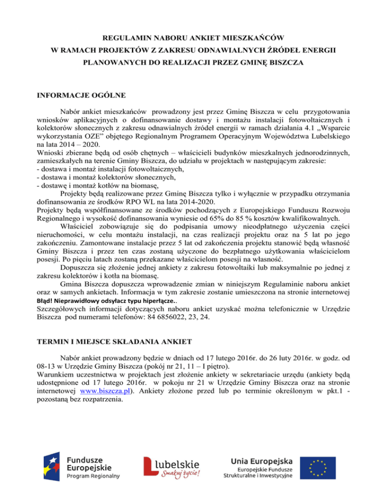 REGULAMIN NABORU ANKIET MIESZKAŃCÓW W RAMACH PROJEKTÓW Z ZAKRESU ODNAWIALNYCH ŹRÓDEŁ ENERGII PLANOWANYCH DO REALIZACJI PRZEZ GMINĘ BISZCZA INFORMACJE OGÓLNE Nabór ankiet mieszkańców prowadzony jest przez Gminę Biszcza w celu przygotowania wniosków aplikacyjnych o dofinansowanie dostawy i montażu instalacji fotowoltaicznych i kolektorów słonecznych z zakresu odnawialnych źródeł energii w ramach działania 4.1 „Wsparcie wykorzystania OZE” objętego Regionalnym Programem Operacyjnym Województwa Lubelskiego na lata 2014 – 2020. Wnioski zbierane będą od osób chętnych – właścicieli budynków mieszkalnych jednorodzinnych, zamieszkałych na terenie Gminy Biszcza, do udziału w projektach w następującym zakresie: - dostawa i montaż instalacji fotowoltaicznych, - dostawa i montaż kolektorów słonecznych, - dostawę i montaż kotłów na biomasę, Projekty będą realizowane przez Gminę Biszcza tylko i wyłącznie w przypadku otrzymania dofinansowania ze środków RPO WL na lata 2014-2020. Projekty będą współfinansowane ze środków pochodzących z Europejskiego Funduszu Rozwoju Regionalnego i wysokość dofinansowania wyniesie od 65% do 85 % kosztów kwalifikowalnych. Właściciel zobowiązuje się do podpisania umowy nieodpłatnego użyczenia części nieruchomości, w celu montażu instalacji, na czas realizacji projektu oraz na 5 lat po jego zakończeniu. Zamontowane instalacje przez 5 lat od zakończenia projektu stanowić będą własność Gminy Biszcza i przez ten czas zostaną użyczone do bezpłatnego użytkowania właścicielom posesji. Po pięciu latach zostaną przekazane właścicielom posesji na własność. Dopuszcza się złożenie jednej ankiety z zakresu fotowoltaiki lub maksymalnie po jednej z zakresu kolektorów i kotła na biomasę. Gmina Biszcza dopuszcza wprowadzenie zmian w niniejszym Regulaminie naboru ankiet oraz w samych ankietach. Informacja w tym zakresie zostanie umieszczona na stronie internetowej Błąd! Nieprawidłowy odsyłacz typu hiperłącze.. Szczegółowych informacji dotyczących naboru ankiet uzyskać można telefonicznie w Urzędzie Biszcza pod numerami telefonów: 84 6856022, 23, 24. TERMIN I MIEJSCE SKŁADANIA ANKIET Nabór ankiet prowadzony będzie w dniach od 17 lutego 2016r. do 26 luty 2016r. w godz. od 08-13 w Urzędzie Gminy Biszcza (pokój nr 21, 11 – I piętro). Warunkiem uczestnictwa w projektach jest złożenie ankiety w sekretariacie urzędu (ankiety będą udostępnione od 17 lutego 2016r. w pokoju nr 21 w Urzędzie Gminy Biszcza oraz na stronie internetowej www.biszcza.pl). Ankiety złożone przed lub po terminie określonym w pkt.1 pozostaną bez rozpatrzenia. SZCZEGÓŁOWA INFORMACJA O POSZCZEGÓLNYCH PROJEKTACH - panele fotowoltaiczne Projekt obejmujący montaż instalacji fotowoltaicznych na terenie Gminy Biszcza. Panele fotowoltaiczne służą do produkcji energię elektrycznej tylko na własne potrzeby gospodarstwa domowego. Instalacja fotowoltaiczna składa się z paneli fotowoltaicznych, inwertera, konstrukcji nośnej do montażu urządzenia na dachu budynku, okablowania, osprzętu instalacyjnego. Mikro instalacja fotowoltaiczna, powstała w wyniku realizacji projektu służyć będzie do zasilania wewnętrznej instalacji elektrycznej budynku mieszkalnego o napięciu 230 V lub 400 V. Wytworzona energia może być przeznaczona tylko i wyłącznie na potrzeby własne gospodarstwa domowego (nie mylić z potrzebami gospodarstwa rolnego), czyli do zasilania urządzeń codziennego użytku np. pralka, lodówka, zamrażarka, telewizor, terma itp. Szacunkowy koszt instalacji oraz wartość udziału uczestnika projektu będzie zależał od mocy zamontowanej instalacji fotowoltaicznej oraz miejsca lokalizacji i będzie określony w umowie podpisywanej przed rozpoczęciem realizacji projektu. Ze względu na wymagania stawiane przez Instytucję Zarządzającą jaką jest Urząd Marszałkowski Województwa Lubelskiego w Lublinie, każda gmina aplikująca o środki unijne, przed złożeniem wniosku o dofinansowanie projektu zobowiązana jest do posiadania dokumentacji technicznej podłączenia instalacji fotowoltaicznej na wskazanym przez mieszkańca budynku. W związku z powyższym mieszkaniec dobrowolnie zobowiązuje się do zagwarantowania dostępu do budynku, którego dotyczyć będzie instalacja, projektantowi opracowującemu dokumentację techniczną. W przypadku braku możliwości wykonania montażu instalacji fotowoltaicznej i tym samym projektu technicznego instalacji na wskazanym przez mieszkańca budynku, mieszkaniec nie zostanie zakwalifikowany do udziału w projekcie. W przypadku rezygnacji właściciela posesji z udziału w projekcie już po wykonaniu dokumentacji projektowej poniesie on całkowite koszty jej wykonania. Uczestnik projektu musi złożyć ankietę dotyczącą udziału w projekcie w celu zweryfikowania, czy budynek spełnia wszystkie niezbędne warunki oraz w celu dobrania odpowiedniej mocy instalacji fotowoltaicznej. Należy podkreślić, że instalacja musi być tak dobrana, aby całkowita wartość energii elektrycznej wyprodukowanej przez tę instalację nie mogła przekroczyć całkowitej wartość energii elektrycznej zakupionej z sieci energetycznej przez użytkownika w ostatnim rocznym okresie rozliczeniowym. W ankiecie należy podać wartość energii elektrycznej zakupionej przez użytkownika w ostatnim rocznym okresie rozliczeniowym z sieci energetycznej na podstawie rozliczeń z Zakładem Energetycznym, które muszą być dołączone do ankiety. Będzie to weryfikowane przez Urząd Marszałkowski w Lublinie podczas realizacji projektu. Podanie zawyżonych wartości zużytej energii będzie skutkowało zwrotem dotacji. Ankieta oraz objaśnienia do niej są załącznikami do niniejszego Regulaminu. Instalacje fotowoltaiczne będą montowane na budynkach mieszkalnych o mocy pomiędzy 2 kW a 3kW. - kolektory słoneczne Projekt obejmujący montaż kolektorów słoneczny