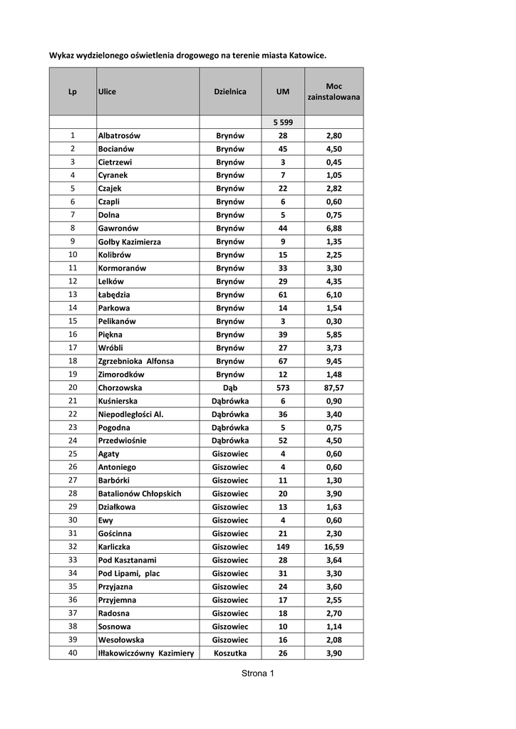 Wykaz wydzielonego oświetlenia drogowego na terenie miasta Katowice. UM Moc zainstalowana Lp Ulice Dzielnica 1 Albatrosów Brynów 28 2,80 2 Bocianów Brynów 45 4,50 3 4 Cietrzewi Cyranek Brynów Brynów 3 7 0,45 1,05 5 Czajek Brynów 22 2,82 6 7 Czapli Brynów 6 0,60 Dolna Brynów 5 0,75 8 Gawronów Brynów 44 6,88 9 Brynów 9 1,35 10 Gołby Kazimierza Kolibrów Brynów 15 2,25 11 Kormoranów Brynów 33 3,30 12 Lelków Brynów 29 4,35 13 Łabędzia Parkowa Brynów Brynów 61 14 6,10 1,54 15 16 Pelikanów Brynów 3 0,30 Piękna Brynów 39 5,85 17 Wróbli Brynów 27 3,73 18 Zgrzebnioka Alfonsa Brynów 67 9,45 19 Zimorodków Brynów 12 1,48 20 Chorzowska Dąb 573 87,57 21 Kuśnierska Dąbrówka 6 0,90 22 Niepodległości Al. Dąbrówka 36 3,40 23 Pogodna Dąbrówka 5 0,75 24 Przedwiośnie Dąbrówka 52 4,50 25 26 Agaty Giszowiec 4 0,60 Antoniego Giszowiec 4 0,60 27 Barbórki Giszowiec 11 1,30 28 Batalionów Chłopskich Giszowiec 20 3,90 29 Działkowa Giszowiec 13 1,63 30 Ewy Giszowiec 4 0,60 31 Gościnna Giszowiec 21 2,30 32 Karliczka Giszowiec 149 16,59 33 Pod Kasztanami Pod Lipami, plac Giszowiec Giszowiec 28 31 3,64 3,30 35 36 Przyjazna Giszowiec 24 3,60 Przyjemna Giszowiec 17 2,55 37 Radosna Giszowiec 18 2,70 38 Sosnowa Giszowiec 10 1,14 39 Wesołowska Giszowiec 16 2,08 40 Iłłakowiczówny Kazimiery Koszutka 26 3,90 5 599 14 34 Strona 1 Wykaz wydzielonego oświetlenia drogowego na terenie miasta Katowice. 41 Wyszyńskiego kard. Koszutka 7 1,05 42 Misjonarzy Oblatów MN Koszutka 49 7,22 43 Słonimskiego Antoniego Koszutka 4 0,60 44 Anny św. Nikiszowiec 14 0,98 45 Br. Woźniaków Nikiszowiec 50 6,86 46 Czechowa Antoniego Nikiszowiec 9 0,63 47 Ficka Alojzego ks. Nikiszowiec 9 0,63 48 Garbarska Nikiszowiec 9 0,81 8 0,56 50 Giszowiecka Górniczego Dorobku Nikiszowiec Nikiszowiec 28 4,20 51 Janowska Nikiszowiec 9 0,63 52 Krawczyka Bernarda Nikiszowiec 5 0,70 53 Kulika Teodora Nikiszowiec 15 2,25 54 Nałkowskiej Zofii Nikiszowiec 20 1,40 55 Odrowążów Nikiszowiec 11 0,77 56 Rymarska Szopienicka Nikiszowiec Nikiszowiec 4 198 0,40 27,76 58 59 Wyzwolenia Plac Nikiszowiec 31 3,01 Zadole Park Piotrowice 118 9,38 60 Bednarska Szopienice 29 4,15 Szopienice 51 5,78 Szopienice Szopienice 35 21 5,25 1,87 49 57 61 62 63 Bednorza Herberta Ks.bpa. Brynicy Ciesielska 64 65 Kantorówny Józefy Szopienice 15 1,13 Kocura Adama Szopienice 10 1,50 66 Olchawy Stanisława Szopienice 24 2,08 67 Osiedlowa Szopienice 23 3,45 68 Wandy Szopienice 14 2,10 69 Wańkowicza Melchiora Szopienice 8 1,20 70 Bankowa Śródmieście 29 8,35 71 Chełkowskiego Śródmieście 20 3,00 72 Dąbrowskiego Henryka Drzymały Michała Śródmieście Śródmieście 20 11 3,00 1,65 Fliegera Stanisława Śródmieście 23 1,61 Gawliny Józefa ks. bpa Głowackiego Bartosza Śródmieście 9 1,35 Śródmieście 12 1,80 Śródmieście 44 10,43 Śródmieście 23 2,30 Śródmieście 12 0,84 73 74 75 76 79 Grundmana Friedricha Wilhelma Hlonda Augusta ks.prym. plac Jana Pawła II plac 80 Jordana Henryka Śródmieście 46 7,26 81 Kamienna Śródmieście 3 0,45 82 Karbowa Śródmieście 7 0,70 77 78 Strona 2 Wykaz wydzielonego oświetlenia drogowego na terenie miasta Katowice. 83 Kilińskiego Jana Śródmieście 24 3,60 84 Kochanowskiego Jana Kominka Bolesława ks. bpa Śródmieście 13 1,95 Śródmieście 14 2,10 Konckiego Tadeusza Konopnickiej Marii Śródmieście 8 0,80 Śródmieście 3 0,45 Kopernika Mikołaja Śródmieście 15 3,75 89 Kościuszki Park Śródmieście 320 87,14 90 Królowej Jadwigi Śródmieście 9 1,35 91 Krzywa Śródmieście 10 1,00 92 Kubiny Teodora ks. bpa Śródmieście 8 1,20 93 Śródmieście 32 3,80 Śródmieście 44 6,60 Śródmieście 1 0,40 96 Ligonia Juliusza Lisieckiego Arkadiusza ks. bpa Lubeckiego - Druckiego Franciszka Mariacka Śródmieście 57 5,21 97 Matejki Jana Śródmieście 7 1,05 98 Miarki Karola plac Śródmieście 32 3,68 99 100 PCK Śródmieście 9 1,35 Plebiscytowa Śródmieście 70 8,42 101 Podchorążych Śródmieście 9 1,35 102 Podgórna Rochowiaka Stanisława Śródmieście 64 2,33 103 Śródmieście 4 0,60 104 Roździeńskiego Śródmieście 70 17,50 105 Roździeńskiego Gwiazdy Śródmieście 98 24,50 106 Rymera Józefa Sądowa Śródmieście Śródmieście 5 16 0,75 2,40 108 109 Sejmu Śląskiego, plac Śródmieście 50 6,06 Skalna Śródmieście 3 0,45 110 Skłodowskiej - Curie Marii Śródmieście 24 6,00 111 Stalmacha Pawła Śródmieście 12 1,80 112 Stęślickiego Jana Nepomucena Strzelecka Śródmieście 42 9,36 Śródmieście 10 1,50 Styczyńskiego Wincentego Śródmieście 2 0,30 115 Szramka Emila ks. plac Śródmieście 14 1,42 116 Wolności, plac Śródmieście 71 10,03 117 Zajączka Józefa gen. Żwirki Franciszka i Wigury Stanisława Alfreda plac Śródmieście 20 1,40 Śródmieście 14 2,10 Wełnowiec 14 3,20 Daszyńskiego Ignacego Patalonga Teofila Wełnowiec 35 4,20 121 Wełnowiec 13 1,50 122 Pietrusińskiego Jana Wełnowiec 10 1,00 85 86 87 88 94 95 107 113 114 118 119 120 Strona 3 Wykaz wydzielonego oświetlenia drogowego na terenie miasta Katowice. 123 Rożanowicza Stanisława 124 125 Wełnowiec 21 2,35 Bocheńskiego Feliksa Załęże 170 28,35 Bracka Załęże 35 8,75 126 Dulęby Henryka Załęże 46 3,22 127 Kolońska Kossutha Stanisława Załęże 73 17,65 Załęże 61 9,15 129 Kupca Jana Załęże 6 0,90 130 Lelewela Joachima Załęże 6 0,90 131 Pukowca Józefa Załęże 55 11,80 132 Reńców Braci Załęże 684 120,72 133 Sławka Walerego Załęże 37 3,52 134 135 Tokarska Wiśniowa Załęże Załęże 5 10 0,75 1,50 136 Wolskiego Michała Załęże 6 0,90 137 138 Wyplera Jana Załęże 30 3,14 Żelazna Załęże 41 6,05 139 Zawodzie 70 6,26 140 Bogucicka Br. Stawowych Zawodzie 27 4,05 141 Cynkowa Zawodzie 13 1,27 142 Długa Zawodzie 1 0,15 143 Hutnicza Zawodzie 16 2,40 144 Marcinkowskiego Karola Niedurnego Piotra Zawodzie Zawodzie 63 7 8,85 0,70 146 147 Porcelanowa Zawodzie 31 4,65 Racławicka Zawodzie 47 7,00 148 Dudy Gracza Jerzego Zawodzie 80 9,76 50 6,22 150 Sain