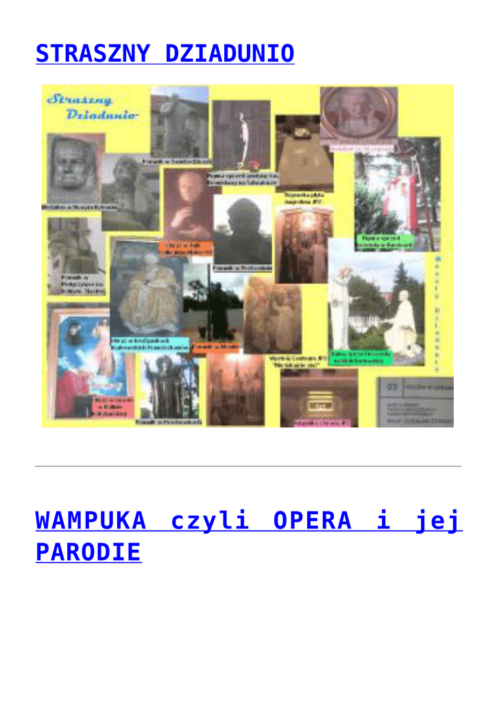 STRASZNY DZIADUNIO WAMPUKA PARODIE czyli OPERA i jej Lesław Czapliński „WAMPUKA czyli OPERA i jej PARODIE” 19 stycznia 1909 roku w awangardowym petersburskim teatrzyku, kierowanym przez wybitnego rosyjskiego eksperymentatora Nikołaja Jewreinowa, miała miejsce prapremiera „Wampuki czyli afrykańskiej narzeczonej, pod każdym względem wzorcowej opery” Władimira Ehrenberga, przez samego autora określonej jako parodia operowa w jednym akcie. On sam opracował też libretto, zainspirowany felietonem Anchara Mancepiłowa, pod którym to pseudonimem ukrywał się książę Michaił Wołkoński, a spektakl wyreżyserował Ungieri. W krzywym zwierciadle, jak nomen omen nazywała się scena, na której „Wampuka” ujrzała światła rampy, ukazywała ona pompatyczność i nonsensowność wielkich widowisk operowych w stylu „Afrykanki” Giacomo Meyerbeera czy „Aidy” Giuseppe Verdiego. Sam tytuł stanowił trawestację zwrotu, wielokrotnie powracającego w rosyjskim tłumaczeniu libretta „Roberta diabła” przywołanego Meyerbeera, a mianowicie „wam puk, wam puk cwietow podnosim” (Pęk kwiatów, pęk kwiatów ofiarujemy). Od tego czasu słowo „wampuka” zaczęło żyć własnym życiem i oznaczać w ogóle wszelkie teatralne sztampy (w języku rosyjskim utworzono nawet czasownik „wampuczit’” na określenie aktorskiej pretensjonalnościi minoderii), a w odniesieniu do opery jako rodzaju stało się synonimem anachroniczności jej martwych konwencji, co polski krytyk Mirosław Kondracki ujął aforystycznie, iż jest „wczorajszą muzyką w przedwczorajszym teatrze” (Ruch Muzyczny nr 27 z 1971 roku, s. 10). Chyba też nie przypadkiem, choć może nie do końca świadomie, w podtytule pojawiła się „afrykańska narzeczona”, albowiem pół wieku wcześniej, prezentowane przez amerykańskich komików – Francisa Leona i Edwina Kelly’ego – skecze, naśladujące istniejące operowe pierwowzory (np. „Lukrecja Borgia”, „Morderczy trubadur”), były przez nich określane jako „zafrykanizowane opery-buffa”. Leon, operujący falsetem sięgającym wysokich rejestrów i nazywany z tego powodu błazeńską „primadonną”, gdyż specjalizował się w rolach kobiecych, w spektaklu „Żelazne płuca” (Leatherlungs) imponował niezwykłą maestrią z jaką naśladował styl wykonawczy i sceniczne zachowania sławnej wówczas divy operowej – Jenny Lind. Rzecz jasna, wszyscy dotąd wymienieni nie byli pierwszymi, którzy wpadli na podobny pomysł. Już w 1853 roku w paryskim teatrze Palais Royal ujrzały światła rampy pięcioaktowe „Folies dramatiques” (Szaleństwa teatralne) Florimonda Rongera (lepiej znanego jako Hervé, poprzednika, a następnie wytrwałego konkurenta Offenbacha), w których każda część odnosiła się do innego gatunku scenicznego i związanych z nim konwencji, wyradzających się z czasem w nieznośne sztampy. Jedno z ogniw, zatytułowane „Gargouillada”, zainspirować miało księcia Charlesa de Morny (skądinąd przyrodniego brata Napoleona III i ministra spraw wewnętrznych), występującego pod pseudonimem Saint-Rémy, do ułożenia i prywatnego wystawienia 31 maja 1861 w Pałacu Burbońskim (siedzibie parlamentu) zabawnej 1 krotochwili „Pan Choufleuri przyjmuje” („Monsieur Choufleuri restera chez lui 24 janvier 1833), przerobionego następnie i udoskonalonego przez Jacques’a Offenbacha i po raz pierwszy zaprezentowanego publicznie tego samego roku 14 września w paryskim teatrze operetkowym BouffesParisiens. Wskazany w tytule czas akcji – 24 stycznia 1833 – apogeum powodzenia w Paryżu opery włoskiej w ogólności i Gaetano Donizettiegooraz Giuseppe Verdiego (tercet parodiujący finałowe concertato z II aktu „Trubadura”) w szczególności – podpowiedziały przedmiot zabiegów parodystycznych, aktualnych także dwadzieścia lat później w okresie prapremiery, albowiem pomiędzy rokiem 1801a 1878 działał nieprzerwanie w nadsekwańskiej stolicy Théâtre Italien, grającyw różnych budynkach i będący bądź to niezależną antrepryzą, bądź wchodzący w skład rządowych scen muzycznych (obok Opery i Opery Komicznej). Nowobogacki pan Wzdęcki z paryskiej dzielnicy Marais (dziewiętnastowieczne wcielenie Molièrowskiego pana Jourdaina) postanawia otworzyć własny salon. Wieczór inauguracyjny uświetnić mają gwiazdy ówczesnej wokalistyki: Henriette Sontag, Giovanni Battista Rubinii Antonio Tamburini, którzy w ostatniej chwili odwołują swój występ. Dla ratowania sytuacji nie pozostaje nic innego jak wcielić się w ich role córce gospodarza – Ernestynie – jej ukochanemu, ubogiemu muzykowi Babylasowi (w polskiej wersji Melchiorowi) i wreszcie samemu 2 Wzdęckiemu . W ich wykonaniu odegrana zostaje scena w stylu włoskiej opery belcantowej (tercet „Italia la bella”), stanowiąca zabawny melanż motywów melodycznych, wzorowanych na Bellinim, Donizettim i wczesnym Verdim, którym towarzyszy pseudowłoszczyzna tych domorosłych śpiewaków, żonglujących niedokładnie zapamiętanymi konwencjonalnymi zwrotami z librett czy zupełnie niedorzecznymi zbitkami w rodzaju: „La prima primadonna”, a wszystko to nakłada się na sytuację dramatyczną paralelną do rzeczywistej (ojciec zastaje córkę z kochankiem, na poślubienie którego nie chce wyrazić zgody). We wcześniejszym tercecie „Babylas! Babylas!” Offenbach przywołuje zaklęcie Bertrama, ożywiającego duchy potępionych mniszek z popularnej opery Meyerbeera „Robert diabeł”. Z kolei nawiązanie do „Hugenotów” tegoż autora – chorału „Seigneur, rempart et seul soutien” – daje znać o sobie w ustępie „Hosanna! Mort, je t’aime” z wcześniejszej jednoaktówki – „Bata-clan” (29 grudnia 1855) – określonej jako muzyczna chińszczyzna (tytuł odnosi się do wywrotowej pieśni spiskowców, którym przewodzi skądinąd dowódca gwardii Ko-ko-ri-ko, a strach przed jej zabójczymi dla wł