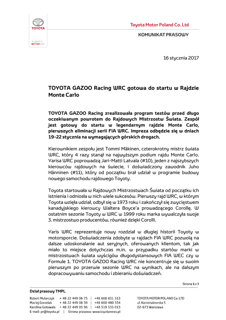 16 stycznia 2017 TOYOTA GAZOO Racing WRC gotowa do startu w Rajdzie Monte Carlo TOYOTA GAZOO Racing zrealizowała program testów przed długo oczekiwanym powrotem do Rajdowych Mistrzostw Świata. Zespół jest gotowy do startu w legendarnym rajdzie Monte Carlo, pierwszych eliminacji serii FIA WRC. Impreza odbędzie się w dniach 19-22 stycznia na wymagających górskich drogach. Kierownikiem zespołu jest Tommi Mäkinen, czterokrotny mistrz świata WRC, który 4 razy stanął na najwyższym podium rajdu Monte Carlo. Yarisa WRC poprowadzą Jari-Matti Latvala (#10), jeden z najszybszych kierowców rajdowych na świecie, i doświadczony zawodnik Juho Hänninen (#11), który od początku brał udział w programie budowy nowego samochodu rajdowego Toyoty. Toyota startowała w Rajdowych Mistrzostwach Świata od początku ich istnienia i odniosła w nich wiele sukcesów. Pierwszy rajd WRC, w którym Toyota wzięła udział, odbył się w 1973 roku i zakończył się zwycięstwem kanadyjskiego kierowcy Waltera Boyce’a prowadzącego Corollę. W ostatnim sezonie Toyoty w WRC w 1999 roku marka wywalczyła swoje 3. mistrzostwo producentów, również dzięki Corolli. Yaris WRC reprezentuje nowy rozdział w długiej historii Toyoty w motorsporcie. Doświadczenia zdobyte w rajdach FIA WRC pozwolą na dalsze udoskonalanie aut seryjnych, oferowanych klientom, tak jak miało to miejsce dotychczas m.in. w przypadku startów marki w mistrzostwach świata wyścigów długodystansowych FIA WEC czy w Formule 1. TOYOTA GAZOO Racing WRC nie koncentruje się w swoim pierwszym po przerwie sezonie WRC na wynikach, ale na dalszym dopracowywaniu samochodu i zbieraniu doświadczeń. Strona 1 z 3 Rajd Monte Carlo jest najstarszym rajdem na świecie – w tym roku odbędzie się jego 85. edycja. W rozpoczynającym się właśnie sezonie obowiązują nowe regulacje, których rezultatem są jeszcze szybsze, szersze i lżejsze samochody o bardziej spektakularnych osiągach. Rozpoczynający się w stolicy Księstwa Monako rajd o łącznej długości odcinków specjalnych poniżej 380 km nie jest najdłuższym rajdem FIA WRC, ale prawdopodobnie najtrudniejszym. Szybko zmieniająca się pogoda i zróżnicowanie nawierzchni sprawiają, że przygotowując samochód i dobierając opony trzeba iść na kompromisy, a rola załogi informującej na bieżąco o warunkach panujących na poszczególnych odcinkach staje się kluczowa. Uroczystość rozpoczęcia rajdu odbędzie się na Place du Casino w Monte Carlo w czwartek 19 stycznia o godzinie 18:11. Tego dnia zostaną rozegrane dwa nocne etapy w regionie Alpes-de-Haute-Provence, traktowane jako wymagający sprawdzian przed piątkowym etapem, najdłuższym w całym rajdzie (odcinki specjalne będą miały długość 160 km). W sobotę zawodnicy wystartują w okolicy Gap i dotrą do Breziers po pięciu górskich etapach. W niedzielę zawodnicy dwa razy pokonają wymagającą przełęcz Col de Turini. Ceremonia udekorowania zwycięzców odbędzie się przed Pałacem Książęcym w Monako o godzinie 15:00. „Najważniejszy na rajdzie Monte Carlo jest spokojny i otwarty umysł. Wyniki w tak dużym stopniu zależą od warunków na trasie, że sytuacja może się zmienić w ciągu sekundy. Trudno mi wypowiadać się w tej chwili na temat naszych szans w nadchodzącym sezonie, a rajd Monte Carlo także nie da nam definitywnej odpowiedzi, gdyż bardzo się różni od pozostałych eliminacji. Największym wyzwaniem był krótki czas na przygotowanie samochodu po ogłoszeniu nowych regulacji. Oczywiście wszystkie zespoły musiały zbudować w tym roku swoje samochody od samego początku, jednak nasi konkurenci mogli polegać na dotychczasowych doświadczeniach” – powiedział Tommi Mäkinen, kierownik zespołu. „Dwa miesiące temu nie przypuszczałem, że będę startował w Rajdzie Monte Carlo z Toyotą. Bardzo się cieszę, że dołączyłem do tego zespołu. Mam już za sobą 12 dni testów: dwa na śniegu, jeden na szutrze i siedem Strona 2 z 3 na asfalcie. To całkiem niezła ilość treningów, w tym czasie zrobiliśmy pewne postępy. Naszym zdaniem samochód jest bardzo mocny, jednak trudno przewidzieć, jak wypadnie w konkurencji z innymi, skoro wszystkie zespoły wystawiają nowe auta. W tym roku skupiamy się na udoskonalaniu samochodu i rozwijaniu naszych umiejętności. Chciałbym ukończyć rajd Monte Carlo z dobrym wynikiem, wtedy może w połowie sezonu będziemy mogli zacząć walczyć o podium. Monte Carlo jest tak nieprzewidywalnym rajdem, że nie jest rozsądnie wyznaczać sobie zbyt wiele celów. W 2015 roku nie miałem szczegółowego planu i dotarłem do mety jako drugi. Rok później nastawiałem się na podium, a skończyło się na dużym błędzie. Monte Carlo to dla każdego kierowcy ogromny stres ze względu na dużą złożoność, wiele niewiadomych i komplikacje przy wyborze opon. Jednak przekroczenie linii mety pod Pałacem Książęcym to jedno z najwspanialszych przeżyć” – skomentował Jari-Matti Latvala, startujący Yarisem WRC z numerem 10. Strona 3 z 3
