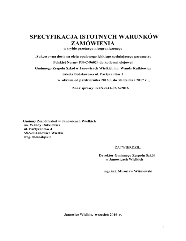 SPECYFIKACJA ISTOTNYCH WARUNKÓW ZAMÓWIENIA w trybie przetargu nieograniczonego „Sukcesywna dostawa oleju opałowego lekkiego spełniającego parametry Polskiej Normy PN-C-96024 do kotłowni olejowej Gminnego Zespołu Szkół w Janowicach Wielkich im. Wandy Rutkiewicz Szkoła Podstawowa ul. Partyzantów 1 w okresie od października 2016 r. do 30 czerwca 2017 r. „ Znak sprawy: GZS.2241-02/A/2016 Gminny Zespół Szkół w Janowicach Wielkich im. Wandy Rutkiewicz ul. Partyzantów 4 58-520 Janowice Wielkie woj. dolnośląskie ZATWIERDZIŁ: Dyrektor Gminnego Zespołu Szkół w Janowicach Wielkich mgr inż. Mirosław Wiśniewski Janowice Wielkie, wrzesień 2016 r. 1 NAZWA POSTĘPOWANIA Sukcesywna dostawa oleju opałowego lekkiego spełniającego parametry Polskiej Normy PN-C-96024 do kotłowni olejowej Gminnego Zespołu Szkół w Janowicach Wielkich im. Wandy Rutkiewicz Szkoła Podstawowa ul. Partyzantów 1 w okresie od października 2016 r. do 30 czerwca 2017 r. TRYB POSTĘPOWANIA Przetarg nieograniczony o wartości szacunkowej nie przekraczającej 209 tys. euro (art. 10 ust. 1 oraz art. 39 – 46 Prawo zamówień publicznych Dz. U. z 2015 r. poz. 2164 z późn. zm.) MIEJSCE I TERMIN SKŁADANIA I OTWARCIA OFERT Termin składania ofert – do dnia 28.09.2016 r. do godz. 10:00 Termin otwarcia ofert – dnia 28.09.2016 r. o godz. 10:30 Miejsce składania ofert: Gminny Zespół Szkół im. Wandy Rutkiewicz w Janowicach Wielkich ul. Partyzantów 4, 58-520 Janowice Wielkie sekretariat szkoły Miejsce otwarcia ofert: Gminny Zespół Szkół im. Wandy Rutkiewicz w Janowicach Wielkich ul. Partyzantów 4, 58-520 Janowice Wielkie pokój 302 /administracja szkoły/ 1. Nazwa (firma) oraz adres Zamawiającego Gminny Zespół Szkół im. Wandy Rutkiewicz w Janowicach Wielkich ul. Partyzantów 4 58-520 Janowice Wielkie tel. 75/7515277 fax 75/751277 www.gzsjanowicew.szkolnastrona.pl email: [email protected] Adres strony na której umieszczona jest Specyfikacja Istotnych Warunków Zamówienia: www. gmina.janowice.wielkie.sisco.info www.gzsjanowicew.szkolnastrona.pl 2. Tryb udzielenia zamówienia 2.1. Postępowanie prowadzone jest zgodnie z przepisami Ustawy z dnia 29 stycznia 2004 roku – Prawo zamówień publicznych (tekst jedn. – Dz. U. z 2015 r., poz. 2164 z późn. zm.), zwanej dalej „Pzp”. 2.2. Postępowanie prowadzone jest w trybie przetargu nieograniczonego (podst. prawna: art. 10 ust. 1 oraz art. 39-46 Pzp). 2.3. Do czynności podejmowanych przez Zamawiającego i Wykonawców stosować się będzie przepisy ustawy z dnia 23 kwietnia 1964 r. – Kodeks cywilny (tekst jedn. Dz. U. z 2016 r., poz. 380, z późn. zm.), jeżeli przepisy Pzp. nie stanowią inaczej. 2 3. Opis przedmiotu zamówienia Przedmiotem zamówienia jest: Sukcesywna dostawa oleju opałowego lekkiego spełniającego parametry Polskiej Normy PN-C-96024 do kotłowni olejowej Gminnego Zespołu Szkół w Janowicach Wielkich im. Wandy Rutkiewicz Szkoła Podstawowa ul. Partyzantów 1 w okresie od października 2016 r. do 30 czerwca 2017 r. w ilości ok. 12 000 litrów. Podane ilości oleju opałowego lekkiego są ilościami szacunkowymi i nie zobowiązują Zamawiającego do całkowitego ich zamówienia. Z tego tytułu Wykonawcy nie będą przysługiwały żadne roszczenia wobec Zamawiającego. 1) Przedmiot zamówienia obejmuje załadunek, transport do miejsca przeznaczenia oraz wyładunek oleju. Wykonawca będzie dostarczał olej opałowy, bez dodatkowych opłat, sukcesywnie: własnym środkiem transportu wyposażonym w legalizowany przyrząd pomiarowy do napełniania i opróżniania cysterny (legalizacja urządzeń pomiarowych z Urzędu Wag i Miar) w ilości jednorazowej ok. 4 000 litrów wraz ze świadectwem jakości opału wystawionym przez producenta – przy każdorazowej dostawie paliwa układ dróg dojazdowych i szerokość bram wjazdowych umożliwia dojazd cystern o pojemności około 20.000 litrów. 2) Wymagane parametry oleju opałowego: Olej barwiony Gęstość czerwony 0,840 g/m3 Wartość opałowa 42,5 do 46 MJ/kg Dopuszczalna zawartość siarki 0,10% (m/m) Temperatura płynięcia nie mniej niż -25˚C Kod CPV: CPV: 09135100-5 Olej opałowy Zamówienia, o których mowa w art. 67 ust. 1 pkt 7 Pzp. Zamawiający nie przewiduje możliwości udzielania zamówień, o których mowa w art. 67 ust. 1 pkt. 7 Pzp. 1) Ustalenia i decyzje dotyczące wykonywania zamówienia uzgadniane będą przez Zamawiającego z ustanowionym przedstawicielem Wykonawcy. 2) Wykonawca dostarczy przedmiot umowy własnym transportem, na własny koszt i na własne ryzyko do kotłowni olejowej Gminnego Zespołu Szkół w Janowicach Wielkich im. Wandy Rutkiewicz Szkoła Podstawowa ul. Partyzantów 1 3) Wykonawca odpowiedzialny będzie za jakość dostarczanego oleju opałowego w okresie wykonywania umowy. 4) Wymagana jest należyta staranność przy realizacji zamówienia. 3 5) Dostawy będą realizowane na podstawie zamówień składanych telefonicznie lub faksem. Dostawy będą realizowane przez dostawcę w dni powszednie do godz. 14,00. 6) Dowodem przyjęcia dostawy oleju opałowego będą faktury VAT oraz dokument WZ z wydrukiem ilości dostarczonego w temperaturze rzeczywistej oleju opałowego. 7) Podczas każdorazowej dostawy Wykonawca będzie zobowiązany dostarczyć świadectwo jakości dostarczonego oleju opałowego. 4. Opis sposobu przedstawiania ofert: 4.1. Zamawiający nie dopuszcza składania ofert częściowych. 4.2. Zamawiający nie dopuszcza składania ofert wariantowych. 4.3. Zamawiający nie przewiduje zamówień uzupełniających w postępowaniu. 4.4. Zamawiający nie dopuszcza udziału podwykonawców w wykonaniu zadania. 5. Termin wykonania zamówienia 5.1. W wyniku niniejszego postępowania zostanie zawarta umowa, która realizowana będzie sukcesywnie od dnia podpisania umowy do dnia 30 czerwca 2017 r. 6. Warunki udziału w postępowaniu: 6.1. O udzielenie zamówienia mogą się ubiegać Wykonawcy, którzy: 1) nie podlegają wykluczen