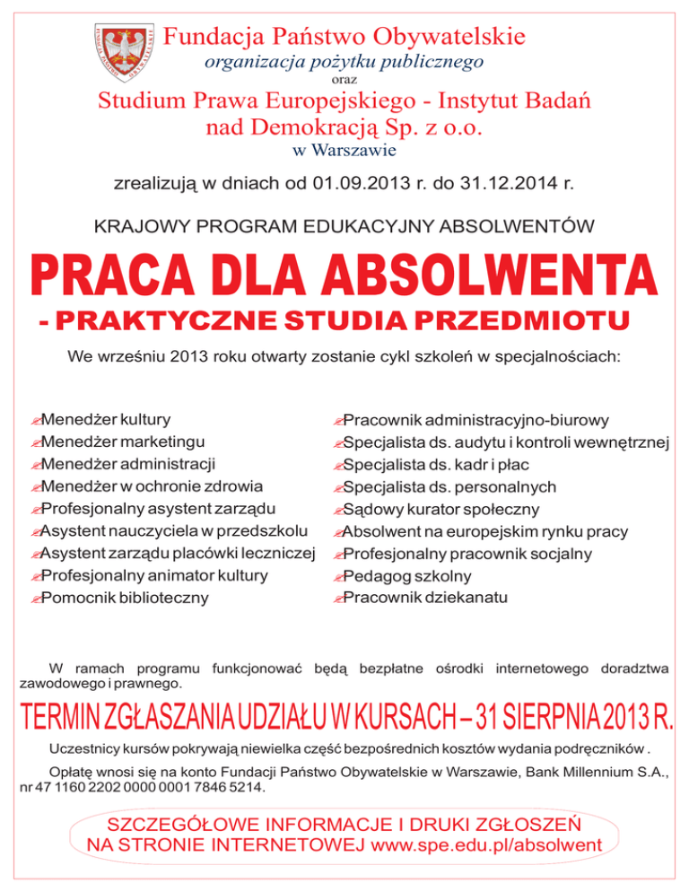 Fundacja Pañstwo Obywatelskie organizacja po¿ytku publicznego oraz Studium Prawa Europejskiego - Instytut Badañ nad Demokracj¹ Sp. z o.o. w Warszawie zrealizuj¹ w dniach od 01.09.2013 r. do 31.12.2014 r. KRAJOWY PROGRAM EDUKACYJNY ABSOLWENTÓW We wrzeœniu 2013 roku otwarty zostanie cykl szkoleñ w specjalnoœciach: ? Mened¿er kultury Mened¿er marketingu ? Mened¿er administracji ? Mened¿er w ochronie zdrowia ? Profesjonalny asystent zarz¹du ? Asystent nauczyciela w przedszkolu ? Asystent zarz¹du placówki leczniczej ? Profesjonalny animator kultury ? Pomocnik biblioteczny ? ? Pracownik administracyjno-biurowy ? Specjalista ds. audytu i kontroli wewnêtrznej ? Specjalista ds. kadr i p³ac ? Specjalista ds. personalnych ? S¹dowy kurator spo³eczny Absolwent na europejskim rynku pracy ? Profesjonalny pracownik socjalny ? Pedagog szkolny ? Pracownik dziekanatu ? W ramach programu funkcjonowaæ bêd¹ bezp³atne oœrodki internetowego doradztwa zawodowego i prawnego. Uczestnicy kursów pokrywaj¹ niewielka czêœæ bezpoœrednich kosztów wydania podrêczników . Op³atê wnosi siê na konto Fundacji Pañstwo Obywatelskie w Warszawie, Bank Millennium S.A., nr 47 1160 2202 0000 0001 7846 5214. SZCZEGÓ£OWE INFORMACJE I DRUKI ZG£OSZEÑ NA STRONIE INTERNETOWEJ www.spe.edu.pl/absolwent