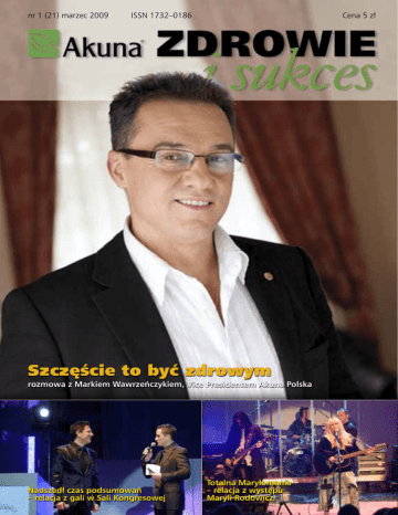 nr 1 (21) marzec 2009 ISSN 1732–0186 Cena 5 zł Szczęście to być zdrowym rozmowa z Markiem Wawrzeńczykiem, Vice Presidentem Akuna Polska Nadszedł czas podsumowań – relacja z gali w Sali Kongresowej Totalna Marylomania – relacja z występu Maryli Rodowicz W numerze 3 4 Słowo wstępne Zatrucie toksynami i oczyszczenie ustroju 8 Moc oczyszczania organizmu 10 12 14 16 18 20 22 24 26 30 32 38 40 42 44 46 50 52 53 54 56 58 mówi lek. med. Wojciech Urbaczka raport na temat zdolności organizmu do samoleczenia w ujęciu historycznym Życie usłane różami reportaż o rodzinie Bziuk 4 Zatrucie toksynami i oczyszczenie ustroju – mówi lek. med. Wojciech Urbaczka 24 Człowiek pełen życia – rozmowa z dr. n. med. Witoldem Furgałem 32 Przygotujmy się na boom – wykład Edwarda Ludbrooka Cywilizacja przemysłowa raport na temat toksyn we współczesnym świecie Medycyna ekologiczna raport na temat silnie rozwijającej się dyscypliny medycznej Niebezpieczne promienie słoneczne rozmowa z lek. med. Iwoną Jakubczak, dermatologiem Suplementy diety – co warto o nich wiedzieć raport o sposobach dożywiania organizmu Wiosną świat jest piękniejszy reportaż o rodzinie Dryllów Czysty umysł Magdalena Wdowiak pisze o sposobach oczyszczania umysłu Człowiek pełen życia rozmowa z dr. n. med. Witoldem Furgałem Szczęście to być zdrowym rozmowa z Markiem Wawrzeńczykiem, Vice Presidentem Akuna Polska Nadszedł czas podsumowań relacja z gali w Sali Kongresowej Przygotujmy się na boom wykład Edwarda Ludbrooka, stratega network marketingu Żyjemy raz, ale to wystarczy wykład Andrzeja Bizonia, Executive Director Akuna International Żeby korzystać, trzeba zapracować mówi Marcin Maciąg, Country Manager Akuna Polska Oni osiągnęli sukces tegoroczni nominowani Nowi w klubie wypowiedź Wiceprezesa Akuna Polska Bogusława Dudzika Nie trzeba znać wszystkich kroków wykład Jana Brykczyńskiego, Vice Presidenta Akuna Polska Od jutra zacznijcie działać wykład Tomasza Kwolka, Prezesa Akuna Polska Totalna Marylomania relacja z występu Maryli Rodowicz O sukcesie przy jazzie bankiet w Hotelu Polonia Palace Wiosenne porządki w organizmie porady zielarki Grażyny Utratnej Odchudzanie – nowa równowaga w organizmie porady dietetyczki Ewy Ceborskiej Biuro aktualności i informacje, nominacje Szanowni Państwo 44 Nowi w klubie – wypowiedź Wiceprezesa Bogusława Dudzika Kolejny sukces Barbary Prymakowskiej Nie dość, że uprawia narciarstwo zjazdowe, biegi maratońskie, jeździ na rolkach – jest też pasjonatką narciarstwa biegowego. Wiele razy brała udział w największym w kraju Biegu Piastów. W styczniu tego roku tarnowski „Sokół” postanowił urządzić wyprawę do Włoch, gdzie w dolinie Val di Fiemme odbył się rozgrywany w ramach Worldloppet (Światowa Liga Biegów Masowych) maraton narciarski Marcialonga. Przy finansowej pomocy Akuny kolejne sportowe marzenie Barbary Prymakowskiej spełniło się, wzięła w tych zmaganiach udział. Bieg odbył się na dystansie 45 km, start z Moeny, meta w Predazzo. Pierwsze 23 km – trudne warunki, ekstremalne podbiegi. Barbara Prymakowska nazwała ten kawałek trasy „swoim Mount Everestem”. W swojej kategorii wiekowej (jako jedyna Polka w tej kategorii) uzyskała bardzo wysoki wynik – dziewiąte miejsce. Barbara Prymakowska biegła z logo Akuny. Alveo pije regularnie, od czterech lat. Jedną miarkę dziennie. A tydzień przed zawodami sportowymi, głównie przed maratonami, wypija po dwie miarki. Tak było i podczas biegu we Włoszech. Mówi, że dzięki tym ziołom tętno szybciej wraca do normy. Pierwsze miesiące roku to dla nas zawsze wspaniały czas! Obchodzimy przecież nasze wielkie święto Your Akuna Day. A spotkanie to jest dla nas nie tylko okazją do podsumowań, ale też wejściem w nowy czas, wraz z wiosną. Tradycyjnie już nasz wielki zjazd odbył się w warszawskiej Sali Kongresowej, a było nas tak dużo, że obawiam się, czy następnym razem Sala Kongresowa tę naszą wielką akunową rodzinę pomieści. Ten wspaniały dzień przyjechali świętować z nami dr Jaromir Bertlik i dr Sohrab Khoshbin. Przywitano ich szczególnie serdecznie, bo też ich działania pomogły stanąć na nogi wielu ludziom, którzy mieli poważne kłopoty ze zdrowiem. Odwiedzili nas też Michael Forst i Rene Lelek – współzałożyciele firmy Akuna. Wysłuchaliśmy interesującego wykładu Edwarda Ludbrooka, specjalisty w zakresie MLM, autora książki „100% sukcesu”. Podzielił się z nami wiedzą na temat marketingu sieciowego. Według jego opinii tak naprawdę dopiero teraz zaczyna się dla Akuny dobry czas. A kryzys, który budzi przerażenie? Kryzys może tylko pomóc naszej branży. Był to też czas nominacji. Nagrody odebrały osoby nominowane na pozycje: Dyrektora Sieci Regionalnej, Krajowej i Międzynarodowej oraz Vice Presidenta. Zostali przedstawieni też członkowie Akuna VIP Club. To klub składający się z menedżerów mających największe doświadczenie, tych, którzy wspólnie z kierownictwem pracują nad rozwojem firmy. A firma nasza opracowała właśnie system motywacyjny, wspierający rozwój menedżerów na każdym ze stopni ich działalności. Przedstawił go Country Manager Marcin Maciąg. Owacjami na stojąco dziękowaliśmy za poruszający wykład Janowi Brykczyńskiemu. Impreza była ciepła i serdeczna, i pewnie długo będziemy ją wspominać. To też zasługa znakomitych prowadzących: Krzysztofa Ibisza i Piotra Bałtroczyka. Ale również pełnej temperamentu Maryli Rodowicz, z którą śpiewaliśmy jej stare, ale – jak się okazuje – wciąż młode przeboje. W numerze, który właśnie trafia do Państwa rąk rozpoczynamy cykl pod hasłem „Akuna Active Life”. To spotkania, które promują zdrowy styl życia. Zaprezentujemy serię artykułów połączonych z wykładami lekarzy i specjalistów. Na ostatniej stronie każdego numeru będzie reklama i zapowiedź tych wydarzeń. Sk