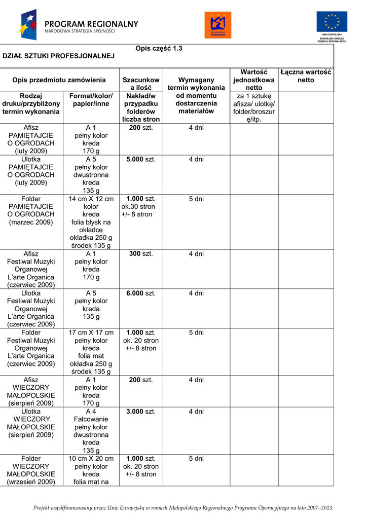 Opis część 1.3 DZIAŁ SZTUKI PROFESJONALNEJ Opis przedmiotu zamówienia Rodzaj druku/przybliŜony termin wykonania Format/kolor/ papier/inne Afisz PAMIĘTAJCIE O OGRODACH (luty 2009) Ulotka PAMIĘTAJCIE O OGRODACH (luty 2009) A1 pełny kolor kreda 170 g A5 pełny kolor dwustronna kreda 135 g 14 cm X 12 cm kolor kreda folia błysk na okładce okładka 250 g środek 135 g A1 pełny kolor kreda 170 g Folder PAMIĘTAJCIE O OGRODACH (marzec 2009) Afisz Festiwal Muzyki Organowej L’arte Organica (czerwiec 2009) Ulotka Festiwal Muzyki Organowej L’arte Organica (czerwiec 2009) Folder Festiwal Muzyki Organowej L’arte Organica (czerwiec 2009) Afisz WIECZORY MAŁOPOLSKIE (sierpień 2009) Ulotka WIECZORY MAŁOPOLSKIE (sierpień 2009) Folder WIECZORY MAŁOPOLSKIE (wrzesień 2009) Szacunkow a ilość Nakład/w przypadku folderów liczba stron 200 szt. Wymagany termin wykonania od momentu dostarczenia materiałów 5.000 szt. 4 dni 1.000 szt. ok.30 stron +/- 8 stron 5 dni Wartość Łączna wartość jednostkowa netto netto za 1 sztukę afisza/ ulotkę/ folder/broszur ę/itp. 4 dni 300 szt. 4 dni A5 pełny kolor kreda 135 g 6.000 szt. 4 dni 17 cm X 17 cm pełny kolor kreda folia mat okładka 250 g środek 135 g A1 pełny kolor kreda 170 g A4 Falcowanie pełny kolor dwustronna kreda 135 g 10 cm X 20 cm pełny kolor kreda folia mat na 1.000 szt. ok. 20 stron +/- 8 stron 5 dni 200 szt. 4 dni 3.000 szt. 4 dni 1.000 szt. ok. 20 stron +/- 8 stron 5 dni Projekt współfinansowany przez Unię Europejską w ramach Małopolskiego Regionalnego Programu Operacyjnego na lata 2007–2013. Afisz Sądecki Festiwal Muzyczny IUBILAEI CANTUS (październik 2009) Ulotka Sądecki Festiwal Muzyczny IUBILAEI CANTUS (październik 2009) okładce okładka 250 g środek 135 g A1 pełny kolor kreda 170 g 200 szt. 4.000 szt. A4 Falcowanie pełny kolor dwustronna kreda 135 g Folder 12,5 cm X 25 cm 1.200 szt. pełny kolor ok. 45 stron Sądecki Festiwal kreda +/- 8 stron Muzyczny IUBILAEI CANTUS folia mat na okładce (październik 2009) okładka 250 g środek 135 g 500 szt. Zaproszenie A 4 Bigowanie KONCERT do A 5 NOWOROCZNY pełny kolor (grudzień 2009) karton 225 g folia mat na stronie zewnętrznej 300 g 200 szt. Afisz A1 Festiwal Kolęd i pełny kolor Muzyki kreda BoŜonarodzeniowej 170 g WESOŁA NOWINA (grudzień 2009) 3.000 szt. Ulotka A4 Falcowanie Festiwal Kolęd i Muzyki pełny kolor dwustronna BoŜonarodzeniowej WESOŁA NOWINA kreda (grudzień 2009) 135 g 200 szt. Afisz A1 WIECZORY pełny kolor MAŁOPOLSKIE kreda (grudzień 2009) 135 g 3.000 szt. Ulotka A4 WIECZORY Falcowanie MAŁOPOLSKIE pełny kolor (grudzień 2009) dwustronna kreda 135 g 1.000 szt. Folder 10 cm X 20 cm pełny kolor ok. 20 stron WIECZORY kreda +/- 8 stron MAŁOPOLSKIE folia mat na (grudzień 2009) okładce 4 dni 4 dni 5 dni 3 dni 4 dni 4 dni 4 dni 4 dni 4 dni Projekt współfinansowany przez Unię Europejską w ramach Małopolskiego Regionalnego Programu Operacyjnego na lata 2007–2013. Afisz Festiwal Wirtuozerii i śartu Muzycznego FUN AND CLASSIC (styczeń 2010) Ulotka Festiwal Wirtuozerii i śartu Muzycznego FUN AND CLASSIC (styczeń 2010) Folder Festiwal Wirtuozerii i śartu Muzycznego FUN AND CLASSIC (styczeń 2010) okładka 250 g środek 135 g A1 pełny kolor kreda 170 g A4 Falcowanie pełny kolor dwustronna kreda 135 g 17 cm X 17 cm pełny kolor kreda folia mat na okładce okładka 250 g środek 135 g 200 szt. 4 dni 3.000 szt. 4 dni 1.000 szt. ok. 20 stron + /- 8 stron 5 dni Razem ………………. ………………… Projekt współfinansowany przez Unię Europejską w ramach Małopolskiego Regionalnego Programu Operacyjnego na lata 2007–2013.