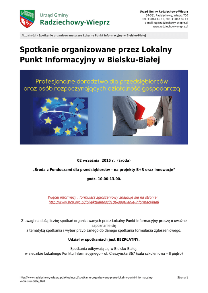 Urząd Gminy Radziechowy-Wieprz 34-381 Radziechowy, Wieprz 700 tel. 33 867 66 10, fax. 33 867 66 13 e-mail: [email protected] www.radziechowy-wieprz.pl Aktualności › Spotkanie organizowane przez Lokalny Punkt Informacyjny w Bielsku-Białej Spotkanie organizowane przez Lokalny Punkt Informacyjny w Bielsku-Białej 02 września 2015 r. (środa) „Środa z Funduszami dla przedsiębiorstw – na projekty B+R oraz innowacje” godz. 10.00-13.00. Więcej informacji i formularz zgłoszeniowy znajduje się na stronie: http://www.bcp.org.pl/lpi-aktualnosci/106-spotkanie-informacyjne8 Z uwagi na dużą liczbę spotkań organizowanych przez Lokalny Punkt Informacyjny proszę o uważne zapoznanie się z tematyką spotkania i wybór przypisanego do danego spotkania formularza zgłoszeniowego. Udział w spotkaniach jest BEZPŁATNY. Spotkania odbywają się w Bielsku-Białej, w siedzibie Lokalnego Punktu Informacyjnego – ul. Cieszyńska 367 (sala szkoleniowa – II piętro) http://www.radziechowy-wieprz.pl/aktualnosci/spotkanie-organizowane-przez-lokalny-punkt-informacyjnyw-bielsku-bialej,820 Strona 1