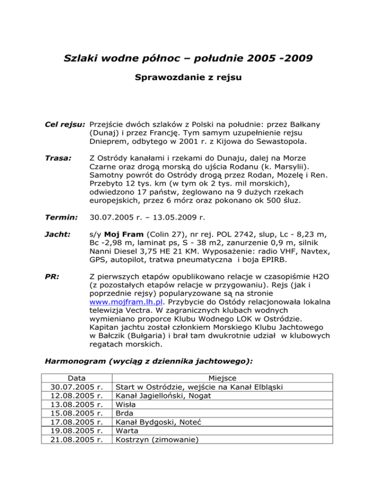 Szlaki wodne północ – południe 2005 -2009 Sprawozdanie z rejsu Cel rejsu: Przejście dwóch szlaków z Polski na południe: przez Bałkany (Dunaj) i przez Francję. Tym samym uzupełnienie rejsu Dnieprem, odbytego w 2001 r. z Kijowa do Sewastopola. Trasa: Z Ostródy kanałami i rzekami do Dunaju, dalej na Morze Czarne oraz drogą morską do ujścia Rodanu (k. Marsylii). Samotny powrót do Ostródy drogą przez Rodan, Mozelę i Ren. Przebyto 12 tys. km (w tym ok 2 tys. mil morskich), odwiedzono 17 państw, żeglowano na 9 dużych rzekach europejskich, przez 6 mórz oraz pokonano ok 500 śluz. Termin: 30.07.2005 r. – 13.05.2009 r. Jacht: s/y Moj Fram (Colin 27), nr rej. POL 2742, slup, Lc - 8,23 m, Bc -2,98 m, laminat ps, S - 38 m2, zanurzenie 0,9 m, silnik Nanni Diesel 3,75 HE 21 KM. Wyposażenie: radio VHF, Navtex, GPS, autopilot, tratwa pneumatyczna i boja EPIRB. PR: Z pierwszych etapów opublikowano relacje w czasopiśmie H2O (z pozostałych etapów relacje w przygowaniu). Rejs (jak i poprzednie rejsy) popularyzowane są na stronie www.mojfram.lh.pl. Przybycie do Ostódy relacjonowała lokalna telewizja Vectra. W zagranicznych klubach wodnych wymieniano proporce Klubu Wodnego LOK w Ostródzie. Kapitan jachtu został członkiem Morskiego Klubu Jachtowego w Bałczik (Bułgaria) i brał tam dwukrotnie udział w klubowych regatach morskich. Harmonogram (wyciąg z dziennika jachtowego): Data 30.07.2005 12.08.2005 13.08.2005 15.08.2005 17.08.2005 19.08.2005 21.08.2005 r. r. r. r. r. r. r. Miejsce Start w Ostródzie, wejście na Kanał Elbląski Kanał Jagielloński, Nogat Wisła Brda Kanał Bydgoski, Noteć Warta Kostrzyn (zimowanie) 30.05.2006 r. 13.06.2006 r. 14.06.2006 r. 21.06.2006 r. 01.07.2006 r. 02.07.2006 r. 11.07.2006 r. 02.08.2006 r. 03.05.2007 r. 03.07.2007 r. 05.07.2007 r. 12.07.2007 r. 13.07.2007 r. 20.07.2007 r 22.03.2008 r. 02.04.2008 r. 09.04.2008 r. 14.04.2008 r. 02.05.2008 r. 13.05.2008 r. 31.05.2008 r. 01.06.2008 r. 19.06.2008 r. 22.06.2008 r. 23.06.2008 r. 26.06.2008 r. 26.03.2009 r. 02.04.2009 r. 09.04.2009 r. 14.04.2009 r. 21.04.2009 r. 22.04.2009 r. 03.05.2009 r. 09.05.2009 r. 11.05.2009 r. 13.05.2009 r. Trudności: Odra, kanały niemieckie (przez Hohensaaten) Ren (w Wesel) Kanał Ren (Waal) – Moza, Moza Kanały francuskie (przez Nancy i Strasbourg) Ren (w Strasbourg) Men, kanał Men - Dunaj Dunaj Baja (Węgry), zimowanie Dunaj, kontynuacja rejsu Ujście Dunaju do Morza Czarnego (Sulina) Powrót Dunajem w kierunku kanału Cernovoda Kanał Cerovoda Morze Czarne (Konstanca) Bałczik (Bułgaria), zimowanie Morze Czarne, kontynuacja rejsu Bosfor, Morze Marmara Dardanele Morze Egejski Kanał Koryncki Morze Jońskie Cieśnina Messyńska Morze Tyrreńskie Morze Liguryjskie Cap Corse Zatoka Lwa Port St. Luis du Rhone, zimowanie Wejście na Rodan Saona Kanał des Vosges Mozela Ren (w Koblencji) Kanały niemieckie (do Odry przez Eisenhuettenstadt) Odra, Warta, Noteć Wisła, Nogat Kanały Jagielloński i Elbląski Ostróda, Klub Wodny LOK. Koniec rejsu. 1. Oba etapy przez Polskę (Ostróda – Kostrzyn) charakteryzowały się niskimi stanami wód (szczególnie na Wiśle) i utrudnieniami spowodowanymi roślinnością podwodną (szczególnie na Noteci). Zaliczono5 wejść na mieliznę na Wiśle (na szlaku żeglownym). 2. W Niemczech problemem jest pokonanie Renu. Odcinkami występuje prąd dochodzący do 10 km/h, silne zafalowanie i bardzo duży ruch zawodowy (szczególnie między Duisburgiem a Rotterdamem). Stąd też w drodze do Menu wybrano wariant przez Mozę, pozwalający na uniknięcie poruszania się w górę Renu. 3. Cechą charakterystyczną kanałów francuskich jest bardzo duża ilość śluz automatycznych, na dodatek niezbyt przyjemnych przy śluzowaniu się w górę (silne zawirowania w komorze). 4. Dunaj nie sprawiał większych problemów, poza wystąpieniem w lecie niskich stanów wód (począwszy od Węgier) i dwukrotnie wiatru 7 - 8 Bf. 5. Etap morski przebiegał w dużej części akwenami rzadko uczęszczanymi przez jachty (Morze Czarne, północna część Morza Egejskiego, zachodnia część Morza Jońskiego). Na akwenach tych słabo rozwinięta jest infrastuktura żeglarska, występują niekorzystne zjawiska atmosferyczne. Na dodatek etap ten zrealizowano na wiosnę (marzec – czerwiec), mając 80% wiatrów przeciwnych, 5 – 9 Bf. Zaliczono udane przejście Cap Corse (w przypadku nagłego pojawienia się silnego Mistralu akwen ten uchodzi za bardzo niebezpieczny). Prognozy pogody (Navtex i VHF) sprawdzały się na pokonywanych akwenach co najwyżej na ok 4 h do przodu. 6. Powrót do Polski z Morza Śródziemnego odbył się z jednoosobową obsadą. Dużą trudność stanowi silny prąd na Rodanie. W kanałach podejściowych do 13 śluz (położonych obok elektrowni wodnych), o długości od 2 do14 km, występował przy średniej wodzie prąd do 12 km/h. Podejście do śluz możliwe było tylko przez obszar zawirowań, 2 – 3 m od brzegu. Uwagi końcowe: W trakcie rejsu nie odnotowano żadnych sytuacji nadzwyczajnych lub awarii jachtu czy silnika (nie licząc czterokrotnego zablokowania wału napędowego przez dryfujące kawałki lin i sieci oraz pięciokrotnego wejścia na mielizny na Wiśle, na szlaku żeglownym). Grzegorz Raciborski s/y Moj Fram