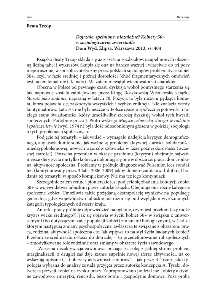 264 Recenzje Beata Trzop Dojrzałe, spełnione, niezależne? Kobiety 50+ w socjologicznym zwierciadle Dom Wyd. Elipsa, Warszawa 2013, ss. 404 Książka Beaty Trzop składa się aż z sześciu rozdziałów, uzupełnionych obszerną liczbą tabel i wykresów. Skupia się ona na bardzo ważnej i właściwie do tej pory nieporuszonej w sposób syntetyczny przez polskich socjologów problematyce kobiet 50+, czyli w fazie średniej i późnej dorosłości (choć fragmentarycznych omówień jest na ten temat nie tak mało). Ma zatem niewątpliwie nowatorski charakter. Obecna w Polsce od pewnego czasu dyskusja wokół pomyślnego starzenia się tak naprawdę została zainicjowana przez Kingę Roszkowską-Wiśniewską książką Starość jako zadanie, napisaną w latach 70. Pozycja ta była niczym pędząca kometa, która pojawiła się, zaskoczyła wszystkich i szybko zniknęła. Nie znalazła wtedy kontynuatorów. Lata 70. nie były jeszcze w Polsce czasem społecznej gotowości i takiego stanu świadomości, który umożliwiłby szeroką dyskusję wokół tych kwestii społecznych. Podobnie praca J. Piotrowskiego Miejsce człowieka starego w rodzinie i społeczeństwie (wyd. 1974 r.) była dość odosobnionym głosem w polskiej socjologii o tych problemach społecznych. Podjęcie tej tematyki – jak widać – wymagało nadejścia kryzysu demograficznego, aby uświadomić sobie, jak ważne są problemy aktywnej starości, solidarności międzypokoleniowej, nowych wzorców człowieka w fazie późnej dorosłości (wczesnej starości). Potrzeba przemian w okresie przełomu (kryzysu) obejmuje najważniejsze sfery życia nie tylko kobiet, a dokonują się one w obszarze: praca, dom, rodzina, aktywność społeczna. Problemy te próbuje diagnozować Polsenior, lecz sondaż ten (kontynuowany przez 3 lata: 2006-2009) jakby dopiero zainicjował-dotknął badania tej tematyki w sposób kompleksowy. Nie ma też jego kontynuacji. Szczególnie zatem cenne i pionierskie jest podjęcie się zbadania kondycji kobiet 50+ w województwie lubuskim przez autorkę książki. Obejmuje ona różne kategorie społeczne kobiet. Umożliwia także pożądaną ekstrapolację wyników na populację generalną, gdyż województwo lubuskie nie różni się pod względem wyróżnionych kategorii typologicznych od reszty kraju. Autorka pracy próbuje odpowiedzieć na pytanie, czym jest przełom (czy może kryzys wieku średniego?), jak się objawia w życiu kobiet 50+ w związku z uniwersalnymi (bo dotyczącymi całej populacji kobiet) zmianami biologicznymi, w ślad za którymi następują zmiany psychospołeczne, zwłaszcza te związane z obszarem: praca, rodzina, aktywność społeczna etc. Jak wpływa to na styl życia badanych kobiet? Przełom ze średniej dorosłości do dojrzałej – to przedefiniowanie ról społecznych – zmodyfikowane role rodzinne oraz zmiany w obszarze życia zawodowego. „Wczesna dezaktywacja zawodowa pociąga za sobą z jednej strony problem marginalizacji, z drugiej zaś daje szanse zupełnie nowej sferze aktywności, na co wskazują opisane (…) obszary aktywności seniorów” – jak pisze B. Trzop. Jako typologia wybrana do analizy została przyjęta przez autorkę koncepcja A. Tyszki, dotycząca pozycji kobiet na rynku pracy. Zaproponowano podział na: kobiety aktywne zawodowo, emerytki, rencistki, bezrobotne i gospodynie domowe. Poza próbą Recenzje 265 wyróżnienia ze zgromadzonego materiału badawczego o charakterze jakościowym (opisy życia według przyjętego planu) konkretnych przykładów mieszczących się w charakterystyce przyjętych kategorii, celem nadrzędnym było uzyskanie odpowiedzi, czy wśród zgromadzonych opowieści kobiet dojrzałych będzie można wyodrębnić typy (z ich konkretną ilustracją w postaci opowieści) najbardziej pożądane z perspektywy aktywnego starzenia się – zarówno w wymiarze jednostkowym, jak i najbardziej pożądane w kontekście społeczeństwa starzejącego się. Jak zatem z tej perspektywy wygląda tożsamość kobiety dojrzałej, między innymi w kontekście ról społecznych? W badaniach – celem odpowiedzi na to pytanie – została zastosowana metoda biograficzna. Przechodząc do kwestii najważniejszej – czyli operacjonalizacji badań – uważam, że narzędzia badawcze zostały skonstruowane prawidłowo. Najważniejsze cechy badanych respondentek odnoszą się do sfery: zawodowej, małżeńsko-rodzinnej, kondycji zdrowotnej, czasu wolnego, mody i urody oraz działalności społecznej. Próba 168 kobiet jest bardzo dużą próbą w badaniach jakościowych. Jak wskazuje autorka, kobiety w województwie lubuskim w tej kohorcie wiekowej (w województwie zamieszkanym przez 1 022 800 osób według spisu powszechnego z 2011 roku) stanowią 11,63% mieszkańców województwa. Według danych statystycznych – mężatki stanowią tam prawie 70%, lecz także duża jest grupa rozwódek i wdów (stanowią one prawie ¼ badanej populacji). Spotkanie autorki książki z kobietami 50+ przerodziło się w poznanie. Poznanie to wyraża się na różnych poziomach. Dotyczy to między innymi tak ważnych spraw, jak: cechy społeczno-demograficzne kobiet 50+ w świetle przynależności do typu zbiorowości terytorialnej, sytuacja respondentek na rynku pracy, tylko 20% z nich jest aktywne zawodowo w pełnym wymiarze, w niepełnym – znikomy odsetek, podobnie wygląda sytuacja w zakresie prac dorywczych, większość pobiera emerytury lub renty. Koncentracja autorki zwłaszcza na rolach rodzinnych kobiet w tej sytuacji nie dziwi, choć jednocześnie stosunek do pracy zawodowej respondentek jest zdecydowanie pozytywny. Jednocześnie zaskakująco duży odsetek kobiet jest przeciwnego zdania (prawie 30% respondentek). Żywe jest poczucie wśród badanych jako niezastąpionych menedżerek życia rodzinnego (bez snu, obładowane siatkami, bez niczyjej pomocy…). Te fakty wymagałyby znacznego pogłębienia, gdyż zostały pozostawione bez wysta