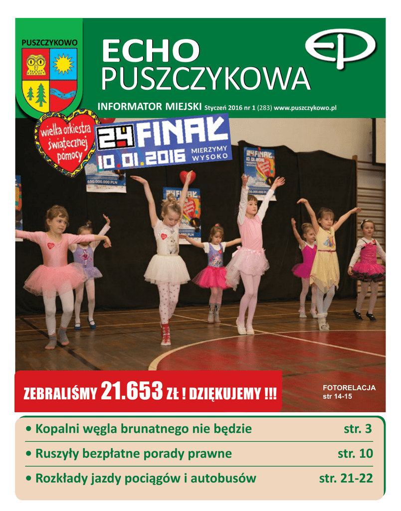 PUSZCZYKOWO ECHO PUSZCZYKOWA INFORMATOR MIEJSKI Styczeń 2016 nr 1 (283) www.puszczykowo.pl ZEBRALIŚMY 21.653 ZŁ ! DZIĘKUJEMY !!! • Kopalni węgla brunatnego nie będzie • Ruszyły bezpłatne porady prawne • Rozkłady jazdy pociągów i autobusów FOTORELACJA str 14-15 str. 3 str. 10 str. 21-22 INFORMACJE KOPALNI WĘGLA BRUNATNEGO NIE BĘDZIE W idmo uruchomienia kopalni odkrywkowej węgla brunatnego w tzw. Rowie Poznańskim, na terenie którego leżą m.in. Górne Puszczykowo, Mosina, Czempiń, Krzywiń, Gostyń, a także Wielkopolski Park Narodowy oraz ujęcia wody dla aglomeracji poznańskiej spędzało sen z powiek tysiącom mieszkańców. Zamieszanie zaczęło się po opublikowaniu - w listopadzie 2015 r. - przez Ministerstwo Środowiska „Białej Księgi Ochrony Złóż Kopalin”. W dokumencie znalazł się m.in. wykaz strategicznych pokładów węgla brunatnego w kraju. Zgodnie z zapisami, tereny z węglowymi pokładami miały zostać objęte ochroną. Gdyby zapisy weszły w życie oznaczałoby to m.in. ograniczenia w budownictwie i inwestycjach, a w przyszłości również uproszczoną procedurę wywłaszczeniową. Publikacja „Białej Księgi” była tym większym szokiem, że pomysł budowy kopalni upadł już w latach 70. Na szczęście jeszcze przed ubiegłorocznymi świętami Bożego Narodzenia rząd wycofał się z planów. Gigantyczna kopalnia odkrywkowa To, co zagrażało, nie tylko naszemu miastu, to pokłady węgla brunatnego ciągnące się od Puszczykowa przez Mosinę, po Gostyń, czyli tzw. Rów Poznański o długości ok. 50-kilometrów. W 1979 roku przygotowano opracowanie ilustrujące przyszłą kopalnię. Wykopy miały rozpocząć się w okolicy Czempinia, który miał zniknąć z mapy Polski. Inwestycja wchodziłaby na teren Mosiny i Puszczykowa oraz przechodziłaby przez Wielkopolski Park Narodowy. Jakby tego było mało, kopalnia z wykopami sięgającymi ok. 250 m w głąb ziemi stworzyłaby olbrzymi lej depresyjny, do którego spłynęłaby woda pitna z ujęcia dla całej poznańskiej aglomeracji. A to właśnie ze złóż w Mosinie, pochodzi ok. 70 proc. życiodajnego płynu, który dociera dziś do naszych domów. Podczas debaty, która na przełomie listopada i grudnia przetoczyła się przez lokalne media, geolog prof. Jan Przybyłek ostrzegał, że kopalnia mogłaby „wysuszyć” studnie nawet w promieniu 40 km od niej i zaburzyć gospodarkę wodną w okolicy. Na koniec, o czym „Biała księga” milczała, uruchomienie kopalni węgla brunatnego oznaczałoby także powstawanie elektrowni podobnych do tych w Bełchatowie. Oprócz katastrofy ekologicznej kopalnia oznaczałaby także gigantyczne straty samorządów leżących na terenach objętych tą inwestycją - gminy zostałyby zmuszone do wypłat horrendalnych odszkodowań, wynikających z konieczności wprowadzenia zmian do planów zagospodarowania przestrzennego. Tereny inwestycyjne zamieniłyby się przecież w nieużytki, co jest równoznaczne ze stratą dla ich właścicieli. Wspólny protest Niemal natychmiast po publikacji „Białej księgi” (do 15 grudnia 2015 r.) mieszkańcy wysłali do Ministerstwa Środowiska tysiące maili z kategorycznym sprzeciwem przeciwko zapisom „Białej Księgi”. List z protestem wysłał także burmistrz Andrzej Balcerek. Napisał w nim m.in.: że planowana ochrona złoża węgla brunatnego położonego w Wielkopolsce w obrębie ww. gmin jednoznacznie negatywnie wpłynie na jakość życia na obszarze środkowej Wielkopolski. Sprzeciw wyrazili także radni z Puszczykowa, którzy przygotowali specjalny apel. Protestowali także radni z Mosiny, Prewww.puszczykowo.pl zydent Poznania oraz Aquanet. Przedstawiciele samorządu Puszczykowa uczestniczyli także w wielu spotkaniach poświęconych temu problemowi oraz wyrażali swój sprzeciw w wypowiedziach udzielanych mediom. Główny geolog uspokaja Dopiero 16 grudnia 2015 r. na stronie Ministerstwa Środowiska pojawiła się informacja, że „Biała Księga Ochrony Złóż Kopalin”, była w zamierzeniach poprzedniego rządu, wykazem strategicznej bazy geologiczno-surowcowej, a Główny Geolog Kraju prof. Orion Jędrysek stwierdził w Sejmie, że prace nad tym dokumentem nie będą kontynuowane (potwierdził to 15 stycznia br. w oficjalnym komunikacie o zakończeniu konsultacji opublikowanym na stronie Ministerstwa Środowiska). – Ten dokument nie ma wartości merytorycznej i jest wadliwy metodycznie. Jest szkodliwy dla planowania przestrzennego i nieuzasadnionych zmian wartości nieruchomości. W wykazie są niemal tylko złoża udokumentowane kilkadziesiąt lat temu. Skutek – wielu cennych kopalin nie zauważono i nawet ich wycena nie jest możliwa. Wykaz złóż zaliczonych do strategicznych został sporządzony na podstawie analizy 249 udokumentowanych, ale jeszcze niezagospodarowanych złóż. Podział na kategorie jest niezrozumiały, niepoparty rzetelną analizą wartości ekonomicznej, geopolitycznej i tym podobnych kryteriów – wyjaśniał w Sejmie O. Jędrysek. Z wyjaśnień wynika, że już 25 listopada 2015 r. (zaraz po objęciu funkcji sekretarza stanu, Głównego Geologa Kraju) O. Jędrysek wycofał dokument z konsultacji międzyresortowych – nie przerwał jednak konsultacji społecznych, gdyż były już one w toku, a ponadto chciał dać możliwość wypowiedzenia się wszystkim zainteresowanym stronom. Z przesłanej korespondencji (do Ministerstwa wpłynęło ok. 8000 pism, w tym pokaźna grupa z Puszczykowa) wynika jednak, że zdecydowana większość uwag wobec „Białej Księgi” jest krytyczna. Red Andrzej Balcerek Burmistrz Puszczykowa Dziękuję wszystkim mieszkańcom Puszczykowa, którzy aktywnie włączyli się w akcję protestacyjną przeciwko zapisom „Białej Księgi”. Z wielką ulgą przyjąłem zapewnienia głównego geologa kraju prof. O. Jędryska o odstąpieniu rządu od tego projektu i mam nadzieję, że to naprawdę zamknięta sprawa – chociaż do Pu