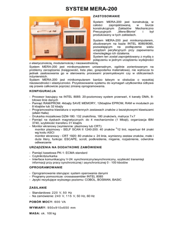 SYSTEM MERA-200 ZASTOSOWANIE System MERA-200 jest konstrukcją w całości zaprojektowaną w biurze konstrukcyjnym Zakładów Mechaniczno Precyzyjnych „Mera-Błonie” i był produkowany w tych zakładach. System MERA-200 jest minikomputerem, zbudowanym na bazie INTEL 8080/8085, pozwalającym na podłączenie wielu urządzeń peryferyjnych przy zapewnieniu równoległego ich działania. System ten został zaprojektowany z myślą o połączeniu w jednym urządzeniu wydajności z elastycznością, modularnością i niezawodnością. System MERA-200 jest minikomputerem uniwersalnym, ogólnie zorientowanym na problemy zarządzania (księgowość, lista płac, gospodarka materiałowa), nie wyklucza to jednak zastosowania go w sterowaniu procesami przemysłowymi czy w obliczeniach inżynierskich. System MERA-200 jest minikomputerem bardzo łatwym w obsłudze o wysokiej niezawodności i elastyczności. Przystosowanie systemu do wymagań użytkownika odbywa się prawie całkowicie poprzez zmianę oprogramowania. KONFIGURACJA - Procesor bazujący na INTEL 8085: 20-poziomowy system przerwań, 4 kanały DMA, 8bitowe linie danych - Pamięć RAM/PROM: 4kbajty SAVE MEMORY, 12kbajtów EPROM, RAM w modułach po 8 kbajtów lub 32 kbajty - Programowalna klawiatura o wymiennych zestawach znaków z bezstykowymi klawiszami (efekt Halla) - Drukarka mozaikowa DZM-180: 132 znaki/linia, 180 znaków/s, matryca 7x 7 - Pamięć na dyskach magnetycznych: do 4 mechanizmów (1 Mbajt), organizacja IBM 3740, szybkkość transferu 31 kbajt/s - Monitor ekranowy (wymiennie: plazmowy lub CRT): X monitor plazmowy - SELF SCAN II 1240-200: 40 znaków 12 linii, repertuar 64 znaki wg kodu ASCI monitor ekranowy - CRT 1920: 80 znaków x 24 linie, wymienny zestaw znaków, małe i duże litery, funkcje: ESCAPE, scroll, podkreślenie, miganie, rozjaśnienie, odwrotne odtwarzanie URZĄDZENIA NA DODATKOWE ZAMÓWIENIE - Pamięć kasetowa PK-1: ECMA standard - Czytnik/dziurkarka - Interface komunikacyjny V-24: synchroniczny/asynchroniczny, szybkość transmisji informacji przy pracy synchronicznej i asynchronicznej 0 - 100 kbodów OPROGRAMOWANIE - Oprogramowanie sterujące: system operowania danymi - Programy pomocnicze: crossassembler INTEL 8085 - Języki rezydujące wyższego poziomu: COBOL, BOSMAN, BASIC ZASILANIE - Standardowe: 2 20 V, 50 Hz - Na zamówienie: 24 0 V, 1 1 5 V, 50 Hz, 60 Hz POBÓR MOCY: 60 0 VA WYMIARY: 9 50x 9 10x 6 50 mm MASA: ok. 100 kg