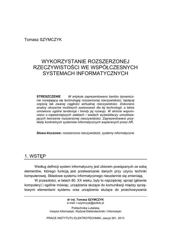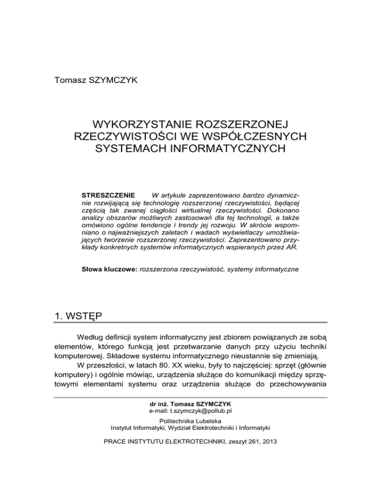 Tomasz SZYMCZYK WYKORZYSTANIE ROZSZERZONEJ RZECZYWISTOŚCI WE WSPÓŁCZESNYCH SYSTEMACH INFORMATYCZNYCH STRESZCZENIE W artykule zaprezentowano bardzo dynamicznie rozwijającą się technologię rozszerzonej rzeczywistości, będącej częścią tak zwanej ciągłości wirtualnej rzeczywistości. Dokonano analizy obszarów możliwych zastosowań dla tej technologii, a także omówiono ogólne tendencje i trendy jej rozwoju. W skrócie wspomniano o najważniejszych zaletach i wadach wyświetlaczy umożliwiających tworzenie rozszerzonej rzeczywistości. Zaprezentowano przykłady konkretnych systemów informatycznych wspieranych przez AR. Słowa kluczowe: rozszerzona rzeczywistość, systemy informatyczne 1. WSTĘP Według definicji system informatyczny jest zbiorem powiązanych ze sobą elementów, którego funkcją jest przetwarzanie danych przy użyciu techniki komputerowej. Składowe systemu informatycznego nieustannie się zmieniają. W przeszłości, w latach 80. XX wieku, były to najczęściej: sprzęt (głównie komputery) i ogólnie mówiąc, urządzenia służące do komunikacji między sprzętowymi elementami systemu oraz urządzenia służące do przechowywania dr inż. Tomasz SZYMCZYK e-mail: [email protected] Politechnika Lubelska Instytut Informatyki, Wydział Elektrotechniki i Informatyki PRACE INSTYTUTU ELEKTROTECHNIKI, zeszyt 261, 2013 28 T. Szymczyk danych, a także proste urządzenia służące do komunikacji między ludźmi a komputerami. Tymi ostatnimi były najczęściej klawiatury i myszy komputerowe. Wraz z rozwojem, miniaturyzacją i wzrostem wydajności elementów elektronicznych, do składowych systemu zaczęły dołączać inne elementy. Listę tę otwierają urządzenia służące do odbierania danych ze świata zewnętrznego, np. czujniki elektroniczne, kamery, skanery, urządzenia typu RFID (ang. Radio-frequency identification). Dzięki nim systemy informatyczne ewoluowały i możliwe stało się ich użytkowanie w nowych dziedzinach egzystencji ludzkiej, np. pojawiły się systemy kontroli dostępu i czasu pracy. Inżynierowie dodawali coraz to nowsze urządzenia, tym razem działające w odwrotnym kierunku: służące do wywierania wpływu przez systemy informatyczne na świat zewnętrzny. Należy tu wspomnieć o silnikach sterowanych komputerowo, wszelkiego rodzaju sterownikach urządzeń mechanicznych, robotach przemysłowych. Obecnie wiele systemów informatycznych dodatkowo analizuje dane. Szereg zastosowań jest wspieranych przez sztuczną inteligencję. System taki nie tylko w bezbłędny sposób je przetwarza, agreguje dane, ale jest w stanie je także automatycznie analizować. Systemy informatyczne stosowane np. w handlu poza gromadzeniem danych do tzw. hurtowni danych, wyposażone zostają coraz częściej w moduły do rozpoznawania obrazów. Dzięki temu wzrasta realna szybkość wprowadzania do nich danych. W SI pojawia się w ostatnich latach jeszcze jeden nowatorski i ciekawy element – rozszerzona rzeczywistość (ang. Augmented Reality). Wywodzi się ona z tzw. mieszanej rzeczywistości [13]. 2. CIĄGŁOŚĆ RZECZYWISTOŚCI W 1994 roku Paul Miligram i Fumio Kishino opracowali schemat ciągłości wirtualnej rzeczywistości (ang. Virtual Continuum). Relacje pomiędzy tymi sferami można zaobserwować na rysunku 1. Rys. 1. Schemat ciągłości rzeczywistości opracowany przez Paula Miligram i Fumio Kishino Wykorzystanie rozszerzonej rzeczywistości we współczesnych systemach… 29 Jeśli jeden z końców osi przyjmujemy za środowisko rzeczywiste, a drugi za środowisko wirtualne, wtedy Augmented Reality umiejscowiona jest na schemacie tuż przy środowisku rzeczywistym. Im bliżej systemowi do wirtualnej rzeczywistości, tym bardziej zredukowana jest liczba elementów rzeczywistych [7]. Rys. 2. Tendencje w rozwoju zainteresowania AR i VR [14] Rysunek 2 pokazuje, jak w czasie zmniejsza się zainteresowanie technologią wirtualnej rzeczywistości na rzecz rozszerzonej rzeczywistości. Pokazane znaczniki (A-F) to daty publikacji w Internecie informacji o najczęściej darmowych aplikacjach AR. 3. RODZAJE WYŚWIETLACZY WYKORZYSTYWANYCH W AR Wraz z rozwojem AR zaczęły pojawiać się wyświetlacze umożliwiające adaptację tej technologii do wielu zadań. W systemach Augmented Reality często wykorzystywane są hełmy posiadające kamerę, montowane na głowę (ang. Head-Mounted Display). W zależności od metody wyświetlania HMD można podzielić na dwie grupy wykorzystujące: widok wideo AR, widok optyczny AR. W typie wideo wirtualne obiekty nakładają się na istniejący obraz świata rzeczywistego uchwycony przez kamerę dołączoną do systemu HMD [3]. Powstały złożony obraz wideo jest wyświetlany na ekrany bezpośrednio przed 30 T. Szymczyk oczami użytkownika. W tym przypadku interakcja z prawdziwym światem jest trochę nienaturalna, ponieważ obraz z kamery pokazany poprzez HMD jest przesunięty wobec oczu użytkownika, a obraz nie jest stereograficzny (zrzutowanie płaszczyzn wielościanu na płaszczyznę rysunku). Biorąc pod uwagę, że istnieje interakcja w czasie rzeczywistym, bardzo istotna jest szybkość rejestracji obrazu przez kamerę i częstotliwość wyświetlania jej na wyświetlaczu. Problematyczna staje się rozdzielczość kamery i wyświetlacza, a także liczba kolorów możliwych do wygenerowania przez taką technologię. W celu zmniejszenia różnicy w wyglądzie obrazu widzianego z oczu a obrazu widzianego z kamery, stosuje się macierz przekształceń opisaną w pozycji [5]. Tego typu systemy realizowane są z góry założonym uproszczeniem, ponieważ do rejestracji obrazu wymagane jest jedynie, by była znana relacja między współrzędnymi 2D obrazu na ekranie i współrzędnymi 3D w rzeczywistym świecie [5]. Ekrany HMD są obecnie najczęściej używane w rzeczywistości rozszerzonej. Można je podzielić na dwie grupy: przezroczyste, które generują obraz na przezroczystym ekranie, oraz nieprzezro