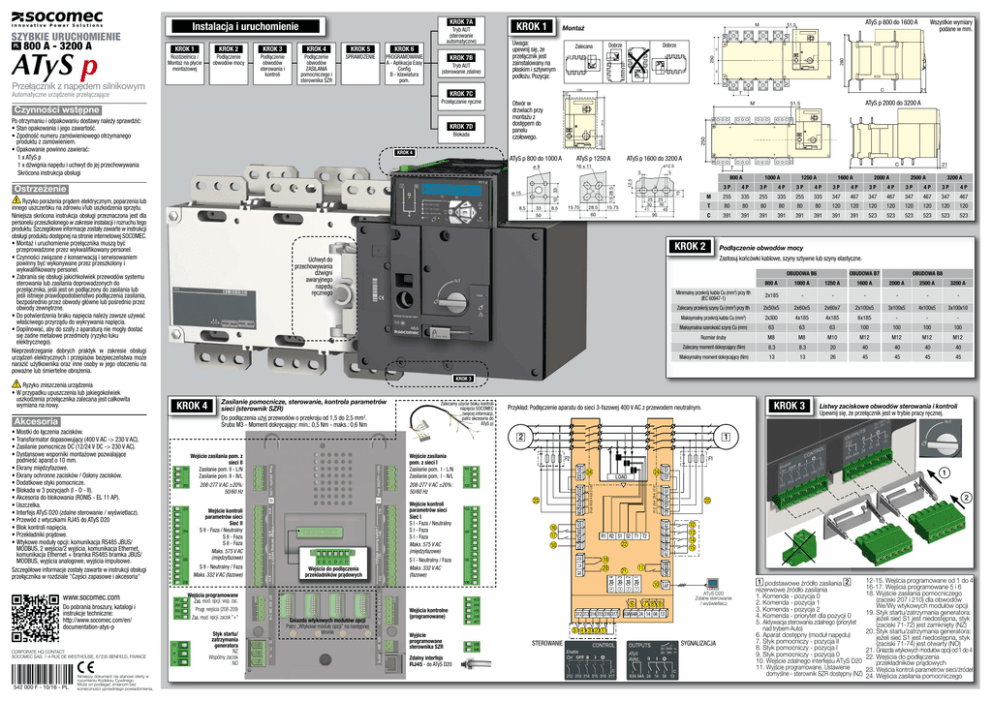 KROK 4 KROK 5 KROK 6 Rozdzielnica / Montaż na płycie montażowej Podłączenie obwodów mocy Podłączenie obwodów sterowania i kontroli Podłączenie obwodów ZASILANIA pomocniczego i sterownika SZR SPRAWDZENIE PROGRAMOWANIE A - Aplikacja Easy Config B - klawiatura pom. Przełącznik z napędem silnikowym KROK 7B Tryb AUT (sterowanie zdalne) Uwaga: upewnij się, że przełącznik jest zainstalowany na płaskim i sztywnym podłożu. Pozycja: KROK 7D Blokada KROK 4 Otwór w drzwiach przy montażu z dostępem do panelu czołowego. M ATyS p 800 do 1000 A ATyS p 1250 A 8.5 33 8.5 15.75 28.5 15 60 50 KROK 4 2000 A 2500 A 3200 A 4P 3P 4P 3P 4P 3P 4P 3P 4P 3P 4P 255 335 255 335 255 335 347 467 347 467 347 467 347 467 T 80 80 80 80 80 80 120 120 120 120 120 120 120 120 C 391 391 391 391 391 391 391 391 523 523 523 523 523 523 Podłączenie obwodów mocy OBUDOWA B6 Zasilanie pomocnicze, sterowanie, kontrola parametrów sieci (sterownik SZR) Do podłączenia użyj przewodów o przekroju od 1,5 do 2,5 mm2. Śruba M3 - Moment dokręcający: min.: 0,5 Nm - maks.: 0,6 Nm OBUDOWA B7 OBUDOWA B8 800 A 1000 A 1250 A 1600 A 2000 A 2500 A 3200 A Minimalny przekrój kabla Cu (mm2) przy Ith (IEC 60947-1) 2x185 - - - - - - Zalecany przekrój szyny Cu (mm ) przy Ith 2x50x5 2x60x5 2x60x7 2x100x5 3x100x5 4x100x5 3x100x10 Maksymalny przekrój kabla Cu (mm2) 2x300 4x185 4x185 6x185 - - - Maksymalna szerokość szyny Cu (mm) 63 63 63 100 100 100 100 Rozmiar śruby M8 M8 M10 M12 M12 M12 M12 Zalecany moment dokręcający (Nm) 8.3 8.3 20 40 40 40 40 Maksymalny moment dokręcający (Nm) 13 13 26 45 45 45 45 Zalecamy użycie bloku kontroli napięcia SOCOMEC (więcej informacji, patrz akcesoria do ATyS p) 19 20 417 416 415 414 413 417 416 415 414 413 417 416 415 414 413 312 313 314 315 316 317 ATyS p 64B 63B Dual auxiliary supply: Uc 208-277V~ +/-20% 50/60Hz Power comsumption: 22VA Wyjście programowane See instruction sheet sterownika SZR Zdalny interfejs RJ45 - do ATyS D20 3 2 1 6 Wejścia kontrolne (programowane) ATS CONTROLLER To D20 64B 63B To D20 64B 63B To D10 417 416 415 414 413 64B 63B See instruction sheet 74 To D10 See instruction sheet Power comsumption: 22VA 72 71 Power comsumption: 22VA 74 74 74 Niniejszy dokument nie stanowi oferty w rozumieniu Kodeksu Cywilnego. Może on podlegać zmianom bez konieczności uprzedniego powiadomienia. Styk startu/ zatrzymania generatora NZ Wspólny zacisk NO 72 71 See instruction sheet CORPORATE HQ CONTACT: SOCOMEC SAS, 1-4 RUE DE WESTHOUSE, 67235 BENFELD, FRANCE ATyS g wtykowych ATyS p Gniazda modułów opcji ATS CONTROLLER Patrz „Wtykowe moduły opcji” na następnej Dual auxiliary supply: Dual auxiliary supply: stronie Uc 208-277V~ +/-20% 50/60Hz Uc 208-277V~ +/-20% 50/60Hz ATS CONTROLLER 72 71 72 71 Dual auxiliary supply: Dual auxiliary supply: Uc 208-277V~ +/-20% 50/60Hz Uc 208-277V~ +/-20% 50/60Hz Power comsumption: 22VA Power comsumption: 22VA 207 208 209 210 ATS CONTROLLER 207 208 209 210 Wejścia programowane Zas. mod. opcji. wsp. zac. Progr. wejścia (208-209) Zas.gmod. opcji. zacisk "+" ATyS 11 21 10 102 101 1 106 105 104 103 I/1-2 I/3-4 I/5-6 I/7-8 R1 R2 S1 S2 T1 T2 22 Opt. 4 S I - Neutralny / Faza Maks. 332 V AC (fazowe) Wejścia do podłączenia przekładników prądowych 64B 63B 417 416 415 414 413 18 24 LOAD 7 8 9 12 13 14 15 ATyS D20 Zdalne sterowanie / wyświetlacz 63A 64A 24 14 04 13 5 4 3 2 1 STEROWANIE 2 23 RJ 16 17 72 71 74 S II - Neutralny / Faza Maks. 332 V AC (fazowe) 23 207 208 209 210 Wejście kontroli parametrów sieci Sieć I S I - Faza / Neutralny S I - Faza S I - Faza Maks. 575 V AC (międzyfazowe) 24 Opt. 3 Opt. 2 Opt. 1 208-277 V AC ±20%: 50/60 Hz F1 II/1-2 II/3-4 II/5-6 II/7-8 208-277 V AC ±20%: 50/60 Hz F2 203 204 205 206 Wejście zasilania pom. z sieci I Zasilanie pom. I - L/N Zasilanie pom. I - N/L Listwy zaciskowe obwodów sterowania i kontroli Upewnij się, że przełącznik jest w trybie pracy ręcznej. 1 201 202 Wejście zasilania pom. z sieci II Zasilanie pom. II - L/N Zasilanie pom. II - N/L Wejście kontroli parametrów sieci Sieć II S II - Faza / Neutralny S II - Faza S II - Faza Maks. 575 V AC (międzyfazowe) ATyS t See instruction sheet KROK 3 Przykład: Podłączenie aparatu do sieci 3-fazowej 400 V AC z przewodem neutralnym. 2 207 208 209 210 207 208 209 210 Do pobrania broszury, katalogi i instrukcje techniczne: http://www.socomec.com/en/ ATS CONTROLLER documentation-atys-p 542 000 F - 10/16 - PL 1600 A 3P Zastosuj końcówki kablowe, szyny sztywne lub szyny elastyczne. 4 See instruction sheet 1250 A 4P KROK 3 Akcesoria Dual auxiliary supply: Uc 208-277V~ +/-20% 50/60Hz Power comsumption: 22VA 1000 A 21 3P 2 • Mostki do łączenia zacisków. • Transformator dopasowujący (400 V AC -> 230 V AC). • Zasilanie pomocnicze DC (12/24 V DC -> 230 V AC). • Dystansowe wsporniki montażowe pozwalające podnieść aparat o 10 mm. • Ekrany międzyfazowe. • Ekrany ochronne zacisków / Osłony zacisków. • Dodatkowe styki pomocnicze. • Blokada w 3 pozycjach (I - O - II). • Akcesoria do blokowania (RONIS - EL 11 AP). • Uszczelka. • Interfejs ATyS D20 (zdalne sterowanie / wyświetlacz). • Przewód z wtyczkami RJ45 do ATyS D20 • Blok kontroli napięcia. • Przekładniki prądowe. • Wtykowe moduły opcji: komunikacja RS485 JBUS/ MODBUS, 2 wejścia/2 wyjścia, komunikacja Ethernet, komunikacja Ethernet + bramka RS485 bramka JBUS/ MODBUS, wyjścia analogowe, wyjścia impulsowe. Szczegółowe informacje zostały zawarte w instrukcji obsługi przełącznika w rozdziale "Części zapasowe i akcesoria" ATyS t M KROK 2 Uchwyt do przechowywania dźwigni awaryjnego napędu ręcznego Ryzyko zniszczenia urządzenia • W przypadku upuszczenia lub jakiegokolwiek uszkodzenia przełącznika zalecana jest całkowita wymiana na nowy. ATS CONTROLLER 800 A 25 25 30 30 45 45 90 15.75 C T 12.5 15 28.5 10 33 Ryzyko porażenia prądem elektrycznym, poparzenia lub innego uszczerbku na zdrowiu i/lub uszkodzenia sprzętu. Niniejsza