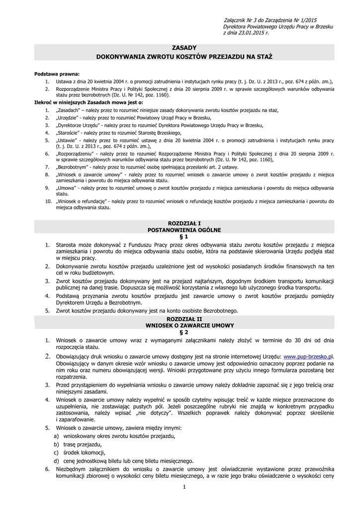 Załącznik Nr 3 do Zarządzenia Nr 1/2015 Dyrektora Powiatowego Urzędu Pracy w Brzesku z dnia 23.01.2015 r. ZASADY DOKONYWANIA ZWROTU KOSZTÓW PRZEJAZDU NA STAŻ Podstawa prawna: 1. Ustawa z dnia 20 kwietnia 2004 r. o promocji zatrudnienia i instytucjach rynku pracy (t. j. Dz. U. z 2013 r., poz. 674 z późn. zm.), 2. Rozporządzenie Ministra Pracy i Polityki Społecznej z dnia 20 sierpnia 2009 r. w sprawie szczegółowych warunków odbywania stażu przez bezrobotnych (Dz. U. Nr 142, poz. 1160). Ilekroć w niniejszych Zasadach mowa jest o: 1. „Zasadach" – należy przez to rozumieć niniejsze zasady dokonywania zwrotu kosztów przejazdu na staż, 2. „Urzędzie” - należy przez to rozumieć Powiatowy Urząd Pracy w Brzesku, 3. „Dyrektorze Urzędu” - należy przez to rozumieć Dyrektora Powiatowego Urzędu Pracy w Brzesku, 4. „Staroście” - należy przez to rozumieć Starostę Brzeskiego, 5. „Ustawie” - należy przez to rozumieć ustawę z dnia 20 kwietnia 2004 r. o promocji zatrudnienia i instytucjach rynku pracy (t. j. Dz. U. z 2013 r., poz. 674 z późn. zm.), 6. „Rozporządzeniu” - należy przez to rozumieć Rozporządzenie Ministra Pracy i Polityki Społecznej z dnia 20 sierpnia 2009 r. w sprawie szczegółowych warunków odbywania stażu przez bezrobotnych (Dz. U. Nr 142, poz. 1160), 7. „Bezrobotnym” - należy przez to rozumieć osobę spełniającą przesłanki art. 2 ustawy. 8. „Wniosek o zawarcie umowy” - należy przez to rozumieć wniosek o zawarcie umowy o zwrot kosztów przejazdu z miejsca zamieszkania i powrotu do miejsca odbywania stażu. 9. „Umowa” - należy przez to rozumieć umowę o zwrot kosztów przejazdu z miejsca zamieszkania i powrotu do miejsca odbywania stażu. 10. „Wniosek o refundację” - należy przez to rozumieć wniosek o refundację kosztów przejazdu z miejsca zamieszkania i powrotu do miejsca odbywania stażu. ROZDZIAŁ I POSTANOWIENIA OGÓLNE §1 1. Starosta może dokonywać z Funduszu Pracy przez okres odbywania stażu zwrotu kosztów przejazdu z miejsca zamieszkania i powrotu do miejsca odbywania stażu osobie, która na podstawie skierowania Urzędu podjęła staż w miejscu pracy. 2. Dokonywanie zwrotu kosztów przejazdu uzależnione jest od wysokości posiadanych środków finansowych na ten cel w roku budżetowym. 3. Zwrot kosztów przejazdu dokonywany jest na przejazd najtańszym, dogodnym środkiem transportu komunikacji publicznej na danej trasie. Dopuszcza się możliwość korzystania z własnego lub użyczonego środka transportu. 4. Podstawą przyznania zwrotu kosztów przejazdu jest zawarcie umowy o zwrot kosztów przejazdu pomiędzy Dyrektorem Urzędu a Bezrobotnym. 5. Zwrot kosztów przejazdu dokonywany jest na konto osobiste Bezrobotnego. ROZDZIAŁ II WNIOSEK O ZAWARCIE UMOWY §2 1. Wniosek o zawarcie umowy wraz z wymaganymi załącznikami należy złożyć w terminie do 30 dni od dnia rozpoczęcia stażu. 2. Obowiązujący druk wniosku o zawarcie umowy dostępny jest na stronie internetowej Urzędu: www.pup-brzesko.pl. Obowiązujący w danym okresie wzór wniosku o zawarcie umowy jest odpowiednio oznaczony poprzez podanie na nim roku oraz numeru obowiązującej wersji. Wnioski przygotowane przy użyciu innego formularza pozostaną bez rozpatrzenia. 3. Przed przystąpieniem do wypełniania wniosku o zawarcie umowy należy dokładnie zapoznać się z jego treścią oraz niniejszymi zasadami. 4. Wniosek o zawarcie umowy należy wypełnić w sposób czytelny wpisując treść w każde miejsce przeznaczone do uzupełnienia, nie zostawiając pustych pól. Jeżeli poszczególne rubryki nie znajdą w konkretnym przypadku zastosowania, należy wpisać „nie dotyczy”. Wszelkich poprawek należy dokonywać poprzez skreślenie i zaparafowanie. 5. Wniosek o zawarcie umowy, zawiera między innymi: a) wnioskowany okres zwrotu kosztów przejazdu, b) trasę przejazdu, c) środek lokomocji, d) cenę jednostkową biletu lub cenę biletu miesięcznego. 6. Niezbędnym załącznikiem do wniosku o zawarcie umowy jest oświadczenie wystawione przez przewoźnika komunikacji zbiorowej o wysokości ceny biletu miesięcznego, a w razie jego braku oświadczenie o wysokości ceny 1 biletu jednorazowego na trasie przejazdu z miejsca zamieszkania do miejsca odbywania stażu 7. W przypadku dokonywania refundacji kosztów przejazdu własnym środkiem transportu należy przedstawić do wglądu w dniu złożenia wniosku o zawarcie umowy prawo jazdy oraz dowód rejestracyjny samochodu. Rozdział III UMOWA §3 1. 2. Z Bezrobotnym, którego wniosek o zawarcie umowy został rozpatrzony pozytywnie zawierana jest umowa. Umowa zawiera w szczególności: a) sposób obliczania refundacji, b) sposób rozwiązania umowy. 3. Wszystkie zmiany i uzupełnienia warunków umowy mogą być dokonane w drodze aneksu do umowy i wymagają formy pisemnej pod rygorem nieważności. 4. Starosta dokona wypowiedzenia umowy w trybie natychmiastowym w przypadku: a) nie dotrzymania przez Bezrobotnego warunków umowy, b) przerwania przez Bezrobotnego z własnej winy odbywania u pracodawcy stażu, c) utraty statusu osoby bezrobotnej. 5. Wypowiedzenie umowy z przyczyn, o których mowa w ust. 4 pkt b) i c) powoduje obowiązek zwrotu przez Bezrobotnego wypłaconych kosztów przejazdu, chyba że powodem tego przerwania było podjęcie zatrudnienia, innej pracy zarobkowej lub rozpoczęcie działalności gospodarczej. 6. Urząd może rozwiązać umowę w przypadku niewłaściwego udokumentowania poniesionych kosztów lub niezłożenia wniosku o refundację w wyznaczonym terminie. Rozdział IV WNIOSEK O REFUNDACJĘ §4 1. Podstawą dokonania refundacji kosztów przejazdu jest comiesięczne składnie przez Bezrobotnego wniosku o refundację. Obowiązujący druk wniosku o refundację dostępny jest na stronie internetowej Urzędu: www.pup-brzesko.p. Obowiązujący w danym okresie wzór wniosku o refundację jest odpowiednio oznaczony poprzez podanie na nim roku oraz nume