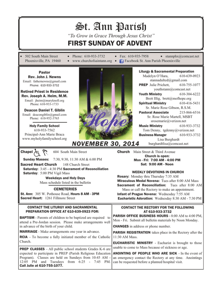 St. Ann Parish “To Grow in Grace Through Jesus Christ” FIRST SUNDAY OF ADVENT • 502 South Main Street Phoenixville, PA 19460 • Phone: 610-933-3732 • Fax: 610-935-7958 • [email protected] • www.churchofsaintann.org • Facebook St. Ann Parish Phoenixville Pastor Rev. John J. Newns Email: [email protected] Phone: 610-933-3732 Retired Priest in Residence Rev. Joseph A. Heim, M.M. Email: [email protected] Phone: 610-933-1733 Deacon Daniel T. Giblin Email: [email protected] Phone: 610-952-3765 Holy Family School 610-933-7562 Principal-Ann Marie Braca www.myholyfamilyschool.org Chapel Liturgy & Sacramental Preparation Madelyn O’Hara, 610-639-0923 [email protected] PREP Julie Prichett, 610-755-1077 [email protected] Youth Ministry 610-304-6222 Brett Illig, [email protected] Spiritual Ministry 610-416-5431 Sr. Marie Rose Gibson, R.S.M. Pastoral Associate 215-866-6516 Sr. Rose Marie Martell, MSBT [email protected] Music Ministry 610-933-3732 Tom Denny, [email protected] Business Manager 610-933-3732 Lisa Burghardt [email protected] NOVEMBER 30, 2014 604 South Main Street Sunday Masses: 7:30, 9:30, 11:30 AM & 6:00 PM Sacred Heart Church 148 Church Street Saturday: 3:45 - 4:30 PM Sacrament of Reconciliation Saturday: 5:00 PM Vigil Mass Weekdays and Holy Days Mass schedule listed in the bulletin CEMETERIES St. Ann: 305 W. Pothouse Road, Hours 8 AM - 3PM Sacred Heart: 1261 Fillmore Street Church Main Street & Third Avenue Church is open: Mon - Fri: 7:00 AM - 4:00 PM Sat: 9:00 AM - Noon WEEKLY DEVOTIONS IN CHURCH Rosary: Monday thru Thursday 7:35 AM Miraculous Medal Novena: Tues after 8:00 AM Mass Sacrament of Reconciliation: Tues after 8:00 AM Mass or call the Rectory to make an appointment. Infant of Prague Novena: Wednesday 7:55 AM Eucharistic Adoration: Wednesday 8:30 AM - 7:30 PM CONTACT THE LITURGY AND SACRAMENTAL PREPARATION OFFICE AT 610-639-0923 FOR: CONTACT THE RECTORY FOR THE FOLLOWING AT 610-933-3732 PARISH OFFICE BUSINESS HOURS - 8:00 AM to 4:00 PM, BAPTISM - Parents of children to be baptized are required to Mon - Fri. Submit all bulletin materials by Noon Monday. attend a Pre-Jordan session. Please make arrangements well CHANGES in address or phone number. in advance of the birth of your child. MARRIAGE - Make arrangements one year in advance. PARISH REGISTRATION takes place in the Rectory after the RCIA - To become a fully initiated member of the Catholic 11:30 AM Mass. Church. EUCHARISTIC MINISTRY - Eucharist is brought to those PREP CLASSES - All public school students Grades K-6 are expected to participate in PREP (Parish Religious Education Program). Classes are held on Sundays from 10:45 AM 12:05 PM and Tuesdays from 6:25 - 7:45 PM. Call Julie at 610-755-1077. unable to come to Mass because of sickness or age. ANOINTING OF PEOPLE WHO ARE SICK - In the event of an emergency contact the Rectory at any time. Anointings can be requested before a planned hospital visit. FROM THE PASTOR HAPPY NEW YEAR & HAPPY ADVENT – Today we celebrate both the first day of the Year of Grace 2015 and the start of the penitential season of Advent. It strikes me that on the first day of each Church Year, our Tradition directs our attention to the last day: the end of time, the final coming of the Christ, the consummation of creation. T.S. Eliot wrote: “And the end of all our exploring will be to arrive where we started, and know the place for the first time.” Having arrived yesterday at the end of the Year of Grace 2014, have we gained any more insight into the purpose of life and are we living in greater conformity with what we have been graced to see? Was Macbeth correct when he said, “life is a tale told by an idiot, full of sound and fury, signifying nothing”, or does life have a point, an end, a purpose, a goal—in short, meaning? Is there a point in relation to which the discrete, distinct, disparate events of life might find shape and sense, contour and coherence? Is there a focus, a center around which our experiences might be ordered so as to offer a thread, a connecting of dots, a narrative, a tale signifying not only something, but something wonderful? Yes, there is one point (“uni”) around which all turns (“verse”)—Jesus Christ, the King of the Universe; the Still-Point in a whirling cosmos, the Alpha-Point from which all that is has emerged, the Omega-Point toward Whom all creation is being drawn. Meaning derives from context. Life has meaning because life has a context into which life itself can be located. Christ is the context for it is in Him that “we live, and move, and have our being” (see Acts 17:28; see “What Fits Into What?” at the Pastor’s Portion of our parish website). This is why we Christians can “tell” time: we can tell time that it has a pivotal, focal, central event that gives time itself meaning. And so we tell time that it is demarked as being “Before Christ” (B.C.) or “After Christ” (A.D. for Anno Domini; Year of the Lord). The word Advent means “Coming,” and the coming of Christ has three senses: 1) His first coming in Bethlehem; 2) his final coming toward which today’s liturgy directs us; and 3) what St. Bernard called Christ’s “middle” coming meaning when the Lord comes into our consciousness and calls us to lives of continuing conversion. When we take the next step into a deeper relationship with the Truth about life, self, other, and God we are being formed by and in Christ A synonym for ongoing conversion is Penance, and so we begin the new Year of Grace with a penitential season. This Advent 91 of our children will meet the Lord in the Sacrament of Penance for the first time, and during Advent Fr. Heim and I will be available more frequently each week for Confessions. The schedule for Confessions as well as materials to help adults examine their conscience and consciousness are available in our worship sites and on our Parish Website. Have you noticed that during Sunday Masses our lectors explic