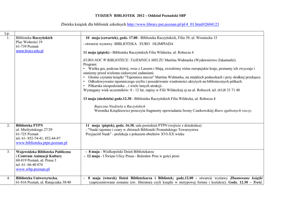 TYDZIEŃ BIBLIOTEK 2012 – Oddział Poznański SBP Zbiórka książek dla bibliotek szkolnych http://www.library.put.poznan.pl/pl/4_01.html#2604123 Lp. 1. Biblioteka Raczyńskich Plac Wolności 19 61-739 Poznań www.bracz.edu.pl 10 maja (czwartek), godz. 17.00 - Biblioteka Raczyńskich, Filia 39, ul. Wroniecka 15 - otwarcie wystawy BIBLIOTEKA EURO OLIMPIADA 11 maja (piątek) - Biblioteka Raczyńskich Filia Wildecka, ul. Robocza 4 EURO-NOC W BIBLIOTECE: TAJEMNICA MECZU Martina Widmarka (Wydawnictwo Zakamarki). Program: • Wielka gra, podczas której, wraz z Lassem i Mają, zwiedzimy różne europejskie kraje, poznamy ich zwyczaje i staniemy przed wieloma ciekawymi zadaniami. • Głośne czytanie książki "Tajemnica meczu" Martina Widmarka, na miękkich poduszkach i przy słodkiej przekąsce. • Odkodowywanie tajemniczego szyfru i poszukiwanie wiadomości ukrytych na bibliotecznych półkach. • Piłkarska niespodzianka ...i wiele innych atrakcji. Wymagany wiek uczestników: 8 - 12 lat, zapisy w Filii Wildeckiej ej na ul. Robocz4, tel. (61)8 33 71 40 13 maja (niedziela) godz.12.30 - Biblioteka Raczyńskich Filia Wildecka, ul. Robocza 4 Bajeczna Niedziela u Raczyńskich Weronika Książkiewicz przeczyta fragmenty opowiadania Iwony Czarkowskiej Biuro zgubionych rzeczy. 2. Biblioteka PTPN ul. Mielżyńskiego 27/29 61-725 Poznań tel. 61- 852-74-41, 852-44-87 11 maja (piątek), godz. 16.30, sala posiedzeń PTPN (wejście z dziedzińca) - "Nauki tajemne i czary w zbiorach Biblioteki Poznańskiego Towarzystwa Przyjaciół Nauk" - prelekcja z pokazem obiektów XVI-XX wieku www.biblioteka.ptpn.poznan.pl 3. Wojewódzka Biblioteka Publiczna i Centrum Animacji Kultury 60-819 Poznań, ul. Prusa 3 tel. 61- 66-40 874 - 8 maja - Wielkopolski Dzień Bibliotekarza - 12 maja - I Święto Ulicy Prusa - Bolesław Prus w gości prosi www.wbp.poznan.pl 4. Biblioteka Uniwersytecka, 61-816 Poznań, ul. Ratajczaka 38/40 - 8 maja (wtorek) Dzień Bibliotekarza i Bibliotek; godz.12.00 - otwarcie wystawy Zbuntowane książki (zaprezentowana zostanie tzw. liberatura czyli książki w nietypowej formie i kształcie). Godz. 12.30 – Treść. tel. 61 829 38 42 www.lib.amu.edu.pl Forma. Tekst. Książka. wykład Radosława Nowakowskiego, pisarza , podróżnika, autora kilkunastu dzieł liberackich, członka legendarnego zespołu Osjan. Sala 82 - 8-15 maja – na zasadach “gry miejskiej”, gra w gmachu Biblioteki Uniwersyteckiej “na tropie liberatury”. Startszatnia BU! - 9 maja (środa) godz.12.00 – Zasady i kryteria oceny czasopism naukowych w świetle nowych wytycznych ministerialnych. Wykład dra Emanuela Kulczyckiego – teoretyka komunikacji, filozofa i grafika, adiunkta w Instytucie Filozofii Uniwersytetu im. Adama Mickiewicza w Poznaniu, poświęcony problematyce redagowania, wydawania, spełniania kryteriów i zasad oceny czasopism naukowych oraz cechom czasopism elektronicznych i elektronicznym czasopismom drukowanym. Sala 82 - 9 maja (środa) godz.9.00-14.00 - oferta skierowana do uczniów szkół średnich – zwiedzanie Biblioteki w tym wystawy Zbuntowane książki oraz zapoznanie przyszłych użytkowników z ciekawymi zbiorami, szkoleniami i usługami oferowanymi przez Bibliotekę. Miejsce spotkania – hol BU, po wcześniejszym zgłoszeniu tel.61 829 3842 - 9 maja (środa) godz.16.00 - Kurlandzkie skarby rękopiśmienne, czyli opowieść o średniowiecznej Łotwie, kawalerach mieczowych i ich spadkobiercach . Wykład dr Alicji Szulc, Biblioteka Uniwersytecka, Oddział Zbiorów Specjalnych, Pracownia Rękopisów. Sala 82 - 10 maja (czwartek) godz. 16.30 - Wydawcy poznańscy 1815-1914. Kształtowanie środowiska i repertuaru wydawniczego. Promocja książki dr Artura Jazdona, autora 3 książek i ponad 100 artykułów z historii ruchu wydawniczego, drukarstwa i księgarstwa oraz historii, organizacji zarządzania i działalności bibliotek . Sala 82 - 11 maja (piątek) godz. 10.00-17.00 - Akcja Oddziału Gromadzenia i Uzupełniania Zbiorów BU, Książka dla każdego. Stoisko z książkami-dubletami ze zbiorów Biblioteki 11 maja ( piątek) Wieczór w Bibliotece W programie: - godz. 16.00 – Rozpoczęcie - otwarcie wystawy 50 lat Wydawnictwa Naukowego UAM - godz.16.30,17.00,17.30,18.00, 18.30 - zwiedzanie zakamarków Biblioteki Uniwersyteckiej – zabytkowy gabinet dyrektora Biblioteki, Katalog (dziś Informatorium), czytelnie, magazyny biblioteczne, Pracownia Digitalizacji, Pracownia Restauracji Książki; prezentacja najcenniejszych zabytków ze zbiorów Biblioteki Uniwersyteckiej, przygotowana przez Oddział Zbiorów Specjalnych, zwiedzanie wystawy Zbuntowane książki (zaprezentowana zostanie tzw. liberatura czyli książki w nietypowej formie i kształcie). Wystawa zorganizowana na poddaszu Biblioteki! - kiermasz wydawnictw Biblioteki Uniwersyteckiej - hol - około godz. 19.30 - Koncert kończący IX Tydzień Bibliotek – Występ zespołu Capella Zamku Rydzyńskiego. W programie muzyka renesansu i baroku, patriotyczna, wojskowa oraz popularna i rozrywkowa - hol główny Biblioteki 5. Biblioteka Politechniki Poznańskiej - 8 – 15 maja BOOKCROSSING - regał w holu przed wejściem do biblioteki. 61-138 Poznań, ul. Piotrowo 2 tel. 61 665 30 16 www.library.put.poznan.pl 6. Biblioteka Główna Uniwersytetu Ekonomicznego 61-895 Poznań ul. Powstańców Wlkp. 16 tel. 61 854 33 55 www.biblioteka.ue.poznan.pl 7. Biblioteka Główna Uniwersytetu Medycznego 60-775 Poznań ul. Parkowa 2 tel. 61 854 67 40 www.bg.am.poznan.pl 8. Biblioteka Uniwersytetu Przyrodniczego 61-693 Poznań ul. Witosa 45 tel. 61 848 78 18 - 8 – 15 maja Wystawa zdjęć Piotra Raczkowskiego i Natalii Cofty (pracowników Oddziału Technologii Informacyjnych i Komunikacyjnych) na telebimach w holu Centrum Wykładowego i w Bibliotece PP. - 8 - 15 maja Wystawa rysunku i grafiki studenta Wyższej Szkoły Nauk Humanistycznych i Dziennikarstwa - hol wypożyczalni. - 8 – 15 maja WYSTAWY W GABLOTACH na terenie biblioteki "Hobby i zai