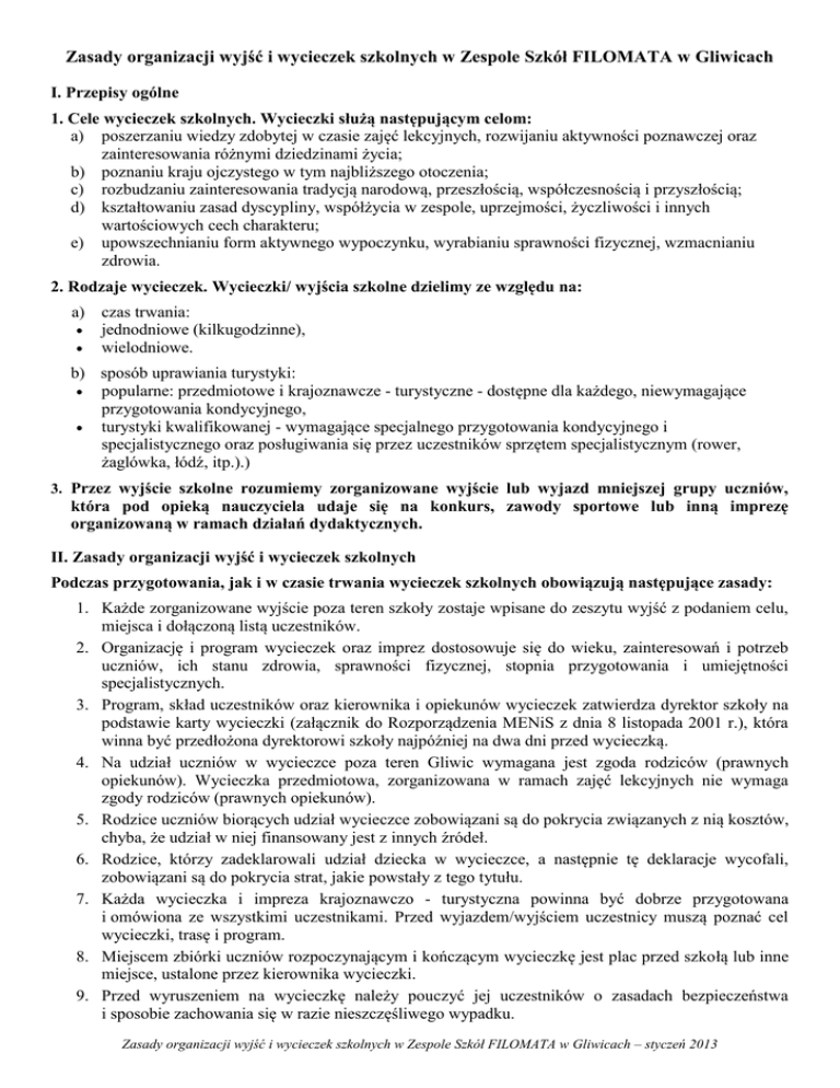 Zasady organizacji wyjść i wycieczek szkolnych w Zespole Szkół FILOMATA w Gliwicach I. Przepisy ogólne 1. Cele wycieczek szkolnych. Wycieczki służą następującym celom: a) poszerzaniu wiedzy zdobytej w czasie zajęć lekcyjnych, rozwijaniu aktywności poznawczej oraz zainteresowania różnymi dziedzinami życia; b) poznaniu kraju ojczystego w tym najbliższego otoczenia; c) rozbudzaniu zainteresowania tradycją narodową, przeszłością, współczesnością i przyszłością; d) kształtowaniu zasad dyscypliny, współżycia w zespole, uprzejmości, życzliwości i innych wartościowych cech charakteru; e) upowszechnianiu form aktywnego wypoczynku, wyrabianiu sprawności fizycznej, wzmacnianiu zdrowia. 2. Rodzaje wycieczek. Wycieczki/ wyjścia szkolne dzielimy ze względu na: a) czas trwania: jednodniowe (kilkugodzinne), wielodniowe. b) sposób uprawiania turystyki: popularne: przedmiotowe i krajoznawcze - turystyczne - dostępne dla każdego, niewymagające przygotowania kondycyjnego, turystyki kwalifikowanej - wymagające specjalnego przygotowania kondycyjnego i specjalistycznego oraz posługiwania się przez uczestników sprzętem specjalistycznym (rower, żaglówka, łódź, itp.).) 3. Przez wyjście szkolne rozumiemy zorganizowane wyjście lub wyjazd mniejszej grupy uczniów, która pod opieką nauczyciela udaje się na konkurs, zawody sportowe lub inną imprezę organizowaną w ramach działań dydaktycznych. II. Zasady organizacji wyjść i wycieczek szkolnych Podczas przygotowania, jak i w czasie trwania wycieczek szkolnych obowiązują następujące zasady: 1. Każde zorganizowane wyjście poza teren szkoły zostaje wpisane do zeszytu wyjść z podaniem celu, miejsca i dołączoną listą uczestników. 2. Organizację i program wycieczek oraz imprez dostosowuje się do wieku, zainteresowań i potrzeb uczniów, ich stanu zdrowia, sprawności fizycznej, stopnia przygotowania i umiejętności specjalistycznych. 3. Program, skład uczestników oraz kierownika i opiekunów wycieczek zatwierdza dyrektor szkoły na podstawie karty wycieczki (załącznik do Rozporządzenia MENiS z dnia 8 listopada 2001 r.), która winna być przedłożona dyrektorowi szkoły najpóźniej na dwa dni przed wycieczką. 4. Na udział uczniów w wycieczce poza teren Gliwic wymagana jest zgoda rodziców (prawnych opiekunów). Wycieczka przedmiotowa, zorganizowana w ramach zajęć lekcyjnych nie wymaga zgody rodziców (prawnych opiekunów). 5. Rodzice uczniów biorących udział wycieczce zobowiązani są do pokrycia związanych z nią kosztów, chyba, że udział w niej finansowany jest z innych źródeł. 6. Rodzice, którzy zadeklarowali udział dziecka w wycieczce, a następnie tę deklaracje wycofali, zobowiązani są do pokrycia strat, jakie powstały z tego tytułu. 7. Każda wycieczka i impreza krajoznawczo - turystyczna powinna być dobrze przygotowana i omówiona ze wszystkimi uczestnikami. Przed wyjazdem/wyjściem uczestnicy muszą poznać cel wycieczki, trasę i program. 8. Miejscem zbiórki uczniów rozpoczynającym i kończącym wycieczkę jest plac przed szkołą lub inne miejsce, ustalone przez kierownika wycieczki. 9. Przed wyruszeniem na wycieczkę należy pouczyć jej uczestników o zasadach bezpieczeństwa i sposobie zachowania się w razie nieszczęśliwego wypadku. Zasady organizacji wyjść i wycieczek szkolnych w Zespole Szkół FILOMATA w Gliwicach – styczeń 2013 10. Na wycieczce/imprezie w obrębie tej samej miejscowości, bez korzystania ze środków lokomocji, opiekę sprawuje co najmniej jeden nauczyciel nad grupą do 30 uczniów; gdy jednak wycieczka korzysta ze środków lokomocji lub udaje się poza miejscowość będącą siedzibą szkoły, opiekę sprawuje jedna osoba nad grupą do 15 uczniów. 11. Na wycieczce turystyki kwalifikowanej opiekę sprawuje jedna osoba nad grupą do l0 uczniów, jeśli przepisy szczegółowe nie stanowią inaczej; 12. Liczba opiekunów może ulec zmianie ze względu na wiek, stan zdrowia, ewentualną niepełnosprawność, a także specyfikę zajęć, imprez i wycieczek oraz warunki w jakich będą się one odbywały. 13. Opiekunowie sprawdzają stan liczbowy uczestników przed wyruszeniem z każdego miejsca postoju w czasie zwiedzania, przejazdów oraz po przybyciu do miejsca docelowego. 14. Długość dziennych odcinków trasy i tempo należy dostosować do możliwości najsłabszego uczestnika wycieczki. 15. Wszyscy uczestnicy szkolnej wycieczki muszą być objęci powszechnym ubezpieczeniem młodzieży szkolnej. 16. Na wycieczkę należy zabrać dobrze wyposażoną apteczkę pierwszej pomocy. 17. Zabrania się prowadzenia wycieczek podczas burzy, śnieżycy, gołoledzi. III. Szczegółowe zasady bezpieczeństwa na wycieczkach szkolnych Wycieczka autokarowa 1. 2. 3. 4. 5. 6. 7. 8. 9. Liczebność grupy musi być dostosowana do możliwości technicznych autokaru (liczba miejsc). Na każdych 15 uczniów przypada l opiekun (nie licząc kierowcy i pilota/przewodnika). Każdy opiekun ma przydzieloną sobie grupę 15 uczniów. Miejsca przy drzwiach zajmują osoby dorosłe (opiekunowie). Przejścia w autokarze muszą być wolne, nie mogą tam znajdować się dodatkowe miejsca do siedzenia. Kierowca musi posiadać świadectwo kwalifikacyjne kierowcy zawodowego i potwierdzenie sprawności technicznej autokaru. Autokar musi być oznakowany - przewóz dzieci. Po każdej przerwie w podróży należy sprawdzić stan liczebny uczestników. Obowiązkiem opiekunów jest dopilnowanie uczniów w czasie jazdy (nie wolno chodzić po autokarze, siedzieć tyłem, na oparciu, wyrzucać śmieci przez okno, itd.). Wycieczka piesza: 1. Liczebność do 30 uczniów - 2 opiekunów (jednym z nich może być rodzic lub inna pełnoletnia osoba). 2. W czasie marszu jeden opiekun prowadzi grupę, drugi idzie na końcu kolumny. 3. Uczestnicy posiadają ubiór (a szczególnie buty) odpowiednie do miejsca i warunków atmosferycznych. 4. W mieście poruszamy się chodnik