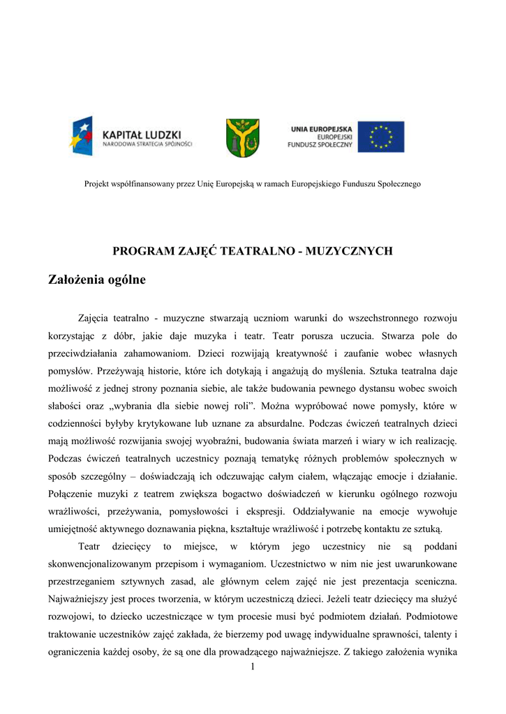 Projekt współfinansowany przez Unię Europejską w ramach Europejskiego Funduszu Społecznego PROGRAM ZAJĘĆ TEATRALNO - MUZYCZNYCH Założenia ogólne Zajęcia teatralno - muzyczne stwarzają uczniom warunki do wszechstronnego rozwoju korzystając z dóbr, jakie daje muzyka i teatr. Teatr porusza uczucia. Stwarza pole do przeciwdziałania zahamowaniom. Dzieci rozwijają kreatywność i zaufanie wobec własnych pomysłów. Przeżywają historie, które ich dotykają i angażują do myślenia. Sztuka teatralna daje możliwość z jednej strony poznania siebie, ale także budowania pewnego dystansu wobec swoich słabości oraz „wybrania dla siebie nowej roli”. Można wypróbować nowe pomysły, które w codzienności byłyby krytykowane lub uznane za absurdalne. Podczas ćwiczeń teatralnych dzieci mają możliwość rozwijania swojej wyobraźni, budowania świata marzeń i wiary w ich realizację. Podczas ćwiczeń teatralnych uczestnicy poznają tematykę różnych problemów społecznych w sposób szczególny – doświadczają ich odczuwając całym ciałem, włączając emocje i działanie. Połączenie muzyki z teatrem zwiększa bogactwo doświadczeń w kierunku ogólnego rozwoju wrażliwości, przeżywania, pomysłowości i ekspresji. Oddziaływanie na emocje wywołuje umiejętność aktywnego doznawania piękna, kształtuje wrażliwość i potrzebę kontaktu ze sztuką. Teatr dziecięcy to miejsce, w którym jego uczestnicy nie są poddani skonwencjonalizowanym przepisom i wymaganiom. Uczestnictwo w nim nie jest uwarunkowane przestrzeganiem sztywnych zasad, ale głównym celem zajęć nie jest prezentacja sceniczna. Najważniejszy jest proces tworzenia, w którym uczestniczą dzieci. Jeżeli teatr dziecięcy ma służyć rozwojowi, to dziecko uczestniczące w tym procesie musi być podmiotem działań. Podmiotowe traktowanie uczestników zajęć zakłada, że bierzemy pod uwagę indywidualne sprawności, talenty i ograniczenia każdej osoby, że są one dla prowadzącego najważniejsze. Z takiego założenia wynika 1 konieczność dostosowania inscenizacyjnych pomysłów opiekuna grupy do konkretnych możliwości jej członków. Nauczyciel organizuje sytuacje edukacyjne, ale to od dziecka zaangażowania, pomysłu i możliwości zależy ich dalszy przebieg. Zadania, które otrzymuje mają charakter otwarty zarówno w fazie przygotowawczej, kiedy uczniowie kształtują swój warsztat, jak i podczas prac nad scenariuszem przedstawienia. Nauczyciel musi inspirować powstawanie dziecięcych pomysłów, zarówno co do sposobów interpretacji, jaki i co do możliwości inscenizacji całości. Ten proces twórczy nastawiony jest na swobodne eksperymentowanie z materią teatralną, na poznawanie warsztatu aktorskiego poprzez gry, zabawy, etiudy. Każda z tych form spełnia szereg istotnych funkcji w procesie twórczym, wprowadza w świat teatru i wyznacza granicę pomiędzy realnym „tu i teraz”, a rzeczywistością fikcji tworzonej w spektaklu. Pozwala „odciąć się” od istniejących w grupie konfliktów i osobistych problemów każdego uczestnika, buduje nową płaszczyznę wspólnego działania. Cele zajęć Udział w zajęciach teatralno – muzycznych wspomaga rozwój kompetencji osobistych, społecznych (szczególnie komunikacyjnych) i kulturowych. Rozwój kompetencji osobistych: 1) samoświadomość: świadomość emocjonalna: rozpoznawanie własnych stanów emocjonalnych i uczuciowych, zdolność do akceptacji zarówno stanów pozytywnych, jak i negatywnych, umiejętność werbalizacji, zrozumienie emocji i wiedzy o nas samych; poprawna samoocena: świadomość własnych zalet i wad oraz możliwości, zdolność do poczucia humoru i dystansu do siebie; wiara w siebie: poczucie pewności i spokoju, umiejętność działania w sytuacjach wywołujących niepokój, odwaga w prezentowaniu i obronie swoich poglądów, nawet potencjalnie niepopularnych. 2) samoregulacja: sumienność: trzymanie się zasad, odpowiedzialność w wykonywaniu obowiązków, odpowiedzialność za swoje działanie; przystosowalność i innowacyjność: elastyczność, otwartość na nowe sytuacje i rozwiązania. 3) motywacja: zaangażowanie: zdolność do długotrwałego wysiłku, w zgodzie z własnymi lub grupowymi wartościami, celami; inicjatywa: aktywność, pomysłowość, korzystanie z sytuacji; optymizm: wytrwałość mimo ewentualnych przeszkód. Rozwój kompetencji społecznych 1) empatia: rozumienie innych: wyczuwanie stanów emocjonalnych i uczuć innych ludzi, umiejętność dobrego słuchania, przy zachowaniu asertywności; doskonalenie innych: prawdziwe zainteresowanie innymi, dostrzeganie ich możliwości rozwojowych, zdolności i talentów, wspieranie przy zachowaniu „sztuki krytykowania” i informacji zwrotnych, 2 2) umiejętności społeczne: porozumiewanie się: otwartość w kontaktach, opanowanie, uważne słuchanie, prezentowania swojego stanowiska przewodzenie: zdolność do inspirowania innych, wzbudzania entuzjazmu dla pomysłów i projektów, wspólnej wizji i celów działania; tworzenie więzi: tworzenie i podtrzymywanie więzi porozumienia z innymi, kreowanie klimatu wspólnoty i korzystnych stanów emocjonalnych w grupie; współpraca, umiejętności zespołowe: utrzymywanie równowagi pomiędzy koncentracją na emocjach i na zadaniach, umożliwianie szczerej wymiany informacji, zachęta i wsparcie, skuteczne planowanie i organizacja; dzielenie się efektami pracy. Rozwój kompetencji kulturowych: 1) wspieranie różnorodności: szacunek dla ludzi odmiennych światopoglądów, tolerancja, akceptacja dla różnorodności, wrażliwość na problemy różnych ludzi 2) dostrzeganie zjawiska wpływu kultury i społeczeństwa na postrzeganie roli kobiet i mężczyzn, Rozwój umiejętności - doskonalenie warsztatu teatralnego: - usprawnianie narządów mowy - doskonalenie koncentracji uwagi, spostrzegawczości i pamięci, - rozwój wyobraźni oraz spontanicznej aktywnośc