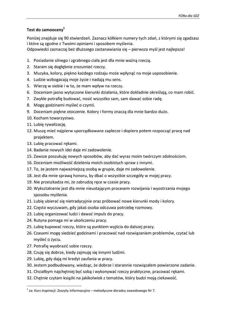FORa dla SDZ Test do samooceny1 Poniżej znajduje się 90 stwierdzeń. Zaznacz kółkiem numery tych zdań, z którymi się zgadzasz i które są zgodne z Twoimi opiniami i sposobem myślenia. Odpowiedzi zaznaczaj beż dłuższego zastanawiania się – pierwsza myśl jest najlepsza! 1. Posiadanie silnego i zgrabnego ciała jest dla mnie ważną rzeczą. 2. Staram się dogłębnie zrozumieć rzeczy. 3. Muzyka, kolory, piękno każdego rodzaju może wpłynąć na moje usposobienie. 4. Ludzie wzbogacają moje życie i nadają mu sens. 5. Wierzę w siebie i w to, że mam wpływ na rzeczy. 6. Doceniam jasno wytyczone kierunki działania, które dokładnie określają, co mam robić. 7. Zwykle potrafię budować, nosić wszystko sam, sam dawać sobie radę. 8. Mogę godzinami myśleć o czymś. 9. Doceniam piękne otoczenie. Kolory i formy znaczą dla mnie bardzo dużo. 10. Kocham towarzystwo. 11. Lubię rywalizację. 12. Muszę mieć najpierw uporządkowane zaplecze i dopiero potem rozpocząć pracę nad projektem. 13. Lubię pracować rękami. 14. Badanie nowych idei daje mi zadowolenie. 15. Zawsze poszukuję nowych sposobów, aby dać wyraz moim twórczym zdolnościom. 16. Doceniam możliwość dzielenia moich osobistych spraw z innymi. 17. To, że jestem najważniejszą osobą w grupie, daje mi zadowolenie. 18. Jest dla mnie sprawą honoru, by dbać o wszystkie szczegóły w mojej pracy. 19. Nie przeszkadza mi, że zabrudzę ręce w czasie pracy. 20. Wykształcenie jest dla mnie nieustającym procesem rozwijania i wyostrzania mojego sposobu myślenia. 21. Lubię ubierać się nietradycyjnie oraz próbować nowe kierunki mody i kolory. 22. Często wyczuwam, gdy jakaś osoba odczuwa potrzebę rozmowy. 23. Lubię organizować ludzi i dawać impuls do pracy. 24. Rutyna pomaga mi w ukończeniu pracy. 25. Lubię kupować rzeczy, które są punktem wyjścia do dalszej pracy. 26. Czasami mogę siedzieć godzinami i pracować nad rozwiązaniem problemów, czytać lub myśleć o życiu. 27. Potrafię wyobrazić sobie rzeczy. 28. Czuję się dobrze, kiedy zajmuję się innymi ludźmi. 29. Lubię, gdy dają mi kredyt zaufania w pracy. 30. Jestem podbudowany, wiedząc, że dobrze i starannie rozwiązałem powierzone zadanie. 31. Chciałbym najchętniej być sobą i wykonywać rzeczy praktyczne, pracować rękami. 32. Chętnie czytam książki na jakikolwiek z tematów, który budzi moją ciekawość. 1 za: Kurs Inspiracji. Zeszyty informacyjno – metodyczne doradcy zawodowego Nr 7. FORa dla SDZ 33. Lubię wprowadzać w życie nowe pomysły. 34. W sytuacji, gdy mam jakieś problemy z innymi, preferuję rozmowę i znalezienie rozwiązania. 35. Żeby osiągnąć sukces, należy mierzyć wysoko. 36. Lubię sytuacje, które wymagają ode mnie podejmowania decyzji i brania za nie odpowiedzialności. 37. Lubię dyskutować. 38. Analizuję dany problem gruntownie, zanim podejmę działania. 39. Lubię zmieniać otoczenie tak, aby uczynić je czymś innym i specjalnym. 40. Kiedy jest mi przykro, znajduję przyjaciela, by z nim porozmawiać. 41. Kiedy proponuję plan, wolę żeby inni zajmowali się szczegółami. 42. Zwykle jestem zadowolony z miejsca, gdzie przebywam. 43. Praca na świeżym powietrzu dostarcza mi nowego zasobu energii. 44. Bez przerwy zadaję pytanie „dlaczego?". 45. Podoba mi się, że moja praca jest wyrazem mojego nastroju i uczuć. 46. Lubię znajdować sposoby pomagania ludziom, by byli bardziej ludzcy wobec siebie. 47. Branie udziału w podejmowaniu ważnych decyzji jest niezmiernie ciekawe. 48. Zawsze cieszę się, gdy ktoś inny przejmuje kierownictwo. 49. Lubię, gdy moje otoczenie jest proste i praktyczne. 50. Roztrząsam problem, dopóki nie znajdę odpowiedzi. 51. Piękno natury porusza coś ukrytego we mnie. 52. Bliskie stosunki z innymi są dla mnie ważne. 53. Lepsze stanowisko i awans są dla mnie ważne. 54. Efektywność to coś dla mnie - pracować określoną ilość godzin każdego dnia. 55. Dla uniknięcia chaosu potrzebny jest silny system z ustalonym prawem i porządkiem. 56. Książki zmuszające do myślenia zawsze poszerzają moje horyzonty. 57. Bardzo cieszę się z możliwości pójścia na wystawę, do teatru czy do kina. 58. „Nie widziałem cię długi czas powiedz, co u ciebie?”. 59. Niezmiernie ciekawą rzeczą jest możliwość wpływania na innych ludzi. 60. Kiedy przyrzekam, że coś zrobię, wykonuję to do najdrobniejszego szczegółu. 61. Solidna, fizyczna i twarda praca nikomu nie zaszkodzi. 62. Chciałbym nauczyć się wszystkiego, co jest dostępne o tematach, które mnie interesują. 63. Nie chcę być jak inni, lubię robić rzeczy inaczej. 64. „Powiedz mi, jak ci mogę pomóc". 65. Jestem gotów podjąć ryzyko, by kontynuować sprawy dalej. 66. Lubię jasne i precyzyjne linie postępowania, kiedy coś zaczynam. 67. Pierwsze, co widzę w samochodzie, to dobry silnik. 68. Ci ludzie działają stymulująco na mój intelekt. 69. Kiedy czymś się zajmuję, mam tendencję do zapominania o całym świecie. 70. Martwi mnie, że jest tylu ludzi w naszym społeczeństwie, którzy potrzebują pomocy. 71. Zabawnie jest podsuwać innym ludziom pomysły. FORa dla SDZ 72. Nie znoszę, kiedy ktoś bez przerwy zmienia metodę, kiedy akurat kończę pisanie pracy. 73. Zwykle znajduję wyjście w sytuacjach „podbramkowych". 74. Nawet samo czytanie o odkryciach jest ciekawe. 75. Lubię robić happeningi. 76. Zawsze staram się, jak mogę, by okazać uwagę ludziom, którzy wyglądają na samotnych i bez przyjaciół. 77. Lubię działać. 78. Nie lubię robić rzeczy, które nie są zatwierdzone. 79. Sport jest ważny, jeśli ciało ma być zdrowe. 80. Sposób funkcjonowania natury budził zawsze moją ciekawość. 81. Zabawnie być w dobrym humorze i robić coś niezwyczajnego. 82. Sądzę, że ludzie w głębi duszy są dobrzy. 83. Jeśli nie daję sobie rady za pierwszym razem, rozpoczynam jeszcze raz z nową energią i entuzjazmem. 84. Cenię wysoko s