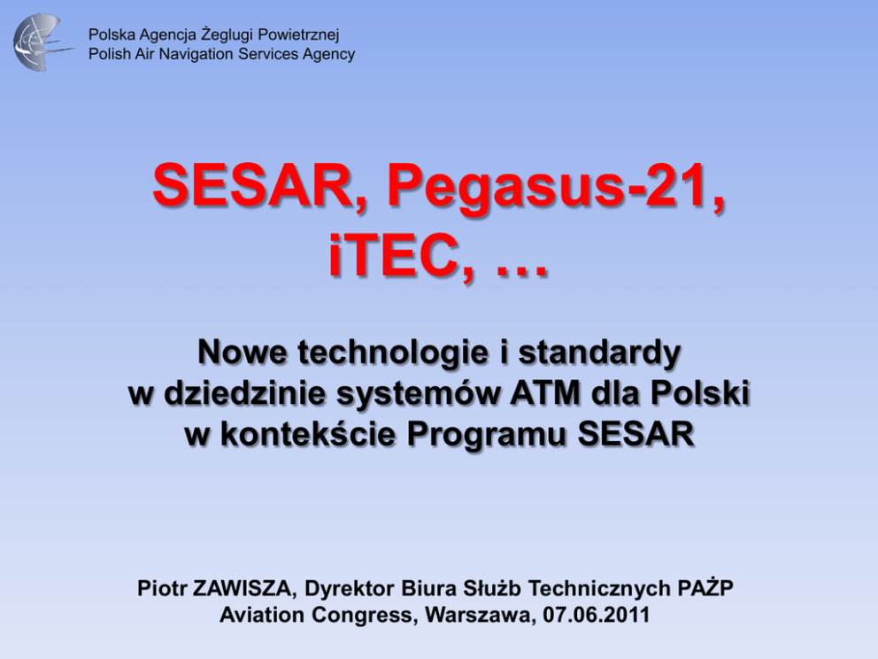Polska Agencja Żeglugi Powietrznej Polish Air Navigation Services Agency SESAR, Pegasus-21, iTEC, … Nowe technologie i standardy w dziedzinie systemów ATM dla Polski w kontekście Programu SESAR Piotr ZAWISZA, Dyrektor Biura Służb Technicznych PAŻP Aviation Congress, Warszawa, 07.06.2011 Polska Agencja Żeglugi Powietrznej Polish Air Navigation Services Agency Reforma instytucjonalna: Jednolita Europejska Przestrzeń Powietrzna „Single European Sky” Prawodawstwo SES przyjęte w roku 2004 (SES II w 2009), prowadzi do głębokiej reformy organizacyjnej systemu zapewniania służb żeglugi powietrznej w Europie: - NSA & ANSP; - Budowanie FAB; - Interoperacyjność; - Zmiany na rynku: - usług, - przemysłu Polska Agencja Żeglugi Powietrznej Polish Air Navigation Services Agency SESAR: Technologiczny komponent SES Single European Sky ATM Research • Projekt zmierzający do realizacji europejskiego systemu zarządzania ruchem lotniczym nowej generacji; • Technologiczny komponent Jednolitej Europejskiej Przestrzeni Powietrznej; • Projekt z zakresu europejskich badań i innowacji technologicznych; • Odpowiedź WE na zalecenia Rady Konsultacyjnej w Zakresie Badań Aeronautycznych w Europie (ACARE) w sprawie zmian w systemie kontroli ruchu lotniczego; • Jednolity program dla Europy, biorący pod uwagę potrzeby przemysłu, użytkowników przestrzeni powietrznej, instytucji zapewniających służby żeglugi powietrznej, wojska, personelu… Polska Agencja Żeglugi Powietrznej Polish Air Navigation Services Agency SESAR – główne zadania 1. 2. 3. 4. 5. Opracowanie systemu zarządzania ruchem lotniczym nowej generacji w Europie; Opracowanie programu stopniowej modernizacji systemu ATM; Synchronizacja planów i działań uczestników programu w zakresie ATM; Efektywne zarządzanie środkami przeznaczonymi na modernizację systemu ATM w Europie, w odniesieniu do infrastruktury naziemnej i pokładowej; Inicjatywa mająca, w perspektywie długoterminowej (do 2020 roku), doprowadzić do zwiększenia płynności i bezpieczeństwa transportu lotniczego; Polska Agencja Żeglugi Powietrznej Polish Air Navigation Services Agency Cele programu SESAR (wg Komisji Europejskiej) „…celem programu SESAR jest stworzenie systemu ATM nowej generacji, który zapewni skuteczne zarządzaniem ruchem lotniczym w realiach operacyjnych prognozowanych na rok 2020…” • 3x krotne zwiększenie przepustowości przestrzeni powietrznej, co doprowadzi do ograniczenia liczby opóźnień startów i lądowań • 10x krotna poprawa wskaźników bezpieczeństwa • 10% ograniczenie negatywnego wpływu ruchu lotniczego na środowisko naturalne • 50% obniżenie kosztów związanych z zapewnianiem służb ruchu lotniczego dla użytkowników przestrzeni powietrznej Polska Agencja Żeglugi Powietrznej Polish Air Navigation Services Agency SESAR ATM Cele Koncepcyjne… Polska Agencja Żeglugi Powietrznej Polish Air Navigation Services Agency iTEC INDRA “Wielkie narzędzie zmian SESAR…” 1. Członkowie Założyciele Projektu iTEC: AENA (Hiszpania), DFS (Niemcy) and NATS (Anglia) oraz Indra (Hiszpania) uzgodnili w 2004 Specyfikację Systemową, zawierającą: Wymagania modułu FDP (przetwarzanie planów lotu) Wymagania sprzętowe: nowa platforma systemowa pozwalająca na elastyczną konfigurację sprzętową 2. Kooperacja iTEC – DFS/AENA/NATS: Podział kosztów prac developerskich Współdzielenie pomiędzy ANSPs ryzyka wdrożenia nowych technologii Polska Agencja Żeglugi Powietrznej Polish Air Navigation Services Agency System ATM PEGASUS-21… Pierwszy krok PAŻP w kierunku nowych technologii SESAR Program „PEGASUS_21” (Polish Enhanced Generation ATC System for Unified Solutions of 21st Century) Polska Agencja Żeglugi Powietrznej Polish Air Navigation Services Agency System ATM Pegasus-21 WZROST RUCHU LOTNICZEGO Redukcja obciążenia KRL poprzez: Optymalizacja interfejsu HMI (elektroniczne paski postępu lotu) Rozbudowane funkcjonalność „cichej koordynacji” Narzędzia FASTI (MTCD, SYSCO, MONA) Narzędzia pseudo-VERA Ogólnopolska integracja systemowa ośrodków TWR, APP, ACC, FIS i OAT – jeden plan lotu i jeden track systemowy dla wszystkich służb krl ZMIANY TECHNOLOGICZNE Nowoczesne systemy bazo-danowe: statyczne i dynamiczne Najnowsze platformy systemowe i sprzętowe Nowe techniki dozorowania (MLAT, ADS-B, Mode S) Nowe formaty danych (e.g. ASTERIX, ADEXP, AMHS, FMTP) Nowoczesne techniki komunikacyjne (e.g. CPDLC) Polska Agencja Żeglugi Powietrznej Polish Air Navigation Services Agency System Pegasus-21ATM… cd PRZESTRZEŃ POWIETRZNA System PEGASUS_21 zbudowany w oparciu o kalkulację trajektori lotu celem implementacji podziału przestrzeni powietrznej Upp/Low BEZPIECZEŃSTWO Wiarygodne przetwarzanie i dystrybucja danych Stabilność i wydajność nowego systemu ATM SES / SESAR oraz interoperacyjność architektury systemu Interoperacyjność systemowa jako „wstęp” do FAB Dostawca systemu P-21, firma INDRA gwarancją bezpośredniej drogi do Projektu i-TEC Nowe funkcje/narzędzia systemowe dla krl i służb technicznych Wymagania interoperacyjności (EC 552/2004, EC 1032/2006) oraz Wymagania software’owe (ESARR6, EC 482/2008) Integracja Polska Agencja Żeglugi Powietrznej Polish Air Navigation Services Agency FDP - Flight Data Processing Przetwarzanie Danych Planów Lotu Procesowanie danych AFTN/AMHS Procesowanie depesz AUP (Airspace User Plan), zgodnie z koncepcją FUA (Flexible Use of Airspace) Depesze koordynacyjne OLDI (On-Line Data Interchange): podstawowe i rozszerzone Plany lotu (FPL, RPL) przetwarzane wg formatu ICAO i ADEXP Architektura 4D trajektorii lotu, aktualizowana danymi radarowymi RAM - Route Adherence Monitoring MTCD - Medium Term Conflict Detection; Rozbudowany interfejs przetwarzania, zobrazowania i wizualizacji danych meteo i NOTAM; Dedykowany interfejs dla danych Billing’owych; Funkcjonalność CCAMS (Centralised SSR Code Assignment and Management) Impl
