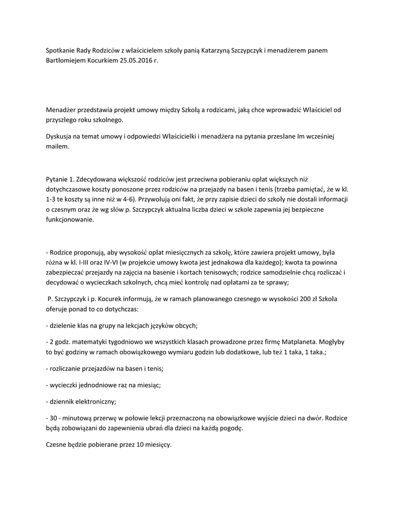 Spotkanie Rady Rodziców z właścicielem szkoły panią Katarzyną Szczypczyk i menadżerem panem Bartłomiejem Kocurkiem 25.05.2016 r. Menadżer przedstawia projekt umowy między Szkołą a rodzicami, jaką chce wprowadzić Właściciel od przyszłego roku szkolnego. Dyskusja na temat umowy i odpowiedzi Właścicielki i menadżera na pytania przesłane Im wcześniej mailem. Pytanie 1. Zdecydowana większość rodziców jest przeciwna pobieraniu opłat większych niż dotychczasowe koszty ponoszone przez rodziców na przejazdy na basen i tenis (trzeba pamiętać, że w kl. 1-3 te koszty są inne niż w 4-6). Przywołują oni fakt, że przy zapisie dzieci do szkoły nie dostali informacji o czesnym oraz że wg słów p. Szczypczyk aktualna liczba dzieci w szkole zapewnia jej bezpieczne funkcjonowanie. - Rodzice proponują, aby wysokość opłat miesięcznych za szkołę, które zawiera projekt umowy, była różna w kl. I-III oraz IV-VI (w projekcie umowy kwota jest jednakowa dla każdego); kwota ta powinna zabezpieczać przejazdy na zajęcia na basenie i kortach tenisowych; rodzice samodzielnie chcą rozliczać i decydować o wycieczkach szkolnych, chcą mieć kontrolę nad opłatami za te sprawy; P. Szczypczyk i p. Kocurek informują, że w ramach planowanego czesnego w wysokości 200 zł Szkoła oferuje ponad to co dotychczas: - dzielenie klas na grupy na lekcjach języków obcych; - 2 godz. matematyki tygodniowo we wszystkich klasach prowadzone przez firmę Matplaneta. Mogłyby to być godziny w ramach obowiązkowego wymiaru godzin lub dodatkowe, lub też 1 taka, 1 taka.; - rozliczanie przejazdów na basen i tenis; - wycieczki jednodniowe raz na miesiąc; - dziennik elektroniczny; - 30 - minutową przerwę w połowie lekcji przeznaczoną na obowiązkowe wyjście dzieci na dwór. Rodzice będą zobowiązani do zapewnienia ubrań dla dzieci na każdą pogodę. Czesne będzie pobierane przez 10 miesięcy. RR przedstawiła opinię, opierając się min. na informacjach od innych rodziców, że finansowanie wycieczek jednodniowych z czesnego nie spotka się z uznaniem wiekszości rodziców. Wewnątrzklasowy system organizacji i finansowania takich wyjazdów daje rodzicom realny wpływ na miejsce i jakość wyjazdów oraz kontrolę nad wydatkami. P. Szczypczyk i p. Kocurek przyjęli ten punkt widzenia. P. Kocurek stwierdził, że w takiej sytuacji wysokość czesnego trzeba obliczyć jeszcze raz. W domyśle - będzie niższe niż 200 zł. Szczegółowy system przyznawania ulg oraz zwalniania z czesnego nie został przedstawiony. -Rodzice podkreślają konieczność jasnego sprecyzowania warunków rozwiązania umowy, określenia wypadków losowych, które zwalniałyby ze zwrotu równowartości subwencji; określenia ile wynosi subwencja na dziecko miesięcznie w tym roku (podanie zastrzeżenia, że ta kwota ulega zmianie niezależnie od właściciela), podanie innych warunków rozwiązania umowy. Pytanie 2. W przyszłym roku szkolnym będziemy mieć w szkole nowego dyrektora, nowych nauczycieli matematyki, historii, muzyki, być może innego pedagoga. Nie wiadomo, czy wróci pani Banaś. Szczególnie dla rodziców dzieci z klas IV-VI jest to dużo nowości, a jednocześnie dużo niewiadomych. Powstaje pytanie ile osób zdecyduje się w ciemno podpisać umowę na cały rok z zapisem o zwrocie równowartości subwencji. - Rodzice podkreślają konieczność przedstawienia listy nauczycieli - tych którzy pozostają w szkole, oraz nowych, przedstawienia w kilku zdaniach nowych nauczycieli (jakie jest ich doświadczenie zawodowe, gdzie są już zatrudnieni); ujęcie na tej liście nauczycieli zatrudnionych do pracy na świetlicy (obecna sytuacja braku nauczycieli, sytuacje chorobowe, wyjazdy na wycieczki nauczycieli, powodują dużą destabilizację w procesie edukacyjnym dzieci) P. Szczypczyk i p. Kocurek przedstawili nazwiska osób, które rozpoczną pracę we wrześniu: matematyka - p. Anna Gawlik informatyka i obsługa IT- p. Tomasz Palonek muzyka - p. Ewa Grabias historia - p. Starzyńska O każdym powiedzieli kilka słów. 3. Czy Szkoła przewiduje poznanie reakcji rodziców na ewentualne wprowadzenie opłat np. za pomocą ankiety po ogłoszeniu projektu zmian? - Pani Właścicielka stwierdziła, że przeprowadzone dotychczas ankiety nie udawały się ze względu na zbyt małe zaangażowanie rodziców (tylko 30% ankiet wracało – wynik nie był wiarygodny), dlatego nie jest skłonna przeprowadzić ankietę w sprawie umowy lub czesnego. - RR proponuje, żeby Właściciele lub menadżer zwrócili się do wszystkich rodziców dzieci szkolnych (rozesłanie maili do wszystkich rodziców i zawieszenie pisemnej informacji na tablicy ogłoszeń)z informacją o planowanych zmianach, ze szczegółowym określeniem czego będą dotyczyły. P. Szczypczyk i p. Kocurek przystają na tę propozycję. Informują, że z ostateczną decyzją o ofercie Szkoły na przyszły rok czekają do piątku 3 czerwca, kiedy to odbędą się w 2 klasach lekcje pokazowe Matplanety. RR podkreśla, że informacja dla ogółu rodziców powinna zostać wysłana przed końcem maja, tak jak to obiecano na zebraniu z rodzicami. 4. Rodzicom bardziej zależy na wzmocnieniu pozycji i lepszym wykorzystaniu wiedzy i umiejętności już zatrudnionych nauczycieli przedmiotowych (kółka zainteresowań, godz. tematyczne w czasie świetlicowym), niż na wprowadzaniu zupełnie nowych zajęć. P. Szczypczyk i p. Kocurek zapewniają, że do świetlicy zatrudniona będzie nowa osoba od połowy czerwca, a w przyszłym roku będzie tam pracować jedna lub dwie osoby, zależnie od potrzeb. Nauczyciele przedmiotowi swoje godziny wypracowywać będą na zajęciach z przedmiotów, w tym wyrównawczych, kółkach zainteresowań, przygotowaniach do konkursów itp. RR podniosła kwestię wykorzystania rzutnika i tablicy multimedialnej. Wydaje się, że nie wszyscy nauczyciele ummieją korzystać z tych narzędzi. Szkoła zobowiązała się do roze
