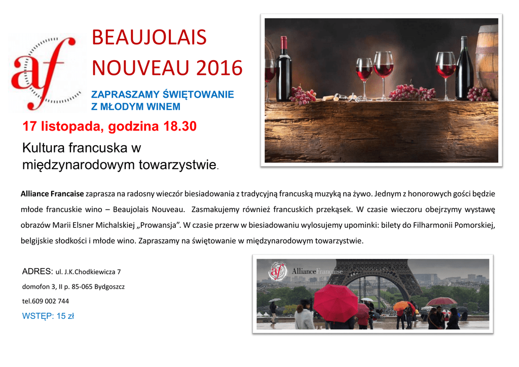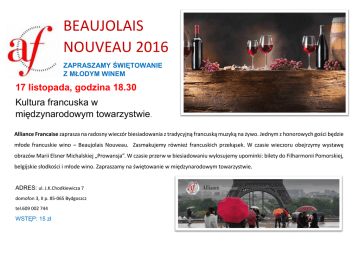 BEAUJOLAIS NOUVEAU 2016 ZAPRASZAMY ŚWIĘTOWANIE Z MŁODYM WINEM 17 listopada, godzina 18.30 Kultura francuska w międzynarodowym towarzystwie. Alliance Francaise zaprasza na radosny wieczór biesiadowania z tradycyjną francuską muzyką na żywo. Jednym z honorowych gości będzie młode francuskie wino – Beaujolais Nouveau. Zasmakujemy również francuskich przekąsek. W czasie wieczoru obejrzymy wystawę obrazów Marii Elsner Michalskiej „Prowansja”. W czasie przerw w biesiadowaniu wylosujemy upominki: bilety do Filharmonii Pomorskiej, belgijskie słodkości i młode wino. Zapraszamy na świętowanie w międzynarodowym towarzystwie. ADRES: ul. J.K.Chodkiewicza 7 domofon 3, II p. 85-065 Bydgoszcz tel.609 002 744 WSTĘP: 15 zł