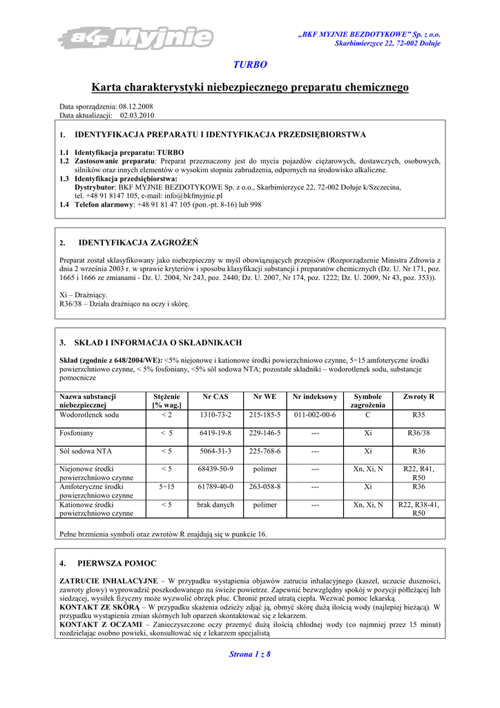 „BKF MYJNIE BEZDOTYKOWE” Sp. z o.o. Skarbimierzyce 22, 72-002 Dołuje TURBO Karta charakterystyki niebezpiecznego preparatu chemicznego Data sporządzenia: 08.12.2008 Data aktualizacji: 02.03.2010 1. IDENTYFIKACJA PREPARATU I IDENTYFIKACJA PRZEDSIĘBIORSTWA 1.1 Identyfikacja preparatu: TURBO 1.2 Zastosowanie preparatu: Preparat przeznaczony jest do mycia pojazdów cięŜarowych, dostawczych, osobowych, silników oraz innych elementów o wysokim stopniu zabrudzenia, odpornych na środowisko alkaliczne. 1.3 Identyfikacja przedsiębiorstwa: Dystrybutor: BKF MYJNIE BEZDOTYKOWE Sp. z o.o., Skarbimierzyce 22, 72-002 Dołuje k/Szczecina, tel. +48 91 8147 105, e-mail: [email protected] 1.4 Telefon alarmowy: +48 91 81 47 105 (pon.-pt. 8-16) lub 998 2. IDENTYFIKACJA ZAGROśEŃ Preparat został sklasyfikowany jako niebezpieczny w myśl obowiązujących przepisów (Rozporządzenie Ministra Zdrowia z dnia 2 września 2003 r. w sprawie kryteriów i sposobu klasyfikacji substancji i preparatów chemicznych (Dz. U. Nr 171, poz. 1665 i 1666 ze zmianami - Dz. U. 2004, Nr 243, poz. 2440; Dz. U. 2007, Nr 174, poz. 1222; Dz. U. 2009, Nr 43, poz. 353)). Xi – DraŜniący. R36/38 – Działa draŜniąco na oczy i skórę. 3. SKŁAD I INFORMACJA O SKŁADNIKACH Skład (zgodnie z 648/2004/WE): <5% niejonowe i kationowe środki powierzchniowo czynne, 5÷15 amfoteryczne środki powierzchniowo czynne, < 5% fosfoniany, <5% sól sodowa NTA; pozostałe składniki – wodorotlenek sodu, substancje pomocnicze Nazwa substancji niebezpiecznej Wodorotlenek sodu StęŜenie [% wag.] <2 Nr CAS Nr WE Nr indeksowy Zwroty R 011-002-00-6 Symbole zagroŜenia C 1310-73-2 215-185-5 Fosfoniany < 5 6419-19-8 229-146-5 --- Xi R36/38 Sól sodowa NTA <5 5064-31-3 225-768-6 --- Xi R36 Niejonowe środki powierzchniowo czynne Amfoteryczne środki powierzchniowo czynne Kationowe środki powierzchniowo czynne <5 68439-50-9 polimer --- Xn, Xi, N 5÷15 61789-40-0 263-058-8 --- Xi R22, R41, R50 R36 <5 brak danych polimer --- Xn, Xi, N R35 R22, R38-41, R50 Pełne brzmienia symboli oraz zwrotów R znajdują się w punkcie 16. 4. PIERWSZA POMOC ZATRUCIE INHALACYJNE – W przypadku wystąpienia objawów zatrucia inhalacyjnego (kaszel, uczucie duszności, zawroty głowy) wyprowadzić poszkodowanego na świeŜe powietrze. Zapewnić bezwzględny spokój w pozycji półleŜącej lub siedzącej, wysiłek fizyczny moŜe wyzwolić obrzęk płuc. Chronić przed utratą ciepła. Wezwać pomoc lekarską. KONTAKT ZE SKÓRĄ – W przypadku skaŜenia odzieŜy zdjąć ją, obmyć skórę duŜą ilością wody (najlepiej bieŜącą). W przypadku wystąpienia zmian skórnych lub oparzeń skontaktować się z lekarzem. KONTAKT Z OCZAMI – Zanieczyszczone oczy przemyć duŜą ilością chłodnej wody (co najmniej przez 15 minut) rozdzielając osobno powieki, skonsultować się z lekarzem specjalistą Strona 1 z 8 „BKF MYJNIE BEZDOTYKOWE” Sp. z o.o. Skarbimierzyce 22, 72-002 Dołuje TURBO PO POŁKNIĘCIU – W przypadku spoŜycia nie wywoływać wymiotów. Podać do wypicia duŜą ilość wody. Nie podawać środków zobojętniających. Niezwłocznie skonsultować się z lekarzem, jeŜeli to moŜliwe pokazać etykietę. 5. POSTĘPOWANIE W PRZYPADKU POśARU PRODUKT NIEPALNY. ŚRODKI GAŚNICZE WŁAŚCIWE ZE WZGLĘDU NA RODZAJ PREPARATU: poŜary w obecności preparatu gasić środkami gaśniczymi odpowiednimi do palącego się otoczenia. ŚRODKI GAŚNICZE, KTÓRYCH NIE WOLNO UśYWAĆ ZE WZGLĘDÓW BEZPIECZEŃSTWA: nie są znane środki gaśnicze, których nie wolno stosować. SZCZEGÓLNE ZAGROśENIA: preparat niepalny. ŚRODKI OCHRONY INDYWIDUALNEJ DLA STRAśAKÓW: stosować środki izolujące drogi oddechowe i ubranie ochronne. DODATKOWE INFORMACJE: W przypadku poŜaru zawiadomić osoby znajdujące się w pobliŜu o poŜarze, usunąć z obszaru zagroŜenia osoby postronne, powiadomić StraŜ PoŜarną. JeŜeli to moŜliwe usunąć zbiorniki z preparatem z dala od działania ognia i wysokiej temperatury. JeŜeli to niemoŜliwe wówczas chłodzić zbiorniki znajdujące się w pobliŜu ognia poprzez spryskiwanie strumieniem wody. Pozostałości po spaleniu muszą zostać całkowicie usunięte. 6. POSTĘPOWANIE W PRZYPADKU NIEZAMIERZONEGO UWOLNIENIA DO ŚRODOWISKA ŚRODKI OCHRONY OSOBISTEJ: odzieŜ ochronna; aparat izolujący drogi oddechowe; rękawice ochronne; okulary ochronne. Unikać bezpośredniego kontaktu ze skórą i oczami; zapewnić odpowiednią wentylację. POSTĘPOWANIE: W przypadku niezamierzonego uwolnienia się preparatu do środowiska powiadomić o awarii oraz usunąć źródła zapłonu. Zabezpieczyć studzienki ściekowe poprzez ich obwałowanie, nie dopuścić do przedostania się preparatu do wód powierzchniowych i gruntowych; unikać bezpośredniego kontaktu z uwalniającą się substancją. O ile to moŜliwe zlikwidować wyciek (zamknąć dopływ cieczy, uszczelnić, uszkodzone opakowanie umieścić w szczelnym opakowaniu ochronnym). Podczas duŜego wycieku miejsce gromadzenia się cieczy obwałować, zebraną ciecz odpompować. Małe ilości rozlanego preparatu posypać niepalnym materiałem chłonnym (piasek, ziemia, trociny, ziemia okrzemkowa, zmielony wapień), a następnie umieścić w oznakowanym, zamykanym pojemniku – przekazać do utylizacji. Zanieczyszczoną powierzchnię spłukać wodą. 7. POSTĘPOWANIE Z PREPARATEM I JEGO MAGAZYNOWANIE 7.1. POSTĘPOWANIE Z PREPARATEM Podczas pracy z preparatem zalecana jest ostroŜność. Wymagane stosowanie odpowiednich środków ochrony indywidualnej – patrz punkt 8. Mieszać preparat wyłącznie z wodą. Nie mieszać preparatu z innymi preparatami chemicznymi. Osoby ze skłonnością do alergii skórnej lub układu oddechowego nie powinny mieć kontaktu z preparatem. Unikać naraŜenia – przed uŜyciem zapoznać się z instrukcją stosowania. Po zastosowaniu pojemnik szczelnie zamknąć, przechowywać z dala od osób nieupowaŜnionych. Podczas pracy z preparatem zapewnić odpowiednią we