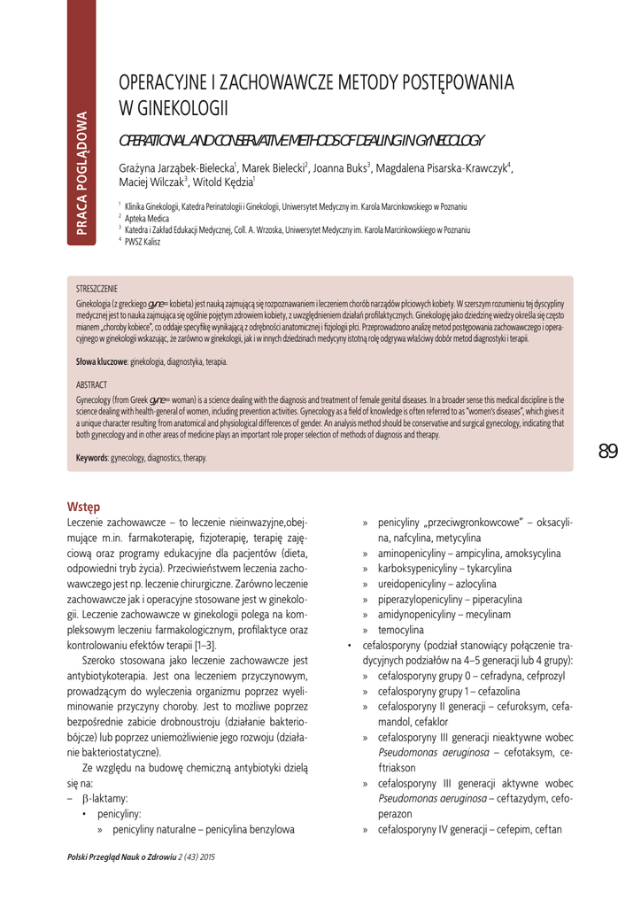 PRACA POGLĄDOWA OPERACYJNE I ZACHOWAWCZE METODY POSTĘPOWANIA W GINEKOLOGII OPERATIONAL AND CONSERVATIVE METHODS OF DEALING IN GYNECOLOGY Grażyna Jarząbek-Bielecka1, Marek Bielecki2, Joanna Buks3, Magdalena Pisarska-Krawczyk4, Maciej Wilczak3, Witold Kędzia1 1 2 3 4 Klinika Ginekologii, Katedra Perinatologii i Ginekologii, Uniwersytet Medyczny im. Karola Marcinkowskiego w Poznaniu Apteka Medica Katedra i Zakład Edukacji Medycznej, Coll. A. Wrzoska, Uniwersytet Medyczny im. Karola Marcinkowskiego w Poznaniu PWSZ Kalisz STRESZCZENIE Ginekologia (z greckiego gyne = kobieta) jest nauką zajmującą się rozpoznawaniem i leczeniem chorób narządów płciowych kobiety. W szerszym rozumieniu tej dyscypliny medycznej jest to nauka zajmująca się ogólnie pojętym zdrowiem kobiety, z uwzględnieniem działań profilaktycznych. Ginekologię jako dziedzinę wiedzy określa się często mianem „choroby kobiece”, co oddaje specyfikę wynikającą z odrębności anatomicznej i fizjologii płci. Przeprowadzono analizę metod postępowania zachowawczego i operacyjnego w ginekologii wskazując, że zarówno w ginekologii, jak i w innych dziedzinach medycyny istotną rolę odgrywa właściwy dobór metod diagnostyki i terapii. Słowa kluczowe: ginekologia, diagnostyka, terapia. ABSTRACT Gynecology (from Greek gyne = woman) is a science dealing with the diagnosis and treatment of female genital diseases. In a broader sense this medical discipline is the science dealing with health-general of women, including prevention activities. Gynecology as a field of knowledge is often referred to as “women’s diseases”, which gives it a unique character resulting from anatomical and physiological differences of gender. An analysis method should be conservative and surgical gynecology, indicating that both gynecology and in other areas of medicine plays an important role proper selection of methods of diagnosis and therapy. Keywords: gynecology, diagnostics, therapy. Wstęp Leczenie zachowawcze – to leczenie nieinwazyjne,obejmujące m.in. farmakoterapię, fizjoterapię, terapię zajęciową oraz programy edukacyjne dla pacjentów (dieta, odpowiedni tryb życia). Przeciwieństwem leczenia zachowawczego jest np. leczenie chirurgiczne. Zarówno leczenie zachowawcze jak i operacyjne stosowane jest w ginekologii. Leczenie zachowawcze w ginekologii polega na kompleksowym leczeniu farmakologicznym, profilaktyce oraz kontrolowaniu efektów terapii [1–3]. Szeroko stosowana jako leczenie zachowawcze jest antybiotykoterapia. Jest ona leczeniem przyczynowym, prowadzącym do wyleczenia organizmu poprzez wyeliminowanie przyczyny choroby. Jest to możliwe poprzez bezpośrednie zabicie drobnoustroju (działanie bakteriobójcze) lub poprzez uniemożliwienie jego rozwoju (działanie bakteriostatyczne). Ze względu na budowę chemiczną antybiotyki dzielą się na: – β-laktamy: • penicyliny: » penicyliny naturalne – penicylina benzylowa Polski Przegląd Nauk o Zdrowiu 2 (43) 2015 • » penicyliny „przeciwgronkowcowe” – oksacylina, nafcylina, metycylina » aminopenicyliny – ampicylina, amoksycylina » karboksypenicyliny – tykarcylina » ureidopenicyliny – azlocylina » piperazylopenicyliny – piperacylina » amidynopenicyliny – mecylinam » temocylina cefalosporyny (podział stanowiący połączenie tradycyjnych podziałów na 4–5 generacji lub 4 grupy): » cefalosporyny grupy 0 – cefradyna, cefprozyl » cefalosporyny grupy 1 – cefazolina » cefalosporyny II generacji – cefuroksym, cefamandol, cefaklor » cefalosporyny III generacji nieaktywne wobec Pseudomonas aeruginosa – cefotaksym, ceftriakson » cefalosporyny III generacji aktywne wobec Pseudomonas aeruginosa – ceftazydym, cefoperazon » cefalosporyny IV generacji – cefepim, ceftan 89 – 90 – – – – – – – – » cefalosporyny V generacji aktywne wobec Pseudomonas aeruginosa – ceftobiprol » cefalosporyny V generacji nieaktywne wobec Pseudomonas aeruginosa – ceftarolina » cefamycyny – cefoksytyna • monobaktamy – aztreonam • karbapenemy: » karbapenemy grupy I – ertapenem » karbapenemy grupy II – imipenem, meropenem, doripenem » karbapenemy grupy III – tomopenem • trinemy – sanfetrinem • penemy – faropenem • inhibitory β-laktamaz – same w sobie przeważnie nie mają aktywności bakteriobójczej, stosuje się je w połączeniu z innymi antybiotykami, np. cefoperazon z sulbaktamem, amoksycylina z kwasem klawulanowym, piperacylina z tazobaktamem antybiotyki peptydowe • polipeptydy: » polimyksyny – kolistyna » gramicydyny » bacytracyna » fusafungina • streptograminy – chinuprystyna-dalfoprystyna • glikopeptydy: » I generacji – wankomycyna, teikoplanina » II generacji – orytawancyna • lipopeptydy – daptomycyna • glikolipopeptydy – dalbawancyna, telawancyna • glikolipodepsypeptydy – ramoplanina aminoglikozydy: • aminoglikozydy streptydynowe – streptomycyna • aminoglikozydy deoksystreptaminowe – gentamycyna, amikacyna, tobramycyna, netylmycyna • aminocyklitole – spektynomycyna tetracykliny: • tetracykliny właściwe – doksycyklina • glicylocykliny – tygecyklina makrolidy: • 14-węglowe – erytromycyna, klarytromycyna • 15-węglowe – azytromycyna • 16-węglowe – spiramycyna • ketolidy – telitromycyna • 18-węglowe (tiakumycyny) – difimycyna linkozamidy – klindamycyna, linkomycyna amfenikole – chloramfenikol rifamycyny – ryfampicyna, ryfaksymina pleuromutyliny – retapamulina mupirocyna Polski Przegląd Nauk o Zdrowiu 2 (43) 2015 – kwas fusydowy. Leki przeciwprątkowe (leczenie zakażeń wywołanych przez prątki – np. gruźlicy): – leki 1. rzutu – izoniazyd, ryfampicyna, pirazynamid, etambutol, streptomycyna – leki 2. rzutu – etionamid, klofazymina, kanamycyna, kapreomycyna, amikacyna, tobramycyna, wiomycyna, kwas p-aminosalicylowy, cykloseryna, ofloksacyna, cyprofloksacyna, lewofloksacyna, moksyflok