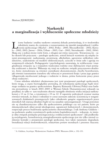 Mariusz JĘDRZEJKO Narkotyki a marginalizacja i wykluczenie społeczne młodzieży L iczne badania i analizy naukowe ostatniej dekady potwierdzają, iż w środowisku młodzieży mamy do czynienia z rozszerzaniem się zjawisk marginalizacji i wykluczenia społecznego (Machel – 2002, Pytka – 2000, Moczydłowski – 2002, Kawula – 2002, 2003, Jarosz – 2004, Urban – 2003, Gaś – 2002, Sierosławski – 2002, 2004). Mają one z jednej strony wiele form, z drugiej zaś różne nasycenie. Towarzyszą im – jako skutek lub przyczyna – patologie społeczne, wśród których wymienia się między innymi przestępczość, narkomanię, prostytucję, alkoholizm, agresywne subkultury młodzieżowe, uzależnienie od mediów elektronicznych, ucieczki w świat sekt i agresję we wzajemnych relacjach. Pedagogowie i psychologowie zauważają, że wykluczenie i marginalizacja związane są z rozpadem tradycyjnej rodziny oraz słabnięciem więzi pomiędzy rodzicami a dziećmi. Wskazuje się tutaj na rozliczne związki przyczynowo-skutkowe, które stymulowane są również czynnikami ekonomicznymi, choćby bezrobociem, jak również narastaniem transferu siły roboczej w przestrzeni kraju i poza jego granice (długotrwała nieobecność jednego z rodziców w domu, późne kończenie pracy przez oboje rodziców). Coraz młodsza młodzież obejmowana jest tymi przejawami patologii społecznych, które mogą, a często bezwzględnie prowadzą, do wykolejenia społecznego bądź swoistego zesłania na granice społeczeństwa. Raporty Komendy Głównej Policji oraz badania prowadzone w latach 2003–2005 w Wyższej Szkole Humanistycznej wskazały na przykład, że tylko w tym trzyletnim okresie nastąpiło obniżenie wieku inicjacji narkotykowej z 13 na 11 lat, a tytoniowej z 19 na 12. Z raportów policyjnych wysnuć można również wniosek, że dzieci i młodzież w coraz szerszym zakresie uczestniczą w zorganizowanych działaniach przestępczych (jako członkowie gangów organizowanych przez dorosłych lub starszą młodzież bądź też na zasadzie samoorganizacji). Uwagi powyższe nie są charakterystyczne tylko dla społeczeństwa polskiego czy też państw, które po dziesięcioleciach silnej presji ideologicznej, ograniczeń kulturowych i ekonomicznych, rozpoczęły proces budowania społeczeństwa obywatelskiego. I tak Anthony Giddens – na podstawie analizy rozwiniętych społeczeństw kapitalistycznych – wskazuje, że istnieje silny związek pomiędzy przestępczością a wykluczeniem społecznym1. Jak podkreślają socjologowie, konsekwencją zmarginalizowania społecznego jest nie tylko niemal codzienny kontakt z przejawami patologii społecznej, lecz także narastanie degradacji, brutalizacji relacji środowiskowych, relatywizm postaw moralnych i przemoc fizyczna. 1 A. Giddens, Socjologia, Wydawnictwo Naukowe PWN, Warszawa 2004, s. 352–353. 118 MARIUSZ JĘDRZEJKO To z kolei wypacza akceptowany społecznie system wartości lub też prowadzi do wykreowania zupełnie nowego systemu, obejmującego wartości, zasady i normy akceptowane w małej grupie, lecz całkowicie sprzeczne z normami ogólnospołecznymi (np. normy subkulturowe). Jak się wydaje, jednym z największych współczesnych zagrożeń w środowisku młodzieży jest zdeformowanie pojmowania klasycznych wartości, jakimi są prawda, dobro i miłość. Jest to skutek niepełnej formacji moralnej młodego pokolenia w relacjach rodzinnych, szkolnych oraz relacjach środowiskowych (społecznych). Warto zauważyć, że w świecie współczesnym marginalizacja połączona ze stygmatyzacją czy też wykluczeniem może mieć również podbudowę religijno-kulturową. Towarzyszą temu coraz silniejsze dysfunkcje społeczne oraz poszerzanie się liczby osób, które moglibyśmy zaliczyć do świata wykluczenia. Zjawiska, o których tutaj mowa, obecne są w różnych kulturach i społeczeństwach. Mają różne formy, często zupełnie nieznane w naszym społeczeństwie. Na przykład w Indiach mamy do czynienia z funkcjonowaniem bardzo licznej, bo piętnastomilionowej, kasty prostytutek. Stygmatyzacja dotyczy nie tylko ich samych, ale także ich dzieci, które pozostają bez szans na zdobycie wykształcenia i korzystania z pełni praw socjalnych. Ich przyszłość została naznaczona przez nakazy hinduizmu oraz nieformalne zasady społeczne, uniemożliwiające wyrwanie się ze świata patologii. W prowadzonych przez autora – na terenie Warszawy i miast mazowieckich – analizach i badaniach, dotyczących zależności pomiędzy różnymi przejawami patologii społecznej oraz marginalizacją i wykluczeniem – poszukiwano odpowiedzi na pytania, dotyczące interakcji i zależności, jakie mogą zachodzić między marginalizacją i wykluczeniem młodzieży a szczególnie niebezpieczną formą patologii społecznej – narkomanią. Na podstawie wielu badań i analiz z ostatniej dekady można postawić uwiarygodnioną tezę, że narkomania jest jedną z najdynamiczniej rozwijających się patologii społecznych w Polsce. Jak wynika z danych policji oraz badań naukowych (Sierosławski – 2002, 2003; Łuczak – 2004; Cekiera – 2002; Jędrzejko – 2004, 2005) od 11 do 17% uczniów szkół ponadgimnazjalnych w ciągu ostatniego roku zażyło jeden z narkotyków, a niemal 7%–10% deklaruje, że sięga po nie częściej niż raz w miesiącu. W ostatnich badaniach, prowadzonych na populacji 5160 uczniów szkół gimnazjalnych i ponadgimnazjalnych na Mazowszu, autor uzyskał potwierdzenie dalszego rozwoju zagrożeń narkomanią. I tak wśród uczniów szkół gimnazjalnych ponad 9% zadeklarowało, że w ciągu ostatnich sześciu miesięcy więcej niż 20 razy zażyło jeden z narkotyków, a niemal 4%, że ma z nimi kontakt co najmniej raz w tygodniu. Z kolei w grupie licealistów dwudziestokrotne zażywanie narkotyku w ostatnim półroczu zadeklarowało 14%, a co najmniej raz w tygodniu w tym przedziale czasowym niemal 8%2. Z kolei w n