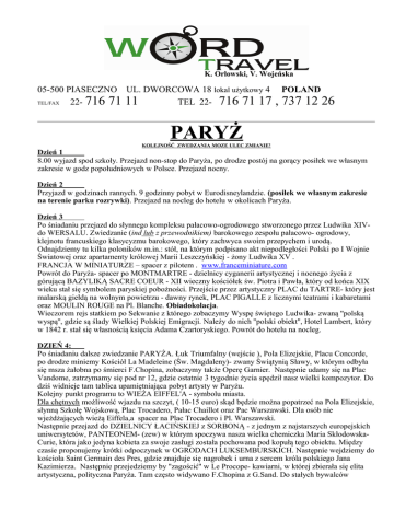 K. Orłowski, V. Wojeńska 05-500 PIASECZNO UL. DWORCOWA 18 lokal użytkowy 4 TEL/FAX 22- 716 71 11 TEL 22- 716 71 17 POLAND , 737 12 26 PARYŻ KOLEJNOŚĆ ZWEDZANIA MOZE ULEC ZMIANIE! Dzień 1 8.00 wyjazd spod szkoły. Przejazd non-stop do Paryża, po drodze postój na gorący posiłek we własnym zakresie w godz popołudniowych w Polsce. Przejazd nocny. Dzień 2 Przyjazd w godzinach rannych. 9 godzinny pobyt w Eurodisneylandzie. (posiłek we własnym zakresie na terenie parku rozrywki). Przejazd na nocleg do hotelu w okolicach Paryża. Dzień 3 Po śniadaniu przejazd do słynnego kompleksu pałacowo-ogrodowego stworzonego przez Ludwika XIVdo WERSALU. Zwiedzanie (ind lub z przewodnikiem) barokowego zespołu pałacowo- ogrodowy, klejnotu francuskiego klasycyzmu barokowego, który zachwyca swoim przepychem i urodą. Odnajdziemy tu kilka poloników m.in.: stół, na którym podpisano akt niepodległości Polski po I Wojnie Światowej oraz apartamenty królowej Marii Leszczyńskiej - żony Ludwika XV . FRANCJA W MINIATURZE – spacer z pilotem . www.franceminiature.com Powrót do Paryża- spacer po MONTMARTRE - dzielnicy cyganerii artystycznej i nocnego życia z górującą BAZYLIKĄ SACRE COEUR - XII wieczny kościółek św. Piotra i Pawła, który od końca XIX wieku stał się symbolem paryskiej pobożności. Przejście przez artystyczny PLAC du TARTRE- który jest malarską giełdą na wolnym powietrzu - dawny rynek, PLAC PIGALLE z licznymi teatrami i kabaretami oraz MOULIN ROUGE na Pl. Blanche. Obiadokolacja. Wieczorem rejs statkiem po Sekwanie z którego zobaczymy Wyspę świętego Ludwika- zwaną ''polską wyspą'', gdzie są ślady Wielkiej Polskiej Emigracji. Należy do nich ''polski obiekt'', Hotel Lambert, który w 1842 r. stał się własnością księcia Adama Czartoryskiego. Powrót do hotelu na nocleg. DZIEŃ 4: Po śniadaniu dalsze zwiedzanie PARYŻA. Łuk Triumfalny (wejście ), Pola Elizejskie, Placu Concorde, po drodze miniemy Kościół La Madeleine (Św. Magdaleny)- zwany Świątynią Sławy, w którym odbyła się msza żałobna po śmierci F.Chopina, zobaczymy także Operę Garnier. Następnie udamy się na Plac Vandome, zatrzymamy się pod nr 12, gdzie ostatnie 3 tygodnie życia spędził nasz wielki kompozytor. Do dziś widnieje tam tablica upamiętniająca pobyt artysty w Paryżu. Kolejny punkt programu to WIEŻA EIFFEL'A - symbolu miasta. Dla chętnych możliwość wjazdu na szczyt, ( 10-15 euro) skąd będzie można popatrzeć na Pola Elizejskie, słynną Szkołę Wojskową, Plac Trocadero, Pałac Chaillot oraz Pac Warszawski. Dla osób nie wjeżdżających wieżą Eiffela,a spacer na Plac Trocadero i Pl. Warszawski. Następnie przejazd do DZIELNICY ŁACIŃSKIEJ z SORBONĄ - z jednym z najstarszych europejskich uniwersytetów, PANTEONEM- (zew) w którym spoczywa nasza wielka chemiczka Maria SkłodowskaCurie, która jako jedyna kobieta za swoje zasługi została pochowana pod kopułą tego obiektu. Między czasie proponujemy krótki odpoczynek w OGRODACH LUKSEMBURSKICH. Następnie wejdziemy do kościoła Saint Germain des Pres, gdzie znajduje się nagrobek i urna z sercem króla polskiego Jana Kazimierza. Następnie przejedziemy by ''zagościć'' w Le Procope- kawiarni, w której zbierała się elita artystyczna, polityczna Paryża. Tam często widywano F.Chopina z G.Sand. Do stałych bywalców należeli również Diderot, Wolter, młody Napoleon. Na koniec PAŁAC INWALIDÓW (zew)- z grobowcem Napoleona. Po południu obiadokolacja. Przejazd do hotelu na nocleg. DZIEŃ 5: Po śniadaniu wykwaterowanie z hotelu. Przyjazd do PARYŻA (w tym dniu poruszamy się komunikacją miejską ze względu na odpoczynek kierowców przed nocnym przejazdem), zwiedzanie Paryża: CMENTARZ PERE LACHAISE - najsłynniejsza nekropolia Paryża, na której spoczywa nasz wielki rodak Fryderyk Chopin. Ponadto na cmentarzu znajdują się m.in. groby M. Walewskiej, E. Piaf, H. Balzaka, J. Morrisona, mauzoleum Abelarda i Heloizy. Przejazd na zwiedzanie: Wyspa CITE - najstarsza część miasta - Katedra Notre Dame - najwspanialszy zabytek sztuki sakralnej z XII wieku zachwycający lekkością architektury oraz wspaniałymi witrażami i kunsztownie wykonanymi portalami, następnie Pałac Sprawiedliwości - dawny Pałac Królewski, kościół Sainte Capelle i Pont Neuf - najstarszy most; zwrócimy uwagę na zegar Henryka Walezego z orłem koronnym i litewską Pogonią. Les Halles i Centrum Pompidou - z chwilą czasu wolnego na zakupy. Następnie zwiedzanie LUWRU ( indywidualne lub z przewodnikiem) - muzeum ze wspaniałą kolekcją arcydzieł sztuki europejskiej, m.in. Mona Liza - Leonarda da Vinci, Wenus z Milo, Nike z Samotraki. Na jego murach zewnętrznych znajduje się kilka płaskorzeźb znanych Polaków m.in. Marii Leszczyńskiej żony Ludwika XV, a w jednej z nisz w ścianie muzeum stoi posąg księcia Józefa Poniatowskiego. Obiadokolacja. Wieczorem wyjazd w drogę powrotną. Przejazd przez Niemcy do Polski. DZIEŃ 6: Przyjazd do Polski w godzinach wieczornych i zakończenie wycieczki. Świadczenia: -transport lux autokarem marki Mercedes, Volvo, Scania, z WC, DVD, barkiem, uchylnymi siedzeniami, -zakwaterowanie w hotelach ** w Paryżu, pokoje z łazienkami. -wyżywienie zg. z programem, -realizacja programu turystycznego, -opieka pilota, -ubezpieczenie AXA - KL 10 000 EURO, NW 1000 Euro Bagaż 200 Euro -VAT, -grupy 30 os - 2 miejsca gratis dla nauczycieli, od 30 do 45 os – 3 miejsca gratis dla nauczycieli. Cena: 500 zł + 150 euro /min. 40 os. Płacących + dodatkowo bilety wstępu zg. z programem: Francja w miniaturze Statek Eurodisneyland 60-80 euro + ewentualnie przewodnicy miejscowi! (w Wersalu i Luwrze jesli wejście jest grupowe obligatoryjne jest wynajęcie przewodnika, jesli młodzież jest do 25 lat - wejście ind - GRATIS) W celu podpisania umowy i rezerwacji konkretnego terminu prosimy o telefon do biura 022 716 71 11 lub 022 716 71 17 lub mail [email protected] Zaliczka koniec