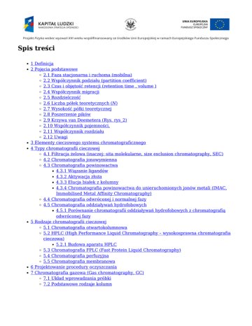 Spis treści 1 Definicja 2 Pojęcia podstawowe 2.1 Faza stacjonarna i ruchoma (mobilna) 2.2 Współczynnik podziału (partition coefficient) 2.3 Czas i objętość retencji (retention time , volume ) 2.4 Współczynnik migracji 2.5 Rozdzielczość 2.6 Liczba półek teoretycznych (N) 2.7 Wysokość półki teoretycznej 2.8 Poszerzenie pików 2.9 Krzywa van Deemetera (Rys. rys_2) 2.10 Współczynnik pojemności, 2.11 Współczynnik rozdziału 2.12 Uwagi 3 Elementy cieczowego systemu chromatograficznego 4 Typy chromatografii cieczowej 4.1 Filtracja żelowa (inaczej: sita molekularne, size exclusion chromatography, SEC) 4.2 Chromatografia jonowymienna 4.3 Chromatografia powinowactwa 4.3.1 Wiązanie ligandów 4.3.2 Aktywacja złoża 4.3.3 Elucja białek z kolumny 4.3.4 Chromatografia powinowactwa do unieruchomionych jonów metali (IMAC, Immobilised Metal Affinity Chromatography) 4.4 Chromatografia odwróconej i normalnej fazy 4.5 Chromatografia oddziaływań hydrofobowych 4.5.1 Porównanie chromatografii oddziaływań hydrofobowych z chromatografią odwróconej fazy 5 Rodzaje chromatografii cieczowej 5.1 Chromatografia otwartokolumnowa 5.2 HPLC (High Performance Liquid Chromatography – wysokosprawna chromatografia cieczowa) 5.2.1 Budowa aparatu HPLC 5.3 Chromatografia FPLC (Fast Protein Liquid Chromatography) 5.4 Chromatografia perfuzyjna 5.5 Chromatografia membranowa 6 Projektowanie procedury oczyszczania 7 Chromatografia gazowa (Gas chromatography, GC) 7.1 Układ wprowadzania próbki 7.2 Podstawowe rodzaje kolumn Definicja Początkowo chromatografia dotyczyła separacji barwników na składowe obserwowalne w świetle widzialnym. Jednym z pionierów tej techniki rozdziału substancji był Michaił Cwiet, który na Politechnice Warszawskiej w 1905 roku dokonał separacji barwników w sproszkowanym węglanie wapna (w kredzie). Obecnie chromatografia (gr. chromatos = barwa + grapho = pisze) to technika analityczna lub preparatywna służąca do badania (rozdzielania) składu mieszanin związków chemicznych. Wykorzystuje się w niej różnice w podziale składników mieszaniny między fazę stacjonarną i ruchomą. Pojęcia podstawowe Faza stacjonarna i ruchoma (mobilna) W chromatografii podział składników próbki odbywa się pomiędzy dwiema fazami, stacjonarną (np. złoże kolumny), do którego przyczepia się część składników próbki oraz ruchomą (np. bufor), razem z którą przemieszczają się inne składniki próbki pomiędzy ziarnami fazy stacjonarnej. Materiały tworzące fazę stacjonarną powinny być stabilne mechanicznie, niereaktywne chemicznie w warunkach ich zastosowań w chromatografii oraz powinny spełniać dodatkowe wymagania (hydrofobowość, powinowactwo do ligandu) związane ze konkretnym typem chromatografii. Typowe obojętne złoża to: celuloza, agaroza, sephadex, poliakrylamid, polistyren. Złoża te różnią się wielkością ziaren, porowatością itp. Do nich przyłącza się grupy aktywne związane ze stosowanym typem chromatografii. Skład fazy ruchomej jest ściśle związany z materiałem próbki oraz z zastosowana metodą chromatograficzną, może być ustalony, zmieniać się skokowo lub w sposób ciągły. Współczynnik podziału (partition coefficient) gdzie: — stężenie molekuł danego rodzaju w fazie stacjonarnej i mobilnej. K' zależy od warunków eksperymentu (temperatura, polarność roztworu itp.). Czas i objętość retencji (retention time , volume ) gdzie: f – szybkość przepływu (ml/min). Retencja zależy od powinowactwa cząsteczek do fazy ruchomej lub stacjonarnej i charakteryzuje czas przebywania substancji chromatografowanej w kolumnie chromatograficznej. Współczynnik migracji Określa jak szybko porusza się dany składnik próbki w stosunku do prędkości czoła fazy ruchomej. gdzie: — prędkość ruchu i położenie składnika próbki, i położenie czoła fazy ruchomej. 7mdash; prędkość ruchu Rozdzielczość Charakteryzuje zdolność do separacji cząsteczek. Pozwala ustalić jak efektywna jest dana kolumna w separacji składników próbki. gdzie: W — szerokość piku u podstawy dla danego składnika próbki, V — objętość retencji. Rozdzielczość jest tym lepsza im piki są węższe (mała wartość W) i im lepiej rozseparowane (duże ). — objętość po jakiej czoło fazy ruchomej dociera do końca kolumny. Jest równa objętości kolumny i doprowadzeń roztworu minus objętość substancji, którą kolumna jest upakowana (Rys. Figure 1) Rozdzielczość kolumny chromatograficznej Liczba półek teoretycznych (N) Liczba równowag absorpcji i desorbcji wzdłuż kolumny. Jest to wielkość charakteryzująca kolumnę i bezpośrednio zależy od wielkość cząsteczek tworzących fazę stałą. Im wyższe N tym lepszy rozdział. gdzie — czas retencji, W — szerokość u podstawy dla danego piku. Wysokość półki teoretycznej Dwie kolumny o różnej długości mogą mieć tą sama ilość półek teoretycznych. Wtedy lepsza jest krótsza kolumna. Określamy wysokość półki teoretycznej jako gdzie L — długość kolumny. Im lepsza kolumna tym mniejsze H. Im więcej półek teoretycznych tym mniejsze poszerzenie piku. Poszerzenie pików Nawet jeśli na kolumnę nałożymy pojedynczą próbkę w małej objętości miał pewną szerokość i większą objętość od nałożonej . to schodzący pik będzie Poza niewielka ilością półek teoretycznych wyróżniamy następujące przyczyny poszerzenia pików: a. Dyfuzja wirowa. b. Rozdział masy fazy ruchomej. c. Zatrzymanie przepływu fazy ruchomej. d. Oddziaływanie próbki z fazą stacjonarną . gdzie : — współczynniki dla cząsteczek tworzących fazę stacjonarną, — średnica cząsteczek fazy stacjonarnej, — grubość fazy stacjonarnej, —szybkość przepływu fazy mobilnej, i — współczynniki dyfuzji próbki w fazie ruchomej i stacjonarnej. małe, możemy pominąć oraz zapisać równanie w postaci: Obniżenie H może nastąpić poprzez