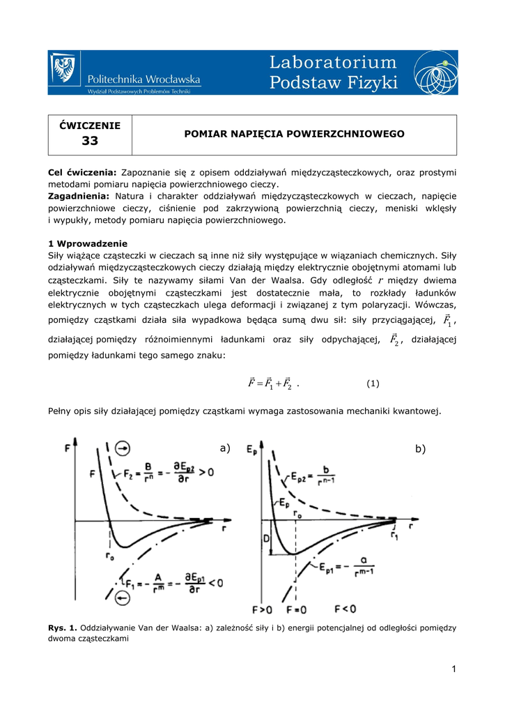 ĆWICZENIE 33 POMIAR NAPIĘCIA POWIERZCHNIOWEGO Cel ćwiczenia: Zapoznanie się z opisem oddziaływań międzycząsteczkowych, oraz prostymi metodami pomiaru napięcia powierzchniowego cieczy. Zagadnienia: Natura i charakter oddziaływań międzycząsteczkowych w cieczach, napięcie powierzchniowe cieczy, ciśnienie pod zakrzywioną powierzchnią cieczy, meniski wklęsły i wypukły, metody pomiaru napięcia powierzchniowego. 1 Wprowadzenie Siły wiążące cząsteczki w cieczach są inne niż siły występujące w wiązaniach chemicznych. Siły odziaływań międzycząsteczkowych cieczy działają między elektrycznie obojętnymi atomami lub cząsteczkami. Siły te nazywamy siłami Van der Waalsa. Gdy odległość r między dwiema elektrycznie obojętnymi cząsteczkami jest dostatecznie mała, to rozkłady ładunków elektrycznych w tych cząsteczkach ulega deformacji i związanej z tym polaryzacji. Wówczas, pomiędzy cząstkami działa siła wypadkowa będąca sumą dwu sił: siły przyciągającej, działającej pomiędzy różnoimiennymi ładunkami oraz siły odpychającej, F2 , F1 , działającej pomiędzy ładunkami tego samego znaku: F F1 F2 . (1) Pełny opis siły działającej pomiędzy cząstkami wymaga zastosowania mechaniki kwantowej. a) b) Rys. 1. Oddziaływanie Van der Waalsa: a) zależność siły i b) energii potencjalnej od odległości pomiędzy dwoma cząsteczkami 1 Dla dużych odległości pomiędzy cząstkami dominuje siła przyciągająca F1 , a gdy zmniejszamy odległość między tymi cząsteczkami, to zaczynają dominować siły odpychania taka odległość ro pomiędzy dwiema cząsteczkami, przy której siły przyciągania i odpychania równoważą się. Siłom tym odpowiadają energie potencjalne potencjalna 𝐸𝑝1 i 𝐸𝑝2 . Wypadkowa energia Ep jest ich sumą algebraiczną. 𝐸𝑝 = 𝐸𝑝1 + 𝐸𝑝2 . Dla odległości a siła F2 . Istnieje więc ro, F (ro) = 0 (2) występuje stan równowagi w którym energia potencjalna osiąga minimum, . Na odległościach mniejszych od odległościach większych od cząsteczek osiąga minimum ro ro - siły przyciągające. D (rys. 1). Siły Van der dominują siły odpychania, zaś na Wtedy energia oddziaływania obu Waalsa stają się znikomo małe dla odległości większych od 1 nm. 1.1 Napięcie powierzchniowe cieczy na granicy z inną fazą Średnie odległości cząsteczek w cieczach są znacznie mniejsze niż w gazach. Dlatego siły oddziaływania między cząsteczkami cieczy są o wiele większe niż siły oddziaływania między cząsteczkami gazu. Na cząsteczkę znajdującą się wewnątrz cieczy działają siły przyciągania pochodzące od otaczających ją cząsteczek. Ze względu na symetrię sferyczną siły te kompensują się tak, że ich wypadkowa równa się zeru (rys. 2). Na powierzchni cieczy siły przyciągania pochodzące od cząsteczek cieczy, tworzą wypadkową, która jest skierowana do wnętrza cieczy wzdłuż normalnej do jej powierzchni. Wypadkowa sił pochodzących od cząsteczek gazu lub pary działa na rozpatrywaną cząsteczkę także wzdłuż normalnej do granicy ciecz-gaz (para), ale jest skierowana na zewnątrz. Wartość tej siły jest jednakże wielokrotnie mniejsza niż siły przyciągania między cząsteczkami cieczy. Wypadkowa siła działająca na cząsteczki znajdujące się na powierzchni cieczy jest więc skierowana w głąb cieczy i wywiera ciśnienie rzędu dziesiątek tysięcy atmosfer. Na skutek tego powierzchnia Rys. 2. Wypadkowa sił działających na cząsteczkę we wnętrzu i na powierzchni cieczy. cieczy kurczy się. Gdy na ciecz nie działają siły zewnętrzne, to przyjmuje ona kształt kuli. Przeniesienie cząsteczek z wnętrza cieczy na jej powierzchnię jest związane z wykonaniem pracy przeciw wypadkowej sił międzycząsteczkowych. Cząsteczki na powierzchni cieczy mają większą energię potencjalną niż cząsteczki wewnątrz cieczy. Napięciem powierzchniowym σ danej cieczy, na granicy z inną fazą, nazywamy pracę W potrzebną do izotermicznego zwiększenia powierzchni o wartość jednostkową ∆𝑺. 𝑊 𝜎 = ∆𝑆 . (3) 2 Definicję tę lepiej zrozumieć na przykładzie. Jeżeli na ramce z drutu (rys. 3), której część o długości l jest ruchoma, utworzymy błonkę mydlaną przez zanurzenie jej w roztworze mydła, to napięcie powierzchniowe spowoduje zmniejszenie powierzchni błonki. Pod działaniem ciężaru części ruchomej ramki z jednej strony i sił napięcia powierzchniowego błonki z drugiej, Rys. 3. Błonka mydlana naciągana na ramce strony część ruchoma ramki zajmie położenie równowagi. Gdy do części ruchomej ramki podwiesimy dodatkowy ciężarek, jego ciężar W ten sposób zostanie wykonana praca mg spowoduje przesunięcie części ruchomej o b. W = mgb, pod wpływem której powierzchnia błonki powiększy się o 2S = lb (bo błonka ma dwie powierzchnie). Doświadczenie wykazuje, że stosunek pracy W do powierzchni 2s jest cechą charakterystyczną dla danej granicy faz, a więc 𝑊 𝜎 = 2𝑆 = 𝑚𝑔𝑏 2𝑙𝑏 = 𝑚𝑔 2𝑙 𝐹 = 2𝑙 . (4) Część ruchoma ramki, a więc i swobodny brzeg ramki, przesuwa się pod działaniem siły stycznej do powierzchni błonki i normalnej do jej krawędzi swobodnej. Siłę tę można zrównoważyć za pomocą ciężarka. Jak widać ze wzoru (4), napięciem powierzchniowym σ możemy nazwać także siłę F styczną do powierzchni cieczy, działającą na jednostkę długości obrzeża powierzchni cieczy. W układzie SI wymiarem napięcia powierzchniowego σ jest J/m2 (wg def. pierwszej) lub N/m (wg def. drugiej). 1.2 Napięcie na granicy rozdziału ośrodków Na granicy cieczy, gazu i ciała stałego obserwuje się zakrzywienie powierzchni cieczy, zwane meniskiem. Menisk jest wynikiem rozkładu sił, które działają na cząsteczki cieczy znajdujące się w pobliżu granic trzech faz: cieczy, gazu i ciała stałego. Siłami kohezji nazywamy siły działające