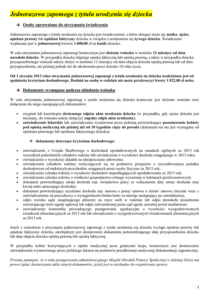 Jednorazowa zapomoga z tytułu urodzenia się dziecka Osoby uprawnione do otrzymania świadczenia Jednorazowa zapomoga z tytułu urodzenia się dziecka jest świadczeniem, o które ubiegać może się matka, ojciec, opiekun prawny lub opiekun faktyczny dziecka w związku z urodzeniem się żywego dziecka. Świadczenie wypłacane jest w jednorazowej kwocie 1.000,00 zł na każde dziecko. W celu otrzymania jednorazowej zapomogi koniecznym jest złożenie wniosku w terminie 12 miesięcy od dnia narodzin dziecka. W przypadku dziecka objętego opieką faktyczną lub opieką prawną, a także w przypadku dziecka przysposobionego wniosek należy złożyć w terminie 12 miesięcy od dnia objęcia dziecka opieką prawną lub od dnia przysposobienia, nie później jednak niż do ukończenia przez dziecko 18 roku życia. Od 1 stycznia 2013 roku otrzymanie jednorazowej zapomogi z tytułu urodzenia się dziecka uzależnione jest od spełnienia kryterium dochodowego. Dochód na osobę w rodzinie nie może przekroczyć kwoty 1.922,00 zł netto. Dokumenty wymagane podczas składania wniosku W celu otrzymania jednorazowej zapomogi z tytułu urodzenia się dziecka konieczne jest złożenie wniosku oraz dołączenie do niego następujących dokumentów: oryginał lub kserokopia skróconego odpisu aktu urodzenia dziecka (w przypadku, gdy ojciec dziecka jest nieznany, do wniosku należy dołączyć zupełny odpis aktu urodzenia); zaświadczenie lekarskie lub zaświadczenie wystawione przez położną potwierdzające pozostawanie kobiety pod opieką medyczną nie później niż od 10 tygodnia ciąży do porodu (dokument ten nie jest wymagany od opiekuna prawnego lub opiekuna faktycznego dziecka); dokumenty dotyczące kryterium dochodowego: zaświadczenie z Urzędu Skarbowego o dochodach opodatkowanych na zasadach ogólnych za 2013 rok wszystkich pełnoletnich członków rodziny lub oświadczenie o wysokości dochodu osiągniętego w 2013 roku; oświadczenie o wysokości składek na ubezpieczenie zdrowotne; oświadczenia członków rodziny rozliczających się na podstawie przepisów o zryczałtowanym podatku dochodowym od niektórych przychodów osiąganych przez osoby fizyczne za 2013 rok; oświadczenie członka rodziny o wysokości dochodów niepodlegających opodatkowaniu za 2013 rok; oświadczenie członka rodziny o wielkości gospodarstwa rolnego wyrażonej w hektarach przeliczeniowych; dokument potwierdzający utratę dochodu (np. świadectwo pracy ze wskazaniem daty utraty dochodu oraz kwotę netto utraconego dochodu); dokument potwierdzający uzyskanie dochodu (np. umowa o pracę/ umowa o dzieło/ umowa zlecenie wraz z zaświadczeniem od pracodawcy o wynagrodzeniu brutto/netto za miesiąc następujący po zatrudnieniu); odpis wyroku sądu zasądzającego alimenty na rzecz osób w rodzinie lub odpis protokołu posiedzenia zawierającego treść ugody sądowej lub odpis zatwierdzonej przez sąd ugody zawartej przed mediatorem; zaświadczenie komornika prowadzącego postępowanie egzekucyjne o wysokości wyegzekwowanych świadczeń alimentacyjnych za 2013 rok lub oświadczenie o wyegzekwowanych świadczeniach alimentacyjnych za 2013 rok. Jeżeli z wnioskiem o przyznanie jednorazowej zapomogi z tytułu urodzenia się dziecka wystąpi opiekun prawny lub opiekun faktyczny dziecka, niezbędnym jest dostarczenie dokumentu potwierdzającego datę przysposobienia dziecka lub datę objęcia dziecka opieką prawną lub opieką faktyczną. W przypadku kobiet korzystających z opieki medycznej poza granicami kraju, koniecznym jest dostarczenie zaświadczenia wystawionego przez polskiego lekarza na podstawie przedłożonej medycznej dokumentacji zagranicznej. Prosimy pamiętać, że w toku postępowania administracyjnego Miejski Ośrodek Pomocy Społecznej w Jeleniej Górze ma prawo żądać dostarczenia także innych dokumentów, jeżeli jest to niezbędne do rozpatrzenia sprawy. 1 Termin i sposób załatwienia Postępowanie w sprawie ustalenia prawa do jednorazowej zapomogi z tytułu urodzenia się dziecka kończy się wydaniem decyzji administracyjnej w terminie miesiąca od daty złożenia kompletu dokumentów. W przypadku konieczności przeprowadzenia szczegółowego postępowania administracyjnego termin załatwienia sprawy może ulec wydłużeniu. Wypłata świadczeń Jednorazową zapomogę z tytułu urodzenia się dziecka wypłaca się najpóźniej do końca miesiąca, w którym złożono wniosek. Jednak w przypadku złożenia wniosku po 10 dniu miesiąca jednorazową zapomogę wypłaca się najpóźniej do końca miesiąca następującego po miesiącu, w którym złożono wniosek. Kiedy świadczenie nie przysługuje Jednorazowa zapomoga z tytułu urodzenia się dziecka nie przysługuje gdy: wniosek o przyznanie jednorazowej zapomogi z tytułu urodzenia się dziecka zostanie złożony po upływie 12 miesięcy od dnia narodzin dziecka lub po upływie 12 miesięcy od dnia objęcia dziecka opieką prawną lub od dnia przysposobienia (w przypadku dziecka objętego opieką faktyczną lub opieką prawną, a także w przypadku dziecka przysposobionego); matka dziecka nie pozostawała pod opieką medyczną co najmniej od 10 tygodnia ciąży do porodu; dochód na osobę w rodzinie przekracza kwotę netto 1.922,00 zł; jednorazowa zapomoga z tytułu urodzenia się dziecka została pobrana np. w innej gminie. Informacje dodatkowe Tryb odwoławczy Od decyzji w sprawie ustalenia prawa do jednorazowej zapomogi z tytułu urodzenia się dziecka służy stronie prawo wniesienia odwołania do Samorządowego Kolegium Odwoławczego w Jeleniej Górze w terminie 14 dni od daty jej otrzymania. Odwołanie wnosi się za pośrednictwem Miejskiego Ośrodka Pomocy w Jeleniej Górze. Podstawa prawna ustawa z dnia 28 listopada 2003 r. o świadczeniach rodzinnych (t.j. Dz. U. z 2006 r., Nr 139, poz. 992 z późn. zm.); rozporządzenie Ministra Pracy i Polityki Społecznej z dnia 3 stycznia 2013 r. w sprawie sposobu i trybu postępowania w