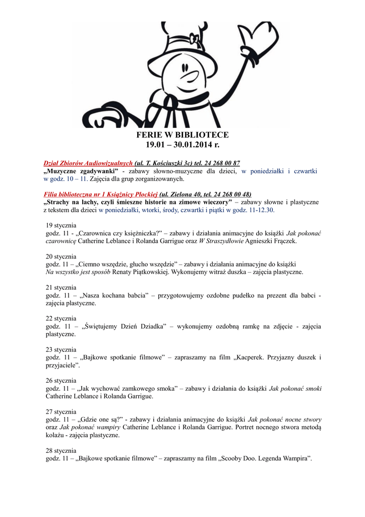 FERIE W BIBLIOTECE 19.01 – 30.01.2014 r. Dział Zbiorów Audiowizualnych (ul. T. Kościuszki 3c) tel. 24 268 00 87 „Muzyczne zgadywanki” - zabawy słowno-muzyczne dla dzieci, w poniedziałki i czwartki w godz. 10 – 11. Zajęcia dla grup zorganizowanych. Filia biblioteczna nr 1 Książnicy Płockiej (ul. Zielona 40, tel. 24 268 00 48) „Strachy na lachy, czyli śmieszne historie na zimowe wieczory” – zabawy słowne i plastyczne z tekstem dla dzieci w poniedziałki, wtorki, środy, czwartki i piątki w godz. 11-12.30. 19 stycznia godz. 11 - „Czarownica czy księżniczka?” – zabawy i działania animacyjne do książki Jak pokonać czarownicę Catherine Leblance i Rolanda Garrigue oraz W Straszydłowie Agnieszki Frączek. 20 stycznia godz. 11 – „Ciemno wszędzie, głucho wszędzie” – zabawy i działania animacyjne do książki Na wszystko jest sposób Renaty Piątkowskiej. Wykonujemy witraż duszka – zajęcia plastyczne. 21 stycznia godz. 11 – „Nasza kochana babcia” – przygotowujemy ozdobne pudełko na prezent dla babci zajęcia plastyczne. 22 stycznia godz. 11 – „Świętujemy Dzień Dziadka” – wykonujemy ozdobną ramkę na zdjęcie - zajęcia plastyczne. 23 stycznia godz. 11 – „Bajkowe spotkanie filmowe” – zapraszamy na film „Kacperek. Przyjazny duszek i przyjaciele”. 26 stycznia godz. 11 – „Jak wychować zamkowego smoka” – zabawy i działania do książki Jak pokonać smoki Catherine Leblance i Rolanda Garrigue. 27 stycznia godz. 11 – „Gdzie one są?” - zabawy i działania animacyjne do książki Jak pokonać nocne stwory oraz Jak pokonać wampiry Catherine Leblance i Rolanda Garrigue. Portret nocnego stwora metodą kolażu - zajęcia plastyczne. 28 stycznia godz. 11 – „Bajkowe spotkanie filmowe” – zapraszamy na film „Scooby Doo. Legenda Wampira”. 29 stycznia godz. 11 – „Pokonać strach” – zabawy i działania animacyjne do książki Kacper i piraci. Wykonujemy czapkę pirata – zajęcia plastyczne. 30 stycznia godz. 11 – „Bal straszydeł” – zabawy przy muzyce na zakończenie ferii. Filia biblioteczna nr 3 Książnicy Płockiej (ul. Rembielińskiego 11, tel. 24 268 00 50) „Rycerskie ferie w bibliotece” – zajęcia literacko-plastyczne dla dzieci, od 27 do 30 stycznia w godz. 11-12.30 27 stycznia godz. 11 – „Kto, jak i gdzie? Szlakiem średniowiecznych zamków” – w Polsce znajduje się wiele zamków, z którymi wiążą się niesamowite historie. Poznamy kilka z nich i stworzymy zamki przypominające te jeszcze istniejące w oparciu o wiersz Rycerz Krzykalski Juliana Tuwima. 28 stycznia godz. 11 – „Śladami rycerzy ziem polskich” – przestrzeganie kodeksu to ważny element bycia rycerzem. Odznaczali się odwagą, wyglądem, ale także posiadali swoje herby. W czasie tego spotkania stworzymy własne wyjątkowe herby, które będą nas charakteryzować w oparciu o Przygody rycerza Szaławiły Jana Brzechwy. 29 stycznia godz. 11 – „Merlin i jego czary” – sztuczki magiczne zaskakują, mają w sobie tajemnicę… Część z nich odkryjemy, wypróbujemy i będziemy zadziwiać innych w oparciu o „Czarodziej Merlin”, fragment książki O Królu Arturze i Rycerzach Okrągłego Stołu. 30 stycznia godz. 11 – „Dzielni rycerze kontra smoki” - Odwaga i męstwo to przymioty prawdziwych rycerzy, którzy toczyli walki w obronie niewinnych ludzi. Jednak przyszło im walczyć nie tylko z okrutnymi ludźmi, na ich drodze stawały także niebezpieczne smoki. Spróbujmy oswoić smoki, które pojawią się w czasie tych ferii na podstawie utworu „Przepraszam smoku. Ballada o uprzejmym rycerzu” Wiery Badalskiej. Filia biblioteczna nr 4 Książnicy Płockiej (ul. Krzywoustego 3, tel. 24 263 34 28) „Kiedy mróz za oknem” – zajęcia literacko-plastyczne dla dzieci, od 20 do 23 stycznia w godz. 1113. 20 stycznia godz. 11 – „Cudze chwalicie, swego nie znacie”- na zajęciach dzieci wyruszą w podróż po mało znanych miejscach w Polsce. Zajęcia literacko – plastyczne. 21 stycznia, 22 stycznia godz. 11 – „Bajkowy świat” – fantazyjne zajęcia literacko – plastyczne z wykorzystaniem materiałów zebranych w czasie spacerów po lesie i polu. 23 stycznia godz. 11 – „W grupie fajniej” – gry planszowe i zabawy ruchowe. Filia biblioteczna nr 5 Książnicy Płockiej (Pasaż Vuka Karadzica 1, tel. 24 262 32 55) „Pies i kot moi najlepsi przyjaciele – wesołe spotkania z literaturą w rytmie muzyki” – gry i zabawy edukacyjne dla dzieci w wieku 6-10 lat, od 20 do 22 stycznia w godz. 11 – 13. 20 stycznia godz. 11 –„Koty, czyli historie z pewnego podwórka” Melania Kapelusz - wykonanie portretu własnego pupila techniką dowolną w artystycznej ramce na podstawie zaprezentowanych fragmentów literatury. Trening pamięci z grą edukacyjną „Pamięć”. Układanie puzzli: „Buziaki Śmieszaki”, „Tom i Jerry”, „101 Dalmatyńczyków” i „Kot Sylwester i kaczor Duffy” 21 stycznia godz. 11 – „Psie smutki z „Akademii Pana Kleksa” - fantastyczny pies z kosmosu odtwarzany z pamięci na podstawie fragmentów utworu i zaprezentowanej wersji muzycznej. Prezentacja innych utworów o kotach i psach a dla odważnych możliwość zaśpiewania karooke. Przeniesienie się do świata fantastycznych gier planszowych. Wykonanie kosmicznej bransoletki dla Babci z okazji Jej Święta. 22 stycznia godz. 11 – Jak dużo jest książek o psach i kotach? Czytanie wybranych fragmentów książek z serii Holly Webb, wierszy Ludwika Jerzego Kerna. Wykonania zakładki do książki, jako prezentu dla dziadka w dniu Jego Święta. Wysłuchanie bajki o złym wilku, a następnie zabawa z grą planszową „Czerwony kapturek”. Filia biblioteczna nr 6 Książnicy Płockiej (ul. Czwartaków 4, tel. 24 263 50 34) „Zimowa Akademia Muminków” – zajęcia literacko-plastyczne dla dzieci, w poniedziałki, środy i piątki w godz. 11.30 -13 19 stycznia god