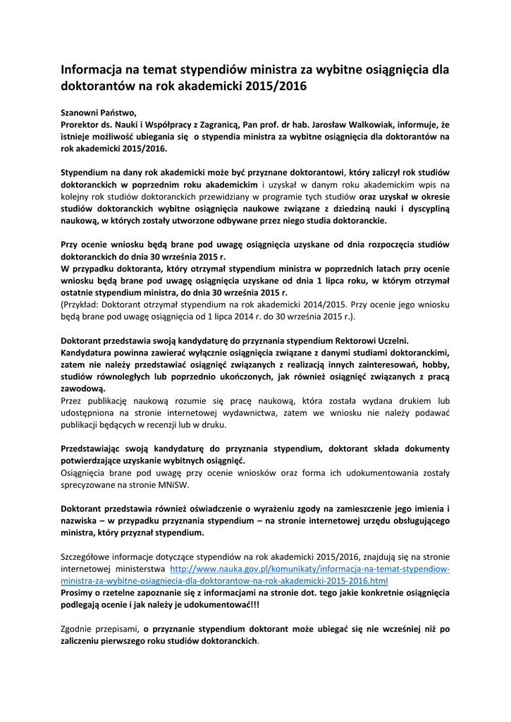Informacja na temat stypendiów ministra za wybitne osiągnięcia dla doktorantów na rok akademicki 2015/2016 Szanowni Państwo, Prorektor ds. Nauki i Współpracy z Zagranicą, Pan prof. dr hab. Jarosław Walkowiak, informuje, że istnieje możliwość ubiegania się o stypendia ministra za wybitne osiągnięcia dla doktorantów na rok akademicki 2015/2016. Stypendium na dany rok akademicki może być przyznane doktorantowi, który zaliczył rok studiów doktoranckich w poprzednim roku akademickim i uzyskał w danym roku akademickim wpis na kolejny rok studiów doktoranckich przewidziany w programie tych studiów oraz uzyskał w okresie studiów doktoranckich wybitne osiągnięcia naukowe związane z dziedziną nauki i dyscypliną naukową, w których zostały utworzone odbywane przez niego studia doktoranckie. Przy ocenie wniosku będą brane pod uwagę osiągnięcia uzyskane od dnia rozpoczęcia studiów doktoranckich do dnia 30 września 2015 r. W przypadku doktoranta, który otrzymał stypendium ministra w poprzednich latach przy ocenie wniosku będą brane pod uwagę osiągnięcia uzyskane od dnia 1 lipca roku, w którym otrzymał ostatnie stypendium ministra, do dnia 30 września 2015 r. (Przykład: Doktorant otrzymał stypendium na rok akademicki 2014/2015. Przy ocenie jego wniosku będą brane pod uwagę osiągnięcia od 1 lipca 2014 r. do 30 września 2015 r.). Doktorant przedstawia swoją kandydaturę do przyznania stypendium Rektorowi Uczelni. Kandydatura powinna zawierać wyłącznie osiągnięcia związane z danymi studiami doktoranckimi, zatem nie należy przedstawiać osiągnięć związanych z realizacją innych zainteresowań, hobby, studiów równoległych lub poprzednio ukończonych, jak również osiągnięć związanych z pracą zawodową. Przez publikację naukową rozumie się pracę naukową, która została wydana drukiem lub udostępniona na stronie internetowej wydawnictwa, zatem we wniosku nie należy podawać publikacji będących w recenzji lub w druku. Przedstawiając swoją kandydaturę do przyznania stypendium, doktorant składa dokumenty potwierdzające uzyskanie wybitnych osiągnięć. Osiągnięcia brane pod uwagę przy ocenie wniosków oraz forma ich udokumentowania zostały sprecyzowane na stronie MNiSW. Doktorant przedstawia również oświadczenie o wyrażeniu zgody na zamieszczenie jego imienia i nazwiska – w przypadku przyznania stypendium – na stronie internetowej urzędu obsługującego ministra, który przyznał stypendium. Szczegółowe informacje dotyczące stypendiów na rok akademicki 2015/2016, znajdują się na stronie internetowej ministerstwa http://www.nauka.gov.pl/komunikaty/informacja-na-temat-stypendiowministra-za-wybitne-osiagniecia-dla-doktorantow-na-rok-akademicki-2015-2016.html Prosimy o rzetelne zapoznanie się z informacjami na stronie dot. tego jakie konkretnie osiągnięcia podlegają ocenie i jak należy je udokumentować!!! Zgodnie przepisami, o przyznanie stypendium doktorant może ubiegać się nie wcześniej niż po zaliczeniu pierwszego roku studiów doktoranckich. Stypendium nie przysługuje doktorantowi, który ukończył już jedne studia doktoranckie. Zgodnie z art. 199c ust. 1 ustawy – Prawo o szkolnictwie wyższym, stypendia ministra są przyznawane doktorantom na wniosek rektora uczelni. Wniosek musi być uprzednio zaopiniowany przez radę podstawowej jednostki organizacyjnej (przez Radę danego Wydziału). W tym celu rektor przekazuje wniosek wraz z dokumentami potwierdzającymi uzyskanie wybitnych osiągnięć ww. organom kolegialnym, które wyrażą opinię, czy przedstawione przez doktoranta osiągnięcia są wybitnymi osiągnięciami, o których mowa w rozporządzeniu oraz czy są związane ze studiami doktoranckimi odbywanymi przez doktoranta. W przypadku, gdy doktorant przedstawi osiągnięcia spoza katalogu wybitnych osiągnięć lub niezwiązane ze studiami doktoranckimi, opinia ta może być negatywna. Rektor uczelni przekazuje Ministrowi jedynie pozytywnie zaopiniowane wnioski. Wszystkie osoby zainteresowane uzyskaniem stypendium ministra prosimy o wypełnienie, wydrukowanie, podpisanie i dostarczenie do Działu Badań Naukowych w terminie do 10.09.2015r.: Druku zgłoszenia kandydatury do przyznania stypendium ministra (zał. A) Oświadczenia dot. nie ukończenia drugiego kierunku studiów doktoranckich (zał. B) Oświadczenia dot. zgody na przetwarzanie danych osobowych (zał. C) wniosek stypendialny zawierający wykaz osiągnięć (zał. D) oraz dokumenty potwierdzające uzyskanie wybitnych osiągnięć (zgodnie z §4 ust.3 Rozporządzenia MNiSW z dnia 17.07.2015r. w sprawie stypendiów ministra za wybitne osiągnięcia przyznawanych doktorantom) Dodatkowo, wypełniony wniosek stypendialny w formacie WORD (zał. D) należy przesłać mailem na adres [email protected] lub [email protected] Wszystkie osiągnięcia (np. referaty wygłoszone na konferencjach), dla których uzyskanie potwierdzenia będzie możliwe w okresie od 10.09.2015 do 30.09.2015r. należy wpisać do wniosku a potwierdzenie dostarczyć do DBN najpóźniej do 5 października 2015r.