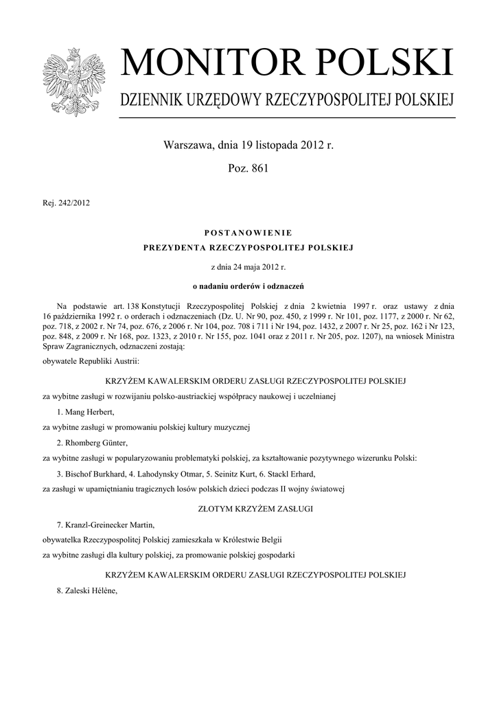 MONITOR POLSKI DZIENNIK URZĘDOWY RZECZYPOSPOLITEJ POLSKIEJ Warszawa, dnia 19 listopada 2012 r. Poz. 861 Rej. 242/2012 POSTANOWIENIE PREZYDENTA RZECZYPOSPOLITEJ POLSKIEJ z dnia 24 maja 2012 r. o nadaniu orderów i odznaczeń Na podstawie art. 138 Konstytucji Rzeczypospolitej Polskiej z dnia 2 kwietnia 1997 r. oraz ustawy z dnia 16 października 1992 r. o orderach i odznaczeniach (Dz. U. Nr 90, poz. 450, z 1999 r. Nr 101, poz. 1177, z 2000 r. Nr 62, poz. 718, z 2002 r. Nr 74, poz. 676, z 2006 r. Nr 104, poz. 708 i 711 i Nr 194, poz. 1432, z 2007 r. Nr 25, poz. 162 i Nr 123, poz. 848, z 2009 r. Nr 168, poz. 1323, z 2010 r. Nr 155, poz. 1041 oraz z 2011 r. Nr 205, poz. 1207), na wniosek Ministra Spraw Zagranicznych, odznaczeni zostają: obywatele Republiki Austrii: KRZYŻEM KAWALERSKIM ORDERU ZASŁUGI RZECZYPOSPOLITEJ POLSKIEJ za wybitne zasługi w rozwijaniu polsko-austriackiej współpracy naukowej i uczelnianej 1. Mang Herbert, za wybitne zasługi w promowaniu polskiej kultury muzycznej 2. Rhomberg Günter, za wybitne zasługi w popularyzowaniu problematyki polskiej, za kształtowanie pozytywnego wizerunku Polski: 3. Bischof Burkhard, 4. Lahodynsky Otmar, 5. Seinitz Kurt, 6. Stackl Erhard, za zasługi w upamiętnianiu tragicznych losów polskich dzieci podczas II wojny światowej ZŁOTYM KRZYŻEM ZASŁUGI 7. Kranzl-Greinecker Martin, obywatelka Rzeczypospolitej Polskiej zamieszkała w Królestwie Belgii za wybitne zasługi dla kultury polskiej, za promowanie polskiej gospodarki KRZYŻEM KAWALERSKIM ORDERU ZASŁUGI RZECZYPOSPOLITEJ POLSKIEJ 8. Zaleski Hélène, Monitor Polski –2– obywatele Królestwa Danii: za wybitne zasługi w działalności na rzecz Polonii duńskiej KRZYŻEM KAWALERSKIM ORDERU ZASŁUGI RZECZYPOSPOLITEJ POLSKIEJ 9. Miedzianogóra Roman, za zasługi w działalności na rzecz Polonii duńskiej SREBRNYM KRZYŻEM ZASŁUGI 10. Serafin Maria Elżbieta, 11. Sobocki Aleksander, obywatelka Rzeczypospolitej Polskiej i Królestwa Danii 12. Grodzka Alicja Teresa, obywatele Republiki Francuskiej: za wybitne zasługi w rozwijaniu polsko-francuskiej współpracy wojskowej KRZYŻEM KOMANDORSKIM ORDERU ZASŁUGI RZECZYPOSPOLITEJ POLSKIEJ 13. adm. Guillaud Edouard, za wybitne zasługi w popularyzowaniu polskiej literatury KRZYŻEM OFICERSKIM ORDERU ZASŁUGI RZECZYPOSPOLITEJ POLSKIEJ 14. Veaux Erik, za zasługi w popularyzowaniu polskiej kultury ZŁOTYM KRZYŻEM ZASŁUGI 15. Toporowski Dominik Zdzisław, obywatele Rzeczypospolitej Polskiej zamieszkali w Kanadzie: za wybitne zasługi w działalności kombatanckiej i polonijnej KRZYŻEM KOMANDORSKIM ORDERU ODRODZENIA POLSKI 16. Ostrowski Marceli, za wybitne zasługi dla niepodległości Rzeczypospolitej Polskiej, za działalność polonijną i kombatancką: KRZYŻEM OFICERSKIM ORDERU ODRODZENIA POLSKI 17. Ejbich Bohdan Jan, 18. Szrajer Kazimierz Józef, KRZYŻEM KAWALERSKIM ORDERU ODRODZENIA POLSKI 19. Ejbich Anna Maria, pośmiertnie 20. Brodzka Maria, za zasługi w działalności na rzecz polonijnych środowisk kombatanckich ZŁOTYM KRZYŻEM ZASŁUGI 21. Bujnowski Janusz Józef, Poz. 861 Monitor Polski –3– obywatelki Republiki Kazachstanu za zasługi w działalności polonijnej, za rozwijanie polsko-kazachstańskiej współpracy ZŁOTYM KRZYŻEM ZASŁUGI 22. Snegurskaya Ruslana, 23. Verzbitskaya Halina, obywatel Republiki Kolumbii za wybitne zasługi w rozwijaniu polsko-kolumbijskiej współpracy KRZYŻEM KOMANDORSKIM ORDERU ZASŁUGI RZECZYPOSPOLITEJ POLSKIEJ 24. Barrantes Ulloa Jorge Alberto, obywatel Rzeczypospolitej Polskiej zamieszkały w Królestwie Marokańskim za zasługi w niesieniu pomocy więźniom polskim i litewskim na terenie Maroka ZŁOTYM KRZYŻEM ZASŁUGI 25. o. Stachera Czesław Michał, obywatelka Federacji Rosyjskiej za zasługi w popularyzowaniu polskiej kultury, za osiągnięcia w działalności artystycznej ZŁOTYM KRZYŻEM ZASŁUGI 26. Piecha Edyta, obywatele Rzeczypospolitej Polskiej zamieszkali w Stanach Zjednoczonych Ameryki za wybitne zasługi w promowaniu polskiej kultury KRZYŻEM KAWALERSKIM ORDERU ZASŁUGI RZECZYPOSPOLITEJ POLSKIEJ 27. Hoffman Edward, 28. Lizakowski Adam, obywatele Stanów Zjednoczonych Ameryki KRZYŻEM KAWALERSKIM ORDERU ZASŁUGI RZECZYPOSPOLITEJ POLSKIEJ za wybitne zasługi w działalności polonijnej, za kształtowanie pozytywnego wizerunku Polski 29. Drobot Joseph Anthony, za wybitne zasługi w promowaniu polskiej kultury: 30. Tegnazian Terry, pośmiertnie 31. Dudarew-Ossetyński Leonidas, obywatel Królestwa Tajlandii za wybitne zasługi w rozwijaniu współpracy między Rzecząpospolitą Polską i Królestwem Tajlandii KRZYŻEM KOMANDORSKIM ORDERU ZASŁUGI RZECZYPOSPOLITEJ POLSKIEJ 32. Amatayakul Akrasid, obywatel Republiki Turcji za wybitne zasługi w rozwijaniu polsko-tureckiej współpracy KRZYŻEM KOMANDORSKIM ORDERU ZASŁUGI RZECZYPOSPOLITEJ POLSKIEJ 33. Uman Reşit, Poz. 861 Monitor Polski –4– Poz. 861 obywatele Ukrainy: za wybitne zasługi w rozwijaniu polsko-ukraińskiej współpracy uczelnianej i naukowej KRZYŻEM OFICERSKIM ORDERU ZASŁUGI RZECZYPOSPOLITEJ POLSKIEJ 34. Grzegocki Mieczysław, za zasługi w upamiętnianiu historii, walk i męczeństwa polskich żołnierzy formacji granicznych we wrześniu 1939 r. SREBRNYM KRZYŻEM ZASŁUGI 35. Sulik Anatol, obywatelki Rzeczypospolitej Polskiej i Republiki Włoskiej: za wybitne zasługi w rozwijaniu polsko-włoskiej wspólpracy parlamentarnej, za promowanie spraw Polski KRZYŻEM OFICERSKIM ORDERU ZASŁUGI RZECZYPOSPOLITEJ POLSKIEJ 36. Cicinelli Letizia, za wybitne zasługi w upamiętnianiu i upowszechnianiu wiedzy o roli walk II Korpusu Polskiego o wyzwolenie Półwyspu Apenińskiego KRZYŻEM KAWALERSKIM ORDERU ZASŁUGI RZECZYPOSPOLITEJ POLSKIEJ 37. Jackiewicz Beata Alicja, obywatele Republiki Włoskiej: za wybitne zasługi w promowaniu nauki polskiej, za rozwijanie polsko-włoskiej współpracy naukowej i uczelnianej KRZYŻEM KOMANDORSKIM Z GWIAZDĄ ORDERU ZASŁUGI RZECZYPOSPOLITEJ POLSKIEJ 38. Arnaldi Girolamo, za wy