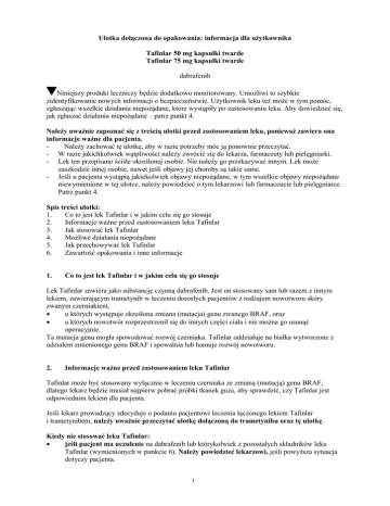 Ulotka dołączona do opakowania: informacja dla użytkownika Tafinlar 50 mg kapsułki twarde Tafinlar 75 mg kapsułki twarde dabrafenib Niniejszy produkt leczniczy będzie dodatkowo monitorowany. Umożliwi to szybkie zidentyfikowanie nowych informacji o bezpieczeństwie. Użytkownik leku też może w tym pomóc, zgłaszając wszelkie działania niepożądane, które wystąpiły po zastosowaniu leku. Aby dowiedzieć się, jak zgłaszać działania niepożądane – patrz punkt 4. Należy uważnie zapoznać się z treścią ulotki przed zastosowaniem leku, ponieważ zawiera ona informacje ważne dla pacjenta. Należy zachować tę ulotkę, aby w razie potrzeby móc ją ponownie przeczytać. - W razie jakichkolwiek wątpliwości należy zwrócić się do lekarza, farmaceuty lub pielęgniarki. - Lek ten przepisano ściśle określonej osobie. Nie należy go przekazywać innym. Lek może zaszkodzić innej osobie, nawet jeśli objawy jej choroby są takie same. - Jeśli u pacjenta wystąpią jakiekolwiek objawy niepożądane, w tym wszelkie objawy niepożądane niewymienione w tej ulotce, należy powiedzieć o tym lekarzowi lub farmaceucie lub pielęgniarce. Patrz punkt 4. Spis treści ulotki: 1. Co to jest lek Tafinlar i w jakim celu się go stosuje 2. Informacje ważne przed zastosowaniem leku Tafinlar 3. Jak stosować lek Tafinlar 4. Możliwe działania niepożądane 5. Jak przechowywać lek Tafinlar 6. Zawartość opakowania i inne informacje 1. Co to jest lek Tafinlar i w jakim celu się go stosuje Lek Tafinlar zawiera jako substancję czynną dabrafenib. Jest on stosowany sam lub razem z innym lekiem, zawierającym trametynib w leczeniu dorosłych pacjentów z rodzajem nowotworu skóry zwanym czerniakiem, u których występuje określona zmiana (mutacja) genu zwanego BRAF, oraz u których nowotwór rozprzestrzenił się do innych części ciała i nie można go usunąć operacyjnie. Ta mutacja genu mogła spowodować rozwój czerniaka. Tafinlar oddziałuje na białka wytworzone z udziałem zmienionego genu BRAF i spowalnia lub hamuje rozwój nowotworu. 2. Informacje ważne przed zastosowaniem leku Tafinlar Tafinlar może być stosowany wyłącznie w leczeniu czerniaka ze zmianą (mutacją) genu BRAF, dlatego lekarz będzie musiał najpierw pobrać próbki tkanek guza, aby sprawdzić, czy Tafinlar jest odpowiednim lekiem dla pacjenta. Jeśli lekarz prowadzący zdecyduje o podaniu pacjentowi leczenia łączonego lekiem Tafinlar i trametynibem, należy uważnie przeczytać ulotkę dołączoną do trametynibu oraz tę ulotkę. Kiedy nie stosować leku Tafinlar: jeśli pacjent ma uczulenie na dabrafenib lub którykolwiek z pozostałych składników leku Tafinlar (wymienionych w punkcie 6). Należy powiedzieć lekarzowi, jeśli powyższa sytuacja dotyczy pacjenta. 1 Ostrzeżenia i środki ostrożności Przed rozpoczęciem stosowania leku Tafinlar należy omówić to z lekarzem. Lekarz musi wiedzieć, jeśli: pacjent ma chorobę wątroby pacjent ma lub miał kiedykolwiek chorobę nerek. Lekarz może pobrać krew w celu monitorowania czynności wątroby w trakcie leczenia lekiem Tafinlar, jeśli pacjent miał nowotwór inny niż czerniak, ponieważ zastosowanie leku Tafinlar może zwiększyć ryzyko rozwoju nowotworów zlokalizowanych w miejscu innym niż skóra. Przed przyjęciem leku Tafinlar w skojarzeniu z trametynibem należy podać lekarzowi następujące informacje, jeśli: u pacjenta występują problemy z sercem takie jak niewydolność serca lub problemy dotyczące rytmu serca. u pacjenta występują choroby oczu, w tym niedrożność żyły odprowadzającej krew z oka (niedrożność żył siatkówki) lub obrzęk oka, który mógł być spowodowany zablokowaniem odpływu płynów (chorioretinopatia). u pacjenta występują choroby płuc lub problemy z oddychaniem, w tym trudności w oddychaniu, którym często towarzyszy suchy kaszel, duszność i uczucie zmęczenia. Należy powiedzieć lekarzowi, jeśli którakolwiek z powyższych sytuacji dotyczy pacjenta. Objawy, na które należy zwrócić uwagę U niektórych pacjentów przyjmujących Tafinlar występują inne objawy, które mogą być ciężkie. Pacjent musi wiedzieć o ważnych objawach, na które należy zwrócić uwagę w trakcie stosowania tego leku. Niektóre z tych objawów (krwawienie, gorączka, zmiany skórne i problemy z oczami) są pokrótce opisane w tym punkcie, jednak bardziej szczegółowe informacje zamieszczone są w punkcie 4, „Możliwe działania niepożądane”. Krwawienie Przyjmowanie leku Tafinlar razem z trametynibem może powodować poważne krwawienie, w tym krwawienie do mózgu, do układu pokarmowego (na przykład w obrębie żołądka, odbytu lub jelit), do płuc i do innych narządów i może prowadzić do śmierci. Objawy krwawienia obejmują: ból głowy, zawroty głowy lub uczucie osłabienia obecność krwi w kale lub czarne stolce obecność krwi w moczu ból brzucha kaszel / krwawe wymioty Należy jak najszybciej poinformować lekarza, jeśli u pacjenta wystąpi którykolwiek z tych objawów. Gorączka (wysoka temperatura ciała) Ten lek może wywołać gorączkę (patrz także punkt 4). W niektórych przypadkach u osób z gorączką może wystąpić niskie ciśnienie krwi, zawroty głowy lub inne objawy. W razie pojawienia się gorączki w trakcie stosowania tego leku, należy natychmiast powiedzieć o tym lekarzowi, farmaceucie lub pielęgniarce. Choroby serca Tafinlar może powodować zaburzenia pracy serca lub nasilać istniejące choroby serca u pacjentów stosujących Tafinlar razem z trametynibem. Należy powiedzieć lekarzowi, jeśli pacjent ma zaburzenia pracy serca. Przed rozpoczęciem i w czasie leczenia lekiem Tafinlar razem z trametynibem lekarz przeprowadzi badania, aby sprawdzić, czy serce pacjenta pracuje prawidłowo. Należy natychmiast powiedzieć lekarzowi, jeśli pacjent ma wrażenie: kołatania, przyspieszonego lub nieregularnego bicia serca lub odczuwa zawroty głowy,