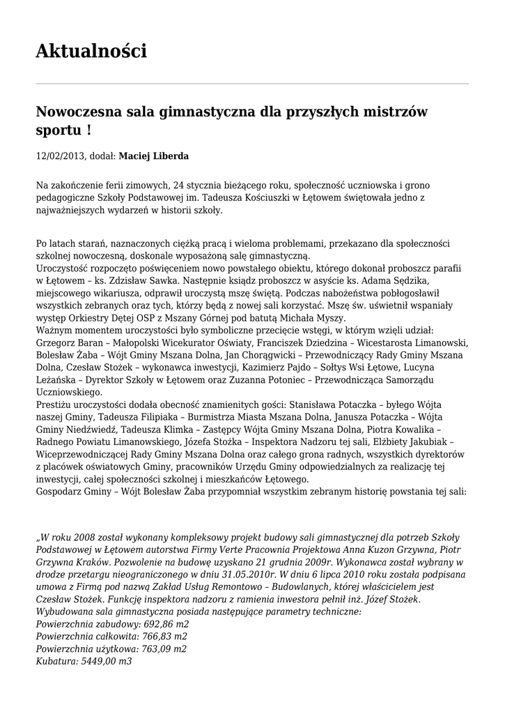 Aktualności Nowoczesna sala gimnastyczna dla przyszłych mistrzów sportu ! 12/02/2013, dodał: Maciej Liberda Na zakończenie ferii zimowych, 24 stycznia bieżącego roku, społeczność uczniowska i grono pedagogiczne Szkoły Podstawowej im. Tadeusza Kościuszki w Łętowem świętowała jedno z najważniejszych wydarzeń w historii szkoły. Po latach starań, naznaczonych ciężką pracą i wieloma problemami, przekazano dla społeczności szkolnej nowoczesną, doskonale wyposażoną salę gimnastyczną. Uroczystość rozpoczęto poświęceniem nowo powstałego obiektu, którego dokonał proboszcz parafii w Łętowem – ks. Zdzisław Sawka. Następnie ksiądz proboszcz w asyście ks. Adama Sędzika, miejscowego wikariusza, odprawił uroczystą mszę świętą. Podczas nabożeństwa pobłogosławił wszystkich zebranych oraz tych, którzy będą z nowej sali korzystać. Mszę św. uświetnił wspaniały występ Orkiestry Dętej OSP z Mszany Górnej pod batutą Michała Myszy. Ważnym momentem uroczystości było symboliczne przecięcie wstęgi, w którym wzięli udział: Grzegorz Baran – Małopolski Wicekurator Oświaty, Franciszek Dziedzina – Wicestarosta Limanowski, Bolesław Żaba – Wójt Gminy Mszana Dolna, Jan Chorągwicki – Przewodniczący Rady Gminy Mszana Dolna, Czesław Stożek – wykonawca inwestycji, Kazimierz Pajdo – Sołtys Wsi Łętowe, Lucyna Leżańska – Dyrektor Szkoły w Łętowem oraz Zuzanna Potoniec – Przewodnicząca Samorządu Uczniowskiego. Prestiżu uroczystości dodała obecność znamienitych gości: Stanisława Potaczka – byłego Wójta naszej Gminy, Tadeusza Filipiaka – Burmistrza Miasta Mszana Dolna, Janusza Potaczka – Wójta Gminy Niedźwiedź, Tadeusza Klimka – Zastępcy Wójta Gminy Mszana Dolna, Piotra Kowalika – Radnego Powiatu Limanowskiego, Józefa Stożka – Inspektora Nadzoru tej sali, Elżbiety Jakubiak – Wiceprzewodniczącej Rady Gminy Mszana Dolna oraz całego grona radnych, wszystkich dyrektorów z placówek oświatowych Gminy, pracowników Urzędu Gminy odpowiedzialnych za realizację tej inwestycji, całej społeczności szkolnej i mieszkańców Łętowego. Gospodarz Gminy – Wójt Bolesław Żaba przypomniał wszystkim zebranym historię powstania tej sali: „W roku 2008 został wykonany kompleksowy projekt budowy sali gimnastycznej dla potrzeb Szkoły Podstawowej w Łętowem autorstwa Firmy Verte Pracownia Projektowa Anna Kuzon Grzywna, Piotr Grzywna Kraków. Pozwolenie na budowę uzyskano 21 grudnia 2009r. Wykonawca został wybrany w drodze przetargu nieograniczonego w dniu 31.05.2010r. W dniu 6 lipca 2010 roku została podpisana umowa z Firmą pod nazwą Zakład Usług Remontowo – Budowlanych, której właścicielem jest Czesław Stożek. Funkcję inspektora nadzoru z ramienia inwestora pełnił inż. Józef Stożek. Wybudowana sala gimnastyczna posiada następujące parametry techniczne: Powierzchnia zabudowy: 692,86 m2 Powierzchnia całkowita: 766,83 m2 Powierzchnia użytkowa: 763,09 m2 Kubatura: 5449,00 m3 Dzisiejsza uroczystość dotycząca oddania do użytku nowej sali gimnastycznej jest bardzo ważnym wydarzeniem dla Gminy Mszana Dolna, ale przede wszystkim jest wielkim wydarzeniem dla miejscowości Łętowe, jej mieszkańców, a w szczególności społeczności uczniowskiej i grona pedagogicznego Szkoły Podstawowej im. Tadeusza Kościuszki. Powstanie tej sali gimnastycznej to kolejny punkt na mapie sportowej Gminy, powiatu i województwa oraz powód do dumy, że tak ważną i od lat oczekiwaną inwestycję dla tej szkoły i lokalnej społeczności udało się zakończyć. Powstanie tego nowoczesnego obiektu sportowego było inspirowane właśnie myślą o młodzieży. Na pewno wielu z Was, drodzy uczniowie, marzy aby być dobrym w sporcie , czy w nauce. Być może dzięki temu obiektowi w przyszłości doczekamy się sportowców z terenu naszej Gminy, a w tym przypadku Łętowego, którzy będą dumą naszej Małej Ojczyzny, jak to jest obecnie, mając takiego ambasadora, jakim jest Justyna Kowalczyk. Pamiętajcie Drodzy uczniowie, że Wasi rodzice, czy dziadkowie takich możliwości jak Wy dzisiaj macie nie mieli. Wykorzystajcie szansę, aby kiedyś w przyszłości o Was mówiono w programach sportowych i to Wy udowodnijcie, że warto uprawiać sport, mimo, iż do sukcesów dochodzi się ciężką pracą. Korzystajcie z tego obiektu razem ze swoimi rodzicami, albowiem sport jest dla każdego i w każdym wieku. Życzę wszystkim, aby ten nowoczesny obiekt sportowy, który będzie służył uczniom, nauczycielom, społeczności lokalnej, grupom sportowym i wielu innym był przede wszystkim miejscem spotkań, gdzie kształtuje nasze serce. W tym miejscu jeszcze raz pragnę serdecznie podziękować Wszystkim, którzy w jakikolwiek sposób przyczynili się do budowy tego wspaniałego obiektu!” Z okazji otwarcia nowej sali gimnastycznej w Szkole Podstawowej im. Tadeusza Kościuszki w Łętowem Minister Sportu i Turystyki Joanna Mucha oraz Marszałek Województwa Małopolskiego Marek Sowa wystosowali specjalne listy, które zostały odczytane podczas uroczystości przez Pana Wójta Bolesława Żabę: „Szanowny Panie Wójcie, Jest mi niezmiernie miło przekazać serdeczne gratulacje z okazji otwarcia sali gimnastycznej przy Szkole Podstawowej im. Tadeusza Kościuszki w Łętowem. Ten dzień jest z pewnością dla Państwa, a przede wszystkim dla uczniów i pedagogów świętem spotu. Dzięki nowoczesnej inwestycji otwierają się nowe możliwości dla rozwoju sportowych talentów i doskonaleniu umiejętności we warunkach gwarantujących prawdziwie wysoki poziom. Jestem przekonana, ze nowa sala sportowa stanie się miejscem aktywnego i bezpiecznego spędzania wolnego czasu, gdzie każdy będzie mógł realizować swoje sportowe pasje. Dzięki Państwa zaangażowaniu i pracy udało się wybudować obiekt, który przyniesie wiele satysfakcji zarówno gospodarzom, jak i licznym użytkownikom. Życzę ws