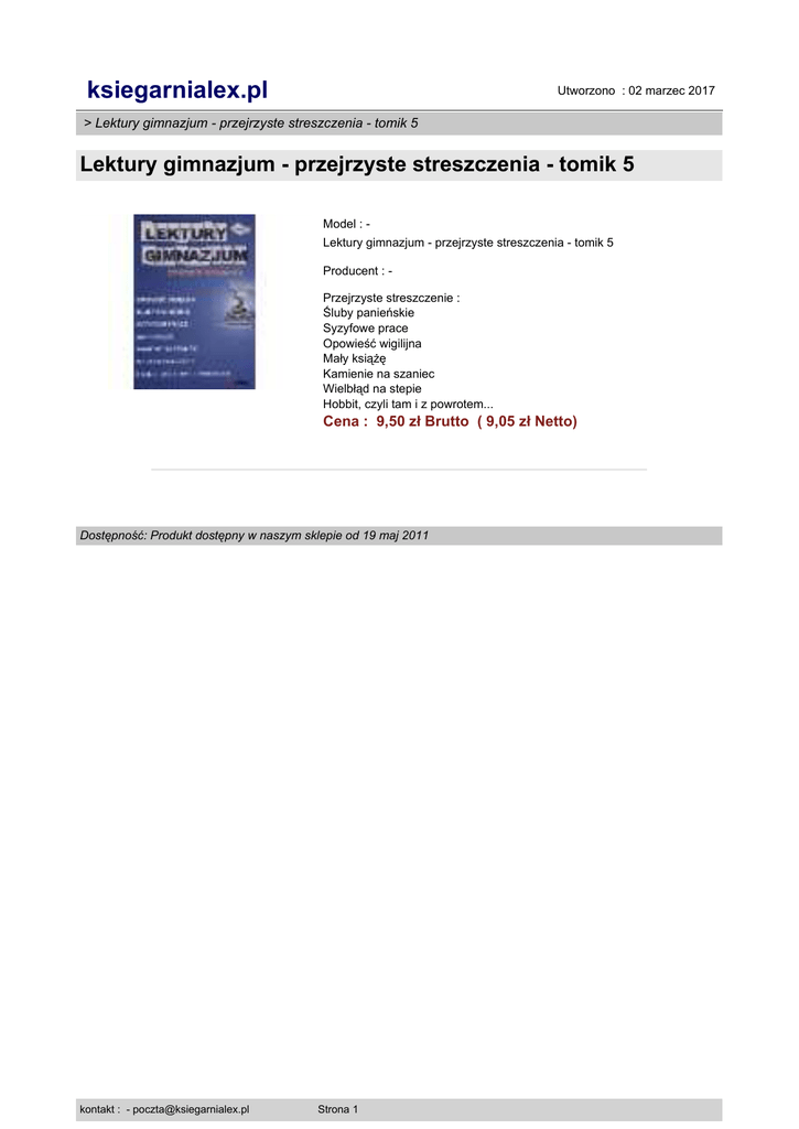 ksiegarnialex.pl Utworzono : 02 marzec 2017 > Lektury gimnazjum - przejrzyste streszczenia - tomik 5 Lektury gimnazjum - przejrzyste streszczenia - tomik 5 Model : Lektury gimnazjum - przejrzyste streszczenia - tomik 5 Producent : Przejrzyste streszczenie : Śluby panieńskie Syzyfowe prace Opowieść wigilijna Mały książę Kamienie na szaniec Wielbłąd na stepie Hobbit, czyli tam i z powrotem... Cena : 9,50 zł Brutto ( 9,05 zł Netto) Dostępność: Produkt dostępny w naszym sklepie od 19 maj 2011 kontakt : - [email protected] Strona 1