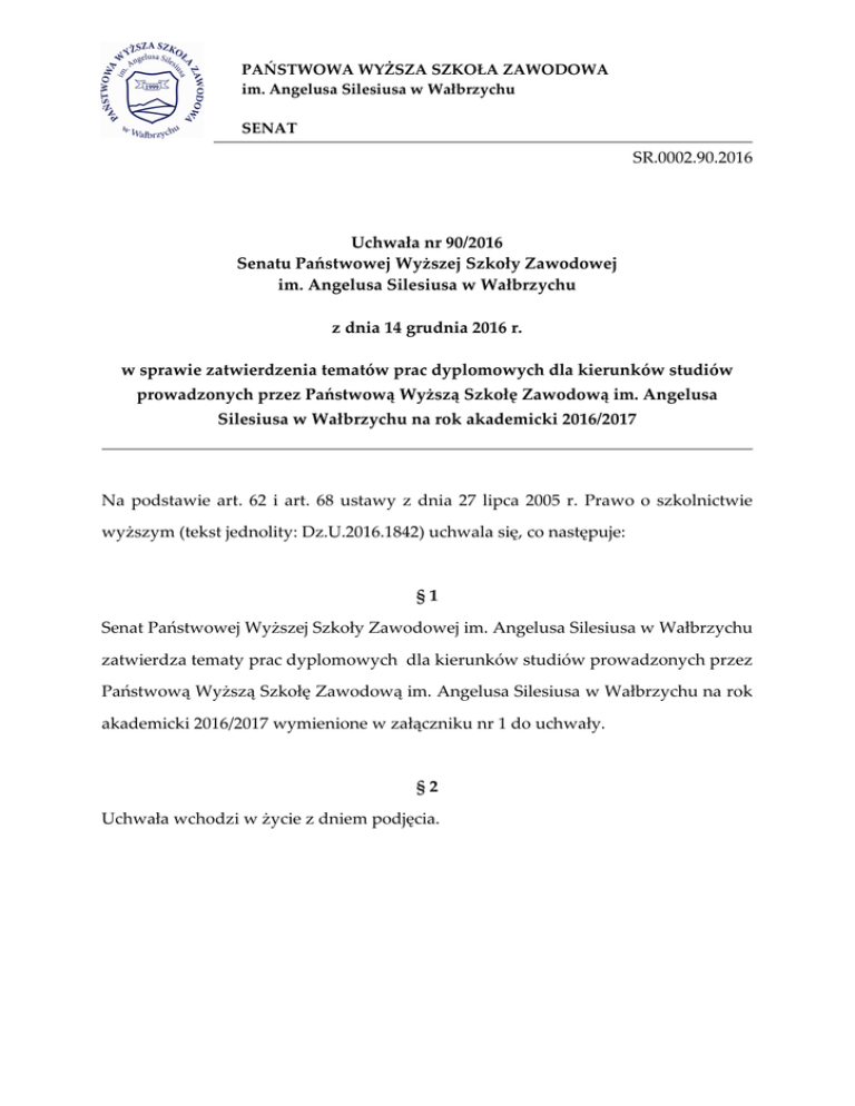 [Wpisz cytat z PAŃSTWOWA WYŻSZA SZKOŁA ZAWODOWA im. Angelusa Silesiusa w Wałbrzychu SENAT SR.0002.90.2016 Uchwała nr 90/2016 Senatu Państwowej Wyższej Szkoły Zawodowej im. Angelusa Silesiusa w Wałbrzychu z dnia 14 grudnia 2016 r. w sprawie zatwierdzenia tematów prac dyplomowych dla kierunków studiów prowadzonych przez Państwową Wyższą Szkołę Zawodową im. Angelusa Silesiusa w Wałbrzychu na rok akademicki 2016/2017 Na podstawie art. 62 i art. 68 ustawy z dnia 27 lipca 2005 r. Prawo o szkolnictwie wyższym (tekst jednolity: Dz.U.2016.1842) uchwala się, co następuje: §1 Senat Państwowej Wyższej Szkoły Zawodowej im. Angelusa Silesiusa w Wałbrzychu zatwierdza tematy prac dyplomowych dla kierunków studiów prowadzonych przez Państwową Wyższą Szkołę Zawodową im. Angelusa Silesiusa w Wałbrzychu na rok akademicki 2016/2017 wymienione w załączniku nr 1 do uchwały. §2 Uchwała wchodzi w życie z dniem podjęcia.