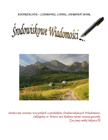 KWARTALNIK – CZERWIEC, LIPIEC, SIERPIEŃ 2010R. Serdecznie witamy wszystkich czytelników Środowiskowych Wiadomości. Oddajemy w Wasze ręce kolejny numer naszej gazetki. śyczymy miłej lektury ☺ WRAśENIA Z PIELGRZYMKI DO LWOWA Chciałabym podzielić się wraŜeniami z pobytu na Ukrainie we Lwowie i w okolicach. Byłam tam w dniach od 24 do 28 maja 2010 roku. Był to wyjazd zorganizowany przez oddział warszawski naszego Katolickiego Stowarzyszenia Niepełnosprawnych. Zwiedziłam wiele ciekawych miejsc: Zamek w Olesku- Olesko miejscowość połoŜona około 70 km od Lwowa. Znajduje się tam zamek zbudowany na przełomie XVI i XVII wieku przez ksiąŜąt halicko– wołyńskich. Zamek ten był wiele razy niszczony przez Tatarów. W 1629 roku na zamku w Olesku urodził się król Polski Jan III Sobieski. Ławra Poczajowska- zabytkowy prawosławny klasztor, miejsce pielgrzymek prawosławnych i grekokatolików. Według legendy w 1240 roku ukazała się tam Matka BoŜa w płonącym krzewie pozostawiając ślad swej stopy na skale. Z odciśniętego śladu wytrysnęło źródełko uzdrawiającej wody. Jako ciekawostkę podam, Ŝe na teren Ławry kobieta moŜe wejść tylko w chustce na głowie i w długiej spódnicy. Katedra Lwowska- kościół zbudowany na przełomie XIV i XV wieku z pięknymi freskami i ołtarzem. Znajdują się tam dwie pary organów. Katedra Świętego Jura- jest do kościół greckokatolicki z XIII wieku. Stare Miasto- z wieloma kamienicami m.in. z Czarną Kamienicą nazwaną tak, poniewaŜ jej fasada jest prawie zupełnie czarna. Cmentarz Janowski– znajduje się tam grób arcybiskupa Józefa Bilczewskiego, który w 2001 został beatyfikowany przez papieŜa Jana Pawła II podczas jego wizyty we Lwowie, a kanonizowany przez Benedykta XVI w czerwcu 2005 r. w Rzymie. Cmentarz Łyczakowski- jest tam pochowanych wielu sławnych Polaków m.in. Maria Konopnicka. Cmentarz Orląt- znajdują się tam groby obrońców Lwowa z czasów wojny polsko- ukraińskiej i polskobolszewickiej. 2 Opera Lwowska - byliśmy tam na operetce znanego kompozytora Johanna Straussa pt: „Zemsta Nietoperza”. śółkiew- miasto, w którym znajduje się kościół z cudownym obrazem Niepokalanej Królowej RóŜańca Świętego namalowanym na przełomie XVI i XVII wieku. Był to bardzo fajny i ciekawy wyjazd. Dla mnie duŜym przeŜyciem było spotkanie z arcybiskupem Lwowa Mieczysławem Mokrzyckim długoletnim sekretarzem Jana Pawła II. Iwona Wonsiewicz WYCIECZKA DO SANDOMIERZA Dnia 1 czerwca 2010 roku pojechaliśmy na wycieczkę do Sandomierza. Zwiedziliśmy Rynek sandomierski, kamienice mieszczańskie, gotycką katedrę z XIV wieku, w której zachowały się freski bizantyjsko– ruskie oraz obrazy i rzeźby. Weszliśmy na Bramę Opatowską i z wysokości 30 metrów podziwialiśmy fascynujący widok na miasto i okolice. Przeszliśmy równieŜ Podziemną Trasą Turystyczną, która nosi nazwę „sandomierskie lochy”. Trasa ta utworzona została w czasie prowadzenia górniczych prac zabezpieczających Stare Miasto przez połączenie dawnych piwnic i podziemnych składów kupieckich. Najgłębiej połoŜona komora sięga 12 metrów. Byliśmy w zbrojowni rycerskiej, gdzie obejrzeliśmy i przymierzyliśmy zbroje rycerskie oraz suknie księŜniczek. Widzieliśmy tam równieŜ salę tortur oraz broń rycerzy- miecze. Po zakończeniu zwiedzania udaliśmy się na pyszny obiad z deserem lodowym. Następnie był czas wolny na zakupienie pamiątek. Wróciliśmy do Podkowy Leśnej zadowoleni z udanej wycieczki. Marta Gruszczyńska WYCIECZKA DO SANDOMIERZA Dnia 1 czerwca 2010 roku pojechaliśmy razem z naszymi rodzicami do Sandomierza. Rano o godz. 15 7 wsiedliśmy do autokaru i wyruszyliśmy w trasę. Nasza podróŜ trwała ponad 4 godziny. Gdy 3 dojechaliśmy na miejsce to udaliśmy się w stronę Rynku. W południe wysłuchaliśmy hejnał sandomierski, który wzorowany jest na twórczości Mikołaja Gomółki. Następnie zwiedziliśmy Bazylikę Katedralną Narodzenia Najświętszej Marii Panny, w której pani przewodnik opowiedziała nam historię kościoła oraz Sandomierza. Z Bazyliki Katedralnej udaliśmy się do lochów sandomierskich. Po wyjściu z lochów poszliśmy zwiedzać Bramę Opatowską. Weszliśmy na nią i z wysokości 30 metrów podziwialiśmy Sandomierz. Gdy zeszliśmy z Bramy Opatowskiej to udaliśmy się do zbrojowni, w której przymierzaliśmy róŜne stroje rycerskie i robiliśmy sobie zdjęcia. Ze zbrojowni skierowaliśmy się w stronę restauracji ”Pod CiŜemką”, w której zjedliśmy obiad i deser. Po posiłku wróciliśmy do autokaru i udaliśmy się do Podkowy Leśnej. Joanna Stodolska WYCIECZKA DO SANDOMIERZA Do Sandomierza dojechaliśmy o godz. 1130. Gdy wyszliśmy z autokaru to juŜ czekała na nas pani przewodnik, która oprowadziła nas po Sandomierzu. Chodziliśmy po Sandomierzu i zwiedzaliśmy go do godz. 1430. Byliśmy na Rynku sandomierskim oraz zwiedziliśmy Bazylikę Katedralną Narodzenia Najświętszej Marii Panny. Potem poszliśmy do podziemnej trasy turystycznej. 4 Sandomierskie lochy owiane są legendami, z których główną jest legenda o Halinie Krempiance, która uratowała Sandomierz przed Tatarami. Podstępnie zwabiła ona Tatarów do lochów i wraz z nimi zginęła ocalając miasto. Celem podziemnych korytarzy było schronienie dla mieszkańców miasta oraz słuŜyły one jako skład towarów. Trasa prowadzi pod 8 kamienicami. Ma długość 470 metrów, a najgłębiej połoŜona piwnica znajduje się na głębokości 12 metrów pod sandomierskim Rynkiem. Na ścianach korytarzy moŜna spotkać freski przedstawiające historię Sandomierza, wzory monet oraz herby szlacheckie. Po wyjściu z lochów weszliśmy na Bramę Opatowską i podziwialiśmy piękne widoki. Potem poszliśmy do Zbrojowni Rycerskiej, gdzie zobaczyliśmy oraz przymierzyliśmy zbroje rycerskie. Mogliśmy równieŜ wziąć do ręki miecz lub kuszę. Na koniec poszliśmy na obiad do res