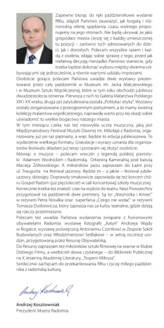 Zapewne biorąc do ręki październikowe wydanie RIKu, zdążyli Państwo zauważyć, jak bogatą i różnorodną ofertę spędzenia czasu wolnego proponujemy na jego stronach. Nie będę ukrywał, że jako gospodarz miasta cieszę się z każdej umieszczonej tu pozycji – zarówno tych adresowanych do dzieci, jak i dorosłych. Polecam wszystkie razem i każdą z osobna, zdając sobie sprawę z tego, przed jak niełatwą decyzją nierzadko Państwo staniecie, gdy trzeba będzie dokonać wyboru między dwiema odbywającymi się jednocześnie, a równie wartymi udziału imprezami. Osobiście gorąco polecam Państwa uwadze dwie wystawy prezentowane przez cały październik w Muzeum im. Jacka Malczewskiego i w Muzeum Sztuki Współczesnej, które w tym roku obchodzi jubileusz dwudziestolecia istnienia. Pierwsza z nich to Galeria Malarstwa Polskiego XIX i XX wieku, druga zaś zatytułowana została „Polityka i etyka”. Wystawy zostały zorganizowane z przeogromnym pietyzmem, a że mamy świetną kolekcję malarstwa współczesnego, naprawdę warto przy tej okazji sobie uświadomić to wielkie bogactwo naszego miasta. W tym miesiącu czeka nas też niezwykła uczta muzyczna, jaką jest Międzynarodowy Festiwal Muzyki Dawnej im. Mikołaja z Radomia, organizowany już po raz piętnasty, a więc będzie to edycja jubileuszowa. To wydarzenie wielkiego formatu. Gratulacje i wyrazy uznania dla organizatorów festiwalu składam już teraz i postaram się złożyć osobiście. Mówiąc o muzyce – polecam wieczór z legendą polskiej pianistyki Adamem Wodnickim i Radomską Orkiestrą Kameralną pod batutą Macieja Żółtowskiego. A miłośników jazzu zapraszam do Łaźni przy ul. Traugutta na festiwal jazzowy. Będzie to – a jakże – festiwal jubileuszowy, dziesiąty. Doprawdy smakowicie zapowiada się też koncert chóru Gospel Radom (już pięciolecie!) w sali koncertowej szkoły muzycznej. Koniecznie trzeba też znaleźć czas na wyjście do teatru. Nasz Powszechny przygotował na październik dwie premiery. Są to: „Nieznośka i Kmieć” w reżyserii Petra Nosalka oraz superfarsa „Czego nie widać” w reżyserii Tomasza Dutkiewicza, który zaprasza nas za kulisy teatralne, gdzie dzieją się rzeczy prześmieszne. Polecam też uwadze Państwa wydarzenia związane z honorowymi obywatelami Radomia: wystawę fotografii „Katyń” Andrzeja Wajdy w Rogatce, wystawę poświęconą Antoniemu Czortkowi w Zespole Szkół Budowlanych oraz Włodzimierzowi Sedlakowi – w setną rocznicę urodzin, przygotowaną przez Resursę Obywatelską. Do Resursy zapraszam też miłośników sztuki filmowej na seanse w Klubie Dobrego Filmu, a wielbicieli słowa czytanego – do Biblioteki Publicznej na X Jesienną Akademię Literatury, „Tropem Miłosza”. Serdecznie zachęcam do przekartkowania RIKu i życzę miłego października z radomską kulturą. Andrzej Kosztowniak Prezydent Miasta Radomia Spis treści W jesiennych promieniach Program ogólny imprez październik 2011 4 Urząd Miejski w Radomiu 13 Centrum Rzeźby Polskiej 21 Dom Kultury BORKI 25 Dom Kultury IDALIN 27 Galeria ROGATKA 29 ŁAŹNIA – Radomski Klub Środowisk Twórczych i Galeria 31 Mazowieckie Centrum Sztuki Współczesnej ELEKTROWNIA 37 Miejska Biblioteka Publiczna im. J.A i A.S. Załuskich 41 Miejski Ośrodek Kultury AMFITEATR 45 Młodzieżowy Dom Kultury im. H. Stadnickiej 47 Muzeum im. Jacka Malczewskiego 51 Muzeum Sztuki Współczesnej 57 Muzeum Wsi Radomskiej 61 Ośrodek Kultury i Sztuki RESURSA OBYWATELSKA 65 Radomska Orkiestra Kameralna 71 Teatr Powszechny im. J. Kochanowskiego 75 Kino HELIOS 83 Ważne wydarzenie 87 Imprezy różne 89 KLUBY radomskie 93 Dane teleadresowe 95 W jesiennych promieniach Program ogólny imprez październik 2011 Termin/ Godzina Wydarzenia W/P Miejsce W Galeria Kina HELIOS W „Łaźnia”-RKŚTiG ul. Żeromskiego 56 Wystawa fotografii do 5 Leszka Jastrzębiowskiego, Leszka Rejmera paź- i Zbigniewa Staniszewskiego dziernika – Radomskie Towarzystwo Fotograficzne pt. Dzikość i wdzięk Joanna d’Arc interpretacje. Edyta Leśniak, do 7 Aleksander Korman, Zygmunt Kozimor. paźWystawa fotografii, malarstwa i rysunku dziernika inspirowanych aktem. do 12 Hanna Wojdała-Markowska Miniatura paź- tkacka 2010–2011, Małgorzata Siwek Tkaniny. dziernika Wystawy autorskie. do 19 Termin zgłaszania kandydatów do Nagrody paźLiterackiej Miasta Radomia dziernika Św. Franciszek Puszczy Kozienickiej. Życie i twórczość Stefana Ślażyńskiego cały Polityka i etyka. Prace z kolekcji Muzeum Sztuki paź- Współczesnej w Radomiu dziernik Galeria Malarstwa Polskiego XIX i XX wieku 1 października 2011 sobota 10.30 Poranki z mini mini i 12.00 W „Łaźnia”-RKŚTiG ul. Traugutta 31/33 W Miejska Biblioteka Publiczna P P P P Muzeum Wsi Radomskiej Muzeum Sztuki Współczesnej Muzeum im. J. Malczewskiego Multikino ul. Chrobrego 1 19.00 Centrum Rzeźby Polskiej W Triennale Młodych 6TM 17.00 Pałac Józefa Brandta Galeria Kameralna Galeria Oranżeria Muzeum Rzeźby Współczesnej Galeria Kaplica Film wideo Emilii Kuryłowicz Balkon (Sextus Decimus) Paweł emisariusz. Film w ramach Chrześcijańskiego Klubu Filmowego Kabaret Wzięty, Pro publico betono, reż. Jarosław Rabenda W ul. Św. Wacława 8 P Teatr Powszechny Konkurs plastyczny Barwy Jesieni – konkurs adresowany do dzieci w wieku przedszkolnym W DK Borki 2 października 2011 niedziela 10.00 Festiwal Ziemniaka P Muzeum Wsi Radomskiej 10.30 Poranek Filmowy P Kino HELIOS P Multikino ul. Chrobrego 1 10.30 Poranki z mini mini i 12.00 17.00 Las odpowie ciszą 17.30 [4] odsłonięcie tablicy i modlitwa ekumeniczna spektakl słowno-muzyczny 9.30 16.30 Wystawa. Objawy 14.00 16.40 Kabaret Wzięty, Pro publico betono, P reż. Jarosław Rabenda 3 października 2011 poniedziałek Emdekowska Liga Tenisa Stołowego W Teatr Powszechny MDK, ul. Daszyńskiego 5 4 października 2011 wtorek Wystawa. Olaf Brzeski. Pałac Wystawa. Artur Malewski. Ontohigiena 19.00 W XV Tu