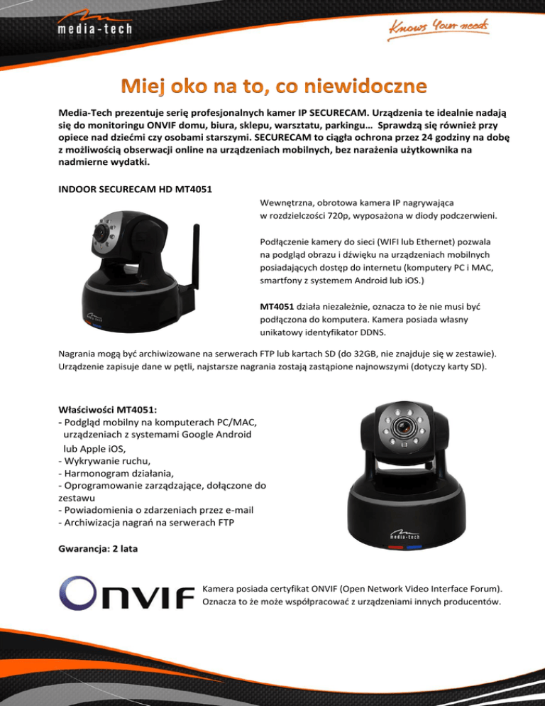 Media-Tech prezentuje serię profesjonalnych kamer IP SECURECAM. Urządzenia te idealnie nadają się do monitoringu ONVIF domu, biura, sklepu, warsztatu, parkingu… Sprawdzą się również przy opiece nad dziedmi czy osobami starszymi. SECURECAM to ciągła ochrona przez 24 godziny na dobę z możliwością obserwacji online na urządzeniach mobilnych, bez narażenia użytkownika na nadmierne wydatki. INDOOR SECURECAM HD MT4051 Wewnętrzna, obrotowa kamera IP nagrywająca w rozdzielczości 720p, wyposażona w diody podczerwieni. Podłączenie kamery do sieci (WIFI lub Ethernet) pozwala na podgląd obrazu i dźwięku na urządzeniach mobilnych posiadających dostęp do internetu (komputery PC i MAC, smartfony z systemem Android lub iOS.) MT4051 działa niezależnie, oznacza to że nie musi byd podłączona do komputera. Kamera posiada własny unikatowy identyfikator DDNS. Nagrania mogą byd archiwizowane na serwerach FTP lub kartach SD (do 32GB, nie znajduje się w zestawie). Urządzenie zapisuje dane w pętli, najstarsze nagrania zostają zastąpione najnowszymi (dotyczy karty SD). Właściwości MT4051: - Podgląd mobilny na komputerach PC/MAC, urządzeniach z systemami Google Android lub Apple iOS, - Wykrywanie ruchu, - Harmonogram działania, - Oprogramowanie zarządzające, dołączone do zestawu - Powiadomienia o zdarzeniach przez e-mail - Archiwizacja nagrao na serwerach FTP Gwarancja: 2 lata Kamera posiada certyfikat ONVIF (Open Network Video Interface Forum). Oznacza to że może współpracowad z urządzeniami innych producentów. Specyfikacja MT4051: SENSOR OPTYCZNY: CMOS 720p (1280x720ppi) OBIEKTYW: Szklany, f:3.6mm, F2.4, filtr IR CUT KĄT WIDZENIA: 60o, obrót poziom /obrót pion: 350°/100° PODŚWIETLENIE W CIEMNOŚCI: 8 diod podczerwonych 6mm, efektywne do 5 metrów DŹWIĘK: Dwustronny, wbudowany mikrofon, gniazdo 3,5m do podłączenia głośnika OBRAZ: Kompresja h.264, 1280x720, 640x360, 320x180 do 30kl/s. WE/WY: Złącze alarmowe, karta pamięci SD do 32GB (nie znajduje się w zestawie) SIEĆ: Gniazdo Ethernet RJ45 10/100Mbps, WIFI IEEE 802.11 b/g PROTOKOŁY: HTTP/DHCP/IP/TCP/UDP/SMTP/DDNS/UPnP; zgodność z ONVIF ZASILANIE: Zasilacz 5V Oprogramowanie SecureCAMView służy do zarządzania w „chmurze” kamerami IP. Umożliwia szeroką kontrole nad podłączonymi kamerami, monitoring, zapis nagrania, wykrywanie ruchu, ustawienia powiadomieo itp. Zarówno w sieci LAN jak i WAN. Właściwości aplikacji: - Współpraca z kamerami P2P - Wsparcie protokołu DDNS - Terminarz nagrao - Nagrywanie lub wykonywanie zdjęd PRZY WYKRYCIU RUCHU - Przesyłanie obrazu i dźwięku - Kontrola nad parametrami obrazu - Sterowanie obrotem kamery PTZ