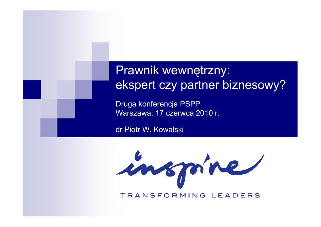 Prawnik wewnĊtrzny: ekspert czy partner biznesowy? Druga konferencja PSPP Warszawa, 17 czerwca 2010 r. dr Piotr W. Kowalski Plan wykáadu 1. 2. 3. 4. 5. Jak obecnie zmienia siĊ rola prawników wewnĊtrznych w firmach: przyczyny zmian, ich zakres, oczekiwania zarządów – rola „partnera biznesowego” Co oznaczają te zmiany z perspektywy zakresu kompetencji i umiejĊtnoĞci prawników: do czego przygotowuje nas tradycyjna edukacja prawnicza i ĞcieĪka kariery – rola „eksperta” Na czym polegają zasadnicze róĪnice pomiĊdzy rolą „partnera biznesowego” a rolą „eksperta”, a gdzie są páaszczyzny wspólne Jak „ekspert” moĪe staü siĊ „partnerem biznesowym” – najwaĪniejsze bariery w rozwoju i jak sobie z nimi radziü Gdzie jesteĞmy na tej drodze od „eksperta” do „partnera biznesowego” i czy warto na nią wchodziü Co wskazuje na zasadniczą zmianĊ roli prawników wewnĊtrznych 1. 2. 3. 4. 5. Zmieniáo siĊ postrzeganie roli prawnika wewnĊtrznego (PW) przez zarządy firm – badanie Eversheds „Client Revolution” – 74 % DDP jest postrzeganych jako strategiczni partnerzy Sami dyrektorzy departamentów prawnych (DDP) inaczej postrzegają swoją rolĊ zarówno wobec zarządów firm jak i prawników zewnĊtrznych Zmieniáy siĊ zasady rekrutacji na stanowisko DDP – w USA kariery prawnika wewnĊtrznego i zewnĊtrznego ulegáy rozdzieleniu - warunkiem zostania DDP jest kilkuletnie doĞwiadczenie jako PW Zmiana umiejscowienia DDP w hierarchii firmy – Chief Legal Officer (poziom C- level management: CEO, COO, CFO …) Przewidywane kierunki zmian na przyszáoĞü – agencje rekrutacyjne w USA przewidują do 2020 roku 3x wzrost iloĞci prawników wewnĊtrznych! Powody zmiany roli DDP 1. 2. 3. 4. 5. 6. Wzrost znaczenia zarządzania ryzykiem w tworzeniu strategii firmy: kryzys ekonomiczny katalizatorem, zmiana z podejĞcia „reaktywnego” na „proaktywne” Programy redukcji i zmiany struktury kosztów: aktualnie wydatki na prawników zewnĊtrznych stanowią 60–40 % caáego budĪetu DDP w USA, analitycy przewidują zmniejszenie do 30–20 % w nastĊpnych kilku latach Rozszerzenie zakresu dziaáania – objecie przez DDP nowych funkcji korporacyjnych: corporate governance, etyka w biznesie, spoáecznie odpowiedzialne przedsiĊbiorstwo Komplikacja otoczenia prawnego – pochodna globalizacji: róĪne rzeczywistoĞci normatywne, kulturowe, spoáeczne, wzrost znaczenia regulacji ponadnarodowych Wzrost „regulacyjnoĞci” paĔstwa w gospodarce jako wynik aktualnego kryzysu i poprzednich skandali gospodarczych Wzrost oczekiwania biznesu wobec prawników w zakresie „wartoĞci dodanej” – wprowadzenie mierzenia ROI i innych parametrów jakoĞciowych Jak zmienia siĊ rola prawników wewnĊtrznych w firmach – matryca zarządzania ryzykiem 100 NatĊĪenie ryzyka Gaszenie „poĪarów” Tworzenie ci Ğ o rt „przewagi” a w st j o r e Wz dan konkurencyjnej Strategiczna rola prawników wewnĊtrznych – tylko oni tak dobrze znają firmĊ do 50 Rutynowe „zapewnienie zgodnoĞci” Zarządzanie „operacyjne” 0 0 50 StrategicznoĞü wpáyw na przewagĊ konkurencyjną 100 Jak zwiĊkszyü biznesową wartoĞü dodaną: kluczowe kompetencje partnera biznesowego 1. 2. 3. 4. 5. 6. „systemowoĞü” - masz zawsze „trzech klientów” (osobĊ, organizacjĊ i klientów organizacji) „proaktywnoĞü” - samodzielnie obserwuj i wyciągaj wnioski; nie czekaj aĪ przyjdą do Ciebie „prewencja” - czy zajmujesz siĊ tylko symptomami czy siĊgasz do przyczyn „implementacja” - czy moje rozwiązanie zmienia rzeczywistoĞü - rola struktur i procesów „strategicznoĞü” - czy najwiĊcej czasu, uwagi i energii poĞwiĊcam na sprawy naprawdĊ kluczowe dla firmy „partnerstwo” - jakie mogĊ otrzymaü wsparcie od innych w tym co robiĊ - nie jestem samotną wyspą! Partnerstwo biznesowe w praktyce - studium przypadku „Káopoty z dziaáem HR” (1) 1. Klient (General Counsel (GC) w Ğredniej wielkoĞci sieci supermarketów w Wielkiej Brytanii) postanawia ograniczyü wzrastające z roku na rok koszty procesów pracowniczych rozliczanych po stawkach godzinowych i ustala staáy budĪet dla kancelarii zewnĊtrznej na roczną obsáugĊ caáoĞci sporów w tej dziedzinie – 500.000ǧ (poprzednik rok minus 10 %) 2. Klient jest dla kancelarii strategiczny, wiĊc zlecenie zostaje przyjĊte jednak wzrost liczby sporów i obniĪony budĪet powoduje odzyskanie jedynie 50% stawek przez kancelariĊ. 3. Rezygnacja ze zlecenia grozi caákowitą utratą klienta – co robiü?! Partnerstwo biznesowe w praktyce - studium przypadku „Káopoty z dziaáem HR” – rozwiązania (2) 1. GC proponuje Kancelarii przedáuĪenie kontraktu na kolejne 4 lata i pomoc w peánym dostĊpie do personelu HR, Īeby ustaliü przyczyny tak duĪej iloĞci spraw sądowych oraz stworzyü systemowe rozwiązanie problemu – analiza typów sporów sugerowaáa GC, Īe sprawy są symptomem szerszego problemu – dziaá HR nie korzystaá dotychczas ze wsparcia GC (poza sporami). 2. GC tworzy ramy wspóápracy dla projektu budując relacjĊ z dyrektorem HR i wspólną agendĊ pomiĊdzy dziaáami na bazie celu biznesowego – obniĪenie iloĞci sporów pracowniczych = wzrost retencji pracowników oraz wyĪsza satysfakcja i motywacja w pracy. 3. Przeprowadzona przez kancelarie zewnĊtrzną analiza przyczyn sporów, wsparta wywiadami z menadĪerami liniowymi i pracownikami HR, wskazaáa na kluczowe przyczyny powstawania konfliktów pracowniczych. 4. Rozwiązaniem systemowym okazaáo siĊ przeprowadzenie szkoleĔ dla menadĪerów liniowych, stworzenie nowych wzorów umów, jasnego regulaminu pracy, wprowadzenie systemu „wczesnego ostrzegania” 5. Po szeĞciu miesiącach od wprowadzenia nowych rozwiązaĔ iloĞü sporów spadáa o 60%. Jakie umiejĊtnoĞci, przekonania i wartoĞci umoĪliwiają prawnikom stawanie siĊ partnerem biznesowym 1. Tworzenie trwaáych i opartych na zaufaniu relac