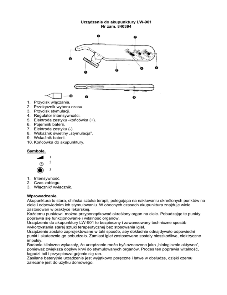 Urządzenie do akupunktury LW-901 Nr zam. 840394 1. Przycisk włączania. 2. Przełącznik wyboru czasu 3. Przycisk stymulacji. 4. Regulator intensywności. 5. Elektroda zestyku -końcówka (+). 6. Pojemnik baterii. 7. Elektroda zestyku (-). 8. Wskaźnik świetlny „stymulacja”. 9. Wskaźnik baterii. 10. Końcówka do akupunktury. Symbole. 1 2 3 1. Intensywność. 2. Czas zabiegu. 3. Włącznik/ wyłącznik. Wprowadzenie. Akupunktura to stara, chińska sztuka terapii, polegająca na nakłuwaniu określonych punktów na ciele i odpowiednim ich stymulowaniu. W obecnych czasach akupunktura znajduje wiele zastosowań w praktyce lekarskiej. Każdemu punktowi można przyporządkować określony organ na ciele. Pobudzając te punkty poprawia się funkcjonowanie i witalność organów. Urządzenie do akupunktury LW-901 to bezpieczny i zawansowany techniczne sposób wykorzystania starej sztuki terapeutycznej bez stosowania igieł. Urządzenie zostało zaprojektowane w taki sposób, aby dokładnie odnajdywało odpowiedni punkt i skutecznie go pobudzało. Zamiast igieł zastosowane zostały nieszkodliwe, elektryczne impulsy. Badania kliniczne wykazały, że urządzenie może być oznaczone jako „biologicznie aktywne”, ponieważ zwiększa dopływ krwi do stymulowanych organów. Proces ten poprawia witalność, łagodzi ból i przyspiesza gojenie się ran. Zasilane bateryjnie urządzenie jest wyjątkowo poręczne i łatwe w obsłudze, dzięki czemu zalecane jest do użytku domowego. Możliwości. • Efektywna terapia bez stosowania igieł. • Bezpieczne i łatwe użytkowanie. • Wyszukiwanie i stymulacja punktów akupunkturowych jednym urządzeniem. • Optymalnie zaprojektowana końcówka umożliwiająca dokładne wyszukiwanie i stymulowanie. • Sygnał akustyczny przy odnalezieniu punktu akupunkturowego. • Zielona dioda świecąca w fazie stymulacji. • Możliwość wyboru intensywności terapii. • Manualne lub automatyczne ustawianie trwania fazy stymulacji. • Baterie z długim okresem przydatności. • Kontrolka sygnalizująca konieczność wymiany baterii. • Możliwość odłączenia baterii. • Poręczne i lekkie urządzenie do zastosowania w domu i w podróży. Sposób funkcjonowania urządzenia. Urządzenie pracuje w fazie wyszukiwania lub stymulacji. Posiada specjalną sondę, która precyzyjnie wyszukuje i stymuluje określone punkty. W procesie wyszukiwania urządzenie wysyła słaby prąd i mierzy oporność skóry. Wynik pomiaru wskazywany jest poprzez różną wysokość dźwięku. Im mniejsza oporność tym wyższy (jaśniejszy) dźwięk. Punkty akupunkturowe posiadają niewielką oporność, dlatego dzięki zastosowanej metodzie mogą być łatwe do zidentyfikowania. Po odnalezieni odpowiedniego punktu jest on stymulowany tą samą sondą, po wcześniejszym naciśnięciu przycisku stymulacji. Intensywność stymulacji można ustawić przesuwanym regulatorem 4. LW-901 to elektro-biologiczne urządzenie z dwoma funkcjami. Wyszukuje i stymuluje ważne połączenia nerwowe nazwane punktami akupunktorowymi. Urządzenie pracuje dwubiegunowo- podczas terapii wiele pasm nerwowych jest stymulowanych, jednocześnie łagodzone są reakcje alergiczne, wywołane na skórze przez procesy chemiczne. Obsługa. Trzymając urządzenie dotknij skóry ręki elektrodą stykową i pasywną elektrodą (7) (zobacz poniższy rysunek). Urządzenie powinno być trzymane przez osobę podlegającą terapii, ponieważ pasywna elektroda jest końcem obwodu. Czujnik pomiarowy (końcówka 5) jest innym zakończeniem. Jeżeli terapia przeprowadzana jest przez jedną osobę, drugiej, powinna ona dotykać osoby leczonej, aby obwód prądu został zamknięty. Włącz urządzenie przyciskiem załączania (1), Urządzenie będzie znajdowało się w fazie wyszukiwania, sygnalizowanej głębokim dźwiękiem. Przesuwaj końcówkę urządzenia po skórze tej partii ciała, na której umieszczone są pożądane receptory. Przyciśnij lekko końcówkę do skóry. Jeżeli dany punkt zostanie zidentyfikowany dźwięk akustyczny będzie najgłośniejszy. Po odnalezieniu właściwego punktu możesz rozpocząć fazę stymulacji. Wybierz odpowiedni czas trwania stymulacji za pomocą przycisku ustawienia czasu (2). Możesz wybrać przedział 15 lub 30 sek. lub ustawić tryb manualny (MAN), umożliwiający wybór dowolnego przedziału czasu. Jeżeli wybrałeś czas zaprogramowany, naciśnij przycisk stymulacji (3). Urządzenie automatycznie zakończy terapię po upływie zaprogramowanego czasu. W trybie manualnym urządzenie będzie działało do momentu wyłączenia przyciskiem stymulacji. Po rozpoczęciu stymulacji dźwięk akustyczny zostanie wyłączony i zielona dioda (8) zacznie pulsować. Przyciskiem intensywności (4) możesz regulować natężenie zabiegu. Po zakończeniu fazy stymulacji urządzenie przejdzie automatycznie w fazę wyszukiwania. Pulsujący wskaźnik baterii (9) sygnalizuje konieczność wymiany baterii. Zastosowania Możliwości zastosowań elektro akupunktury w terapii i diagnostyce jest bardzo wiele. Poniżej przedstawione są przykłady: - bóle ramion i łokci. - bóle rąk - bóle pleców, - bóle nóg, - bóle karku, - bóle zębów, - bóle okolic kręgosłupa, - bóle głowy, migreny, - bóle menstruacyjne, - nudności, - bezsenność, - stres, - palenie. Uwaga: Stosowanie urządzenie nie może zastąpić terapii zalecanej przez lekarza. Urządzenie nie może być stosowane przez osoby posiadające rozrusznik serca. Przeciwwskazania. Urządzenie nie może być stosowane: - przez osoby z rozrusznikiem serca, - przy uszkodzeniach skóry, - do terapii w pobliżu krtani, - przez osoby z arytmią. Wymiana baterii. - Otwórz pojemnik baterii (6). - Włóż dwie baterie, przestrzegając prawidłowego rozmieszczenia biegunów. - Zamknij pokrywę (6). Konserwacja. Czyszczenia dokonuj zwilżoną ściereczką . Zwróć uwagę, aby żadne ciecz nie przedostała się do wnętrza obudowy. Dane te