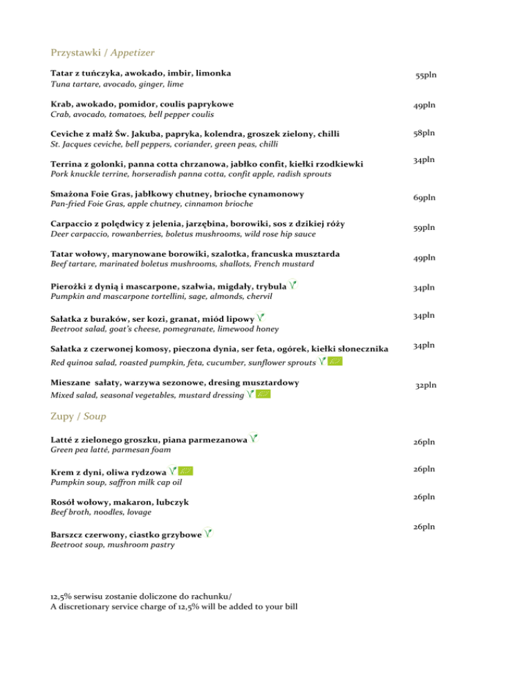 Przystawki / Appetizer Tatar z tuńczyka, awokado, imbir, limonka Tuna tartare, avocado, ginger, lime Krab, awokado, pomidor, coulis paprykowe Crab, avocado, tomatoes, bell pepper coulis Ceviche z małż Św. Jakuba, papryka, kolendra, groszek zielony, chilli St. Jacques ceviche, bell peppers, coriander, green peas, chilli Terrina z golonki, panna cotta chrzanowa, jabłko confit, kiełki rzodkiewki Pork knuckle terrine, horseradish panna cotta, confit apple, radish sprouts Smażona Foie Gras, jabłkowy chutney, brioche cynamonowy Pan-‐fried Foie Gras, apple chutney, cinnamon brioche Carpaccio z polędwicy z jelenia, jarzębina, borowiki, sos z dzikiej róży Deer carpaccio, rowanberries, boletus mushrooms, wild rose hip sauce Tatar wołowy, marynowane borowiki, szalotka, francuska musztarda Beef tartare, marinated boletus mushrooms, shallots, French mustard 55pln 49pln Pierożki z dynią i mascarpone, szałwia, migdały, trybula Pumpkin and mascarpone tortellini, sage, almonds, chervil Red quinoa salad, roasted pumpkin, feta, cucumber, sunflower sprouts Mieszane sałaty, warzywa sezonowe, dresing musztardowy Zupy / Soup Latté z zielonego groszku, piana parmezanowa Green pea latté, parmesan foam Barszcz czerwony, ciastko grzybowe Beetroot soup, mushroom pastry 34pln 69pln 59pln 49pln 34pln 34pln 34pln 32pln Krem z dyni, oliwa rydzowa Pumpkin soup, saffron milk cap oil Rosół wołowy, makaron, lubczyk Beef broth, noodles, lovage 58pln Sałatka z buraków, ser kozi, granat, miód lipowy Beetroot salad, goat’s cheese, pomegranate, limewood honey Sałatka z czerwonej komosy, pieczona dynia, ser feta, ogórek, kiełki słonecznika Mixed salad, seasonal vegetables, mustard dressing 26pln 26pln 26pln 26pln 12,5% serwisu zostanie doliczone do rachunku/ A discretionary service charge of 12,5% will be added to your bill Ryby / Fish Łosoś pieczony w ziołach, polenta szpinakowa, brukselka, sos pomidorowy Herb-‐crusted salmon, spinach polenta, Brussels sprouts, tomato sauce Filet dzikiego okonia, zielony groszek, cebula, chrupiący boczek, fondant ziemniaczany Wild sea bass fillet, green peas, onions, crispy bacon, potato fondant Stek z tuńczyka, bakłażan, miso, sezam Tuna steak, aubergine, miso, sesame seeds Sola Dover, sezonowe warzywa Dover Sole, seasonal vegetables Mięsa / Meat Polędwiczki z sarny, purée z pietruszki, kurki, kopytka parmezanowe, sos z owoców leśnych Roe-‐deer loin, root parsley purée, chanterelles, parmesan gnocchi, forest fruit sauce Jagnięcina, karmelizowany kalafior, purée z brokuł, marchew Lamb, caramelized cauliflower, broccoli purée, carrots Polędwica wołowa, cukinia, pieczone warzywa korzenne, sos z czerwonego wina Beef fillet, zucchini, roasted root vegetables, red wine sos Duet wieprzowy, purée ziemniaczane, chrzan, gruszka, sos z musztardą Pommery Pork duet, potato purée, horseradish, pear, Pommery mustard sauce Dodatki/ Side orders Pieczone warzywa korzenne / roasted root vegetables Kopytka parmezanowe / parmesan gnocchi Gotowane lub grillowane warzywa / boiled or grilled vegetables Brukselka / brussels sprouts Purée ziemniaczane z oliwą truflową / potato purée with truffle oil Szpinak smażony / braised spinach Mieszane sałaty z pomidorem / Mixed salad with tomatoes Buraki zasmażane /braised beetroot opcja wegetariańska / vegetarian option produkt ekologiczny / organic product 12,5% serwisu zostanie doliczone do rachunku/ A discretionary service charge of 12,5% will be added to your bill Desery / Desserts Pieczony sernik „New York”, masło orzechowe, solony karmel New York style cheesecake, peanut butter, salted caramel Lawendowa panna cotta Lavender panna cotta Amber-‐baba „Bread & butter pudding”, śliwka, rodzynki, Baileys, lody śmietankowe Bread & butter pudding, prunes, raisins, Baileys, ice cream Parfait czekoladowe, borówka, lody mascarpone Chocolate parfait, blueberries, mascarpone ice cream Suflet czekoladowy, lody waniliowe, sos czekoladowy Chocolate soufflet, vanilla ice cream, chocolate sauce Karmelizowana tarta cytrynowa, włoska beza, lody karmelowe, sól Maldon Carmelized lemon tart, Italian meringue, caramel ice cream, Maldon salt Lody, sorbety Ice cream & sorbet selection Selekcja serów z konfiturami i orzechami Cheese selection with chutney and nuts Sommelier poleca selekcje win deserowych: Sommelier selection of dessert wines: 2008 Tokaji Szamorodni, Edes, Oremus, Hungary 2004 Le serrat, Domaine Sarda-‐Malet, Riversaltes, Roussillon,France 2009 Lions De Suduiraut, Sauternes, France 10 years old Tawny Port, Taylor’s, Douro Valley, Portugal 2010 Corte Giara, Recioto della Valpolicella, Allegrini, Veneto, Italy 12,5% serwisu zostanie doliczone do rachunku/ A discretionary service charge of 12,5% will be added to your bill