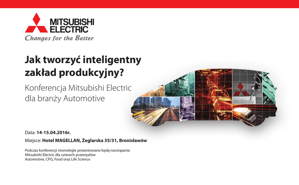 Jak tworzyć inteligentny zakład produkcyjny? Konferencja Mitsubishi Electric dla branży Automotive Data: 14-15.04.2016r. Miejsce: Hotel MAGELLAN, Żeglarska 35/31, Bronisławów Podczas konferencji równolegle prezentowane będą rozwiązania Mitsubishi Electric dla czterech przemysłów: Automotive, CPG, Food oraz Life Science Agenda - Konferencja dla branży Automotive 14.04.2016, czwartek BLOK I – CZĘŚĆ WSPÓLNA, SALA OCEANIA 9:30 - 10:00 Oficjalne rozpoczęcie konferencji. Mitsubishi Electric – global partner, local friend - Hitoshi Namba, Mitsubishi Electric BLOK II – KONFERENCJA DLA BRANŻY AUTOMOTIVE, SALA PACYFIK I 10:00 - 10:20 Rozwiązania Mitsubishi Electric dla branży Automotive - Jacek Taczała, Mitsubishi Electric 10:20 - 10:45 Precyzja budowy zrobotyzowanych maszyn montażowych dla komponentów automotive - Aumatic Sp. z o.o 10:45 - 11:10 Nowe trendy w aplikacjach kontrolno-pomiarowych w przemyśle automotive - Bogdan Iwiński, Veritech Sp. z o.o 11:10 - 11:30 Budowa maszyn na własny użytek, wsparcie systemami motion i serwo - Dariusz Zawadzki, Cooper Standard 11:30 - 11:50 Szeroka oferta maszynowa dla branży Automotive - MPL Techma, Karol Hejmowski 11:50 - 12:05 Przerwa kawowa 12:05 - 12:30 Wyposażenie krojowni – Allcomp Polska 12:30 - 12:55 Giętarki CNC dla przewodów hamulcowych i klimatyzacyjnych - Auto-Bast 12:55 - 13:20 Specjaliści od maszyn do zagniatania – TRASKO Automatyka Sp. z o.o 13:20 - 13:45 Eksperci w dziedzinie budowy linii do malowania proszkowego – ADAL Sp. z o.o. 13:45 - 14:10 Wydajne mycie przemysłowe w linii produkcyjnej. Analiza porównawcza metody inline i offline - GT85 14:10 - 15:10 Obiad – RESTAURACJA HOTELOWA 15:10 - 15:30 Zrobotyzowane lutowanie z urządzeniami firmy Alnea - Alnea 15:30 - 15:45 Czy modernizacja maszyn w przemyśle Automotive się opłaca? - Michał Gołda, Apena Remont Sp. z o.o. 15:45 - 16:00 Wykorzystanie falowników Mitsubishi w lakierni elementów plastikowych oraz w stanowisku laboratoryjnym AGH w Krakowie - Simtech Automatyka 16:30 - 19:00 Poznaj Mitsubishi Motors – jazdy testowe, HOL HOTELU 20:00 Uroczysta kolacja – SALA OCEANIA 15.04.2016, piątek 08:00 - 10:00 Śniadanie, RESTAURACJA HOTELOWA BLOK III– CZĘŚĆ WSPÓLNA, SALA LAGUNA 10:00 - 10:30 Living Environment Systems - czym się kierować przy wyborze klimatyzacji? - Piotr Jabłoński, Mitsubishi Electric 10:30 - 11:00 Poznaj Mitsubishi Motors - Mitsubishi Motors 11:00 - 11:30 Diagnostyka prewencyjna i energooszczędność w napędach - Grzegorz Kozioł, Mitsubishi Electric 11:30 - 12:00 CC-Link IE – czyli pomysł na Industry 4.0 - Andrzej Górczak, Mitsubishi Electric 12:00 - 12:30 „Error proofing” w procesie montażu - terminale Poka Yoke - Piotr Siwek, Mitsubishi Electric 12:30 - 12:45 Oficjalne zakończenie konferencji 13:00 Obiad, RESTAURACJA HOTELOWA • Dla osób posiadających zaproszenie, Mitsubishi Electric pokrywa koszty uczestnictwa • W hotelu jest możliwość skorzystania z kompleksu basenowego oraz strefy SPA • Ilość miejsc ograniczona – decyduje kolejność zgłoszeń • Zaproszenie jest dla dwóch osób z firmy • Organizator: Paulina Misterska, [email protected], tel. +48 724 250 892 Mitsubishi Electric Europe B.V. /// Polish Branch /// Krakowska 50 /// 32-083 Balice Tel.: +48 (0) 12 34 76 500 /// E-mail: [email protected] /// http://pl.mitsubishielectric.com/