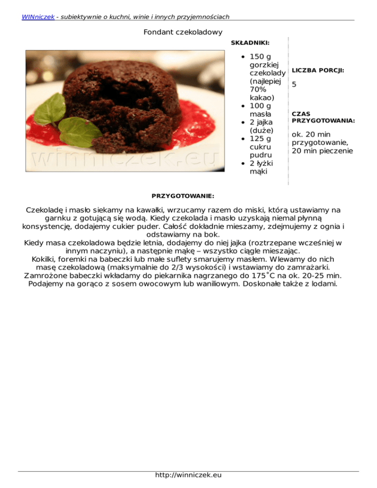 WINniczek - subiektywnie o kuchni, winie i innych przyjemnościach Fondant czekoladowy SKŁADNIKI: 150 g gorzkiej czekolady (najlepiej 70% kakao) 100 g masła 2 jajka (duże) 125 g cukru pudru 2 łyżki mąki LICZBA PORCJI: 5 CZAS PRZYGOTOWANIA: ok. 20 min przygotowanie, 20 min pieczenie PRZYGOTOWANIE: Czekoladę i masło siekamy na kawałki, wrzucamy razem do miski, którą ustawiamy na garnku z gotującą się wodą. Kiedy czekolada i masło uzyskają niemal płynną konsystencję, dodajemy cukier puder. Całość dokładnie mieszamy, zdejmujemy z ognia i odstawiamy na bok. Kiedy masa czekoladowa będzie letnia, dodajemy do niej jajka (roztrzepane wcześniej w innym naczyniu), a następnie mąkę – wszystko ciągle mieszając. Kokilki, foremki na babeczki lub małe suflety smarujemy masłem. Wlewamy do nich masę czekoladową (maksymalnie do 2/3 wysokości) i wstawiamy do zamrażarki. Zamrożone babeczki wkładamy do piekarnika nagrzanego do 175˚C na ok. 20-25 min. Podajemy na gorąco z sosem owocowym lub waniliowym. Doskonałe także z lodami. http://winniczek.eu WINniczek - subiektywnie o kuchni, winie i innych przyjemnościach http://winniczek.eu