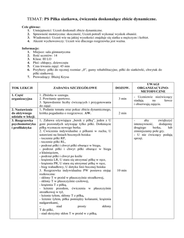 TEMAT: PS Piłka siatkowa, ćwiczenia doskonalące zbicie dynamiczne. Cele główne: 1. Umiejętności: Uczeń doskonali zbicie dynamiczne. 2. Sprawność motoryczna: skoczność, Uczeń potrafi wykonać wyskok obunóż. 3. Wiadomości: Uczeń wie na jakiej wysokości znajduje się siatka u mężczyzn i kobiet. 4. Akcent wychowawczy: Uczeń wie dlaczego rozgrzewka jest ważna. Informacje: 1. Miejsce: sala gimnastyczna 2. Ilość uczniów: 14 3. Klasa: III LO 4. Płeć: chłopcy, dziewczęta 5. Czas trwania zajęć: 45 min 6. Przybory: piłki do ręcznej rozmiar „0”, gumy rehabilitacyjne, piłki do siatkówki, chwytak do piłki siatkowej. 7. Prowadzący: Błażej Krysa TOK LEKCJI ZADANIA SZCZEGÓŁOWE 1. Część organizacyjna 1. Zbiórka w szeregu. 2. Powitanie sportowe. 3. Sprawdzenie liczby ćwiczących i przygotowania do zajęć. 1. Podanie tematu oraz pokaz zbicia dynamicznego, krótka pogadanka o rozgrzewce. AW. 2. Nastawienie do aktywnego udziału w lekcji. 3. Rozgrzewka psychomotoryka i profilaktyka 1. Zabawa ożywiająca „berek z piłką”, jeden z U goni pozostałych używając tylko piłki. Dotknięcie piłką wyznacza nowego berka. 2. Ćwiczenia indywidualne z piłkami w ruchu, U ustawieni na liniach bocznych boiska: - toczenie piłki RP, - toczenie piłki RL, - podrzut piłki i chwyt piłki oburącz w biegu, - podrzut piłki i chwyt piłki oburącz w biegu z klaśnięciem, - podrzut piłki i chwyt po koźle - krążenia LR, U stara się utrzymać piłkę w ręce, - krążenia PR, U stara się utrzymać piłkę w ręce, - bieg wahadłowy, U dotyka linii bocznej boiska 3. Rozgrzewka indywidualna PW postawa stojąc rozkroczna: - skłony T w przód w płaszczyźnie strzałkowej, - skłony T w płaszczyźnie czołowej, - krążenia T z piłką, - leżenie przodem, ćwiczenia w płaszczyźnie strzałkowej w tył, - leżenie tyłem, skłony T z piłką, - leżenie tyłem, piłka pomiędzy kolanami, krążenia nadgarstkami, siad prosty skłony T do piłki, - siad skrzyżny skłon T w przód w z piłką. DOZOW. UWAGI ORGANIZACYJNOMETODYCZNE 3 min - Uczniowie niećwiczący siadają na ławce i obserwują zajęcia. 2 min aby zwiększyć intensywność, dodajemy drugiego berka, lub zmniejszamy pole gry. - U nie ćwiczący podają sprzęt. 10 min 4. Kształtowanie umiejętności i doskonalenie sprawności. 5. Uspokojenie organizmu. 6. Część organizacyjno-porządkowa. 1. U przy drabinkach przy pomocy gum rehabilitacyjnych wykonują pracę R |w płaszczyźnie strzałkowej w przód (zdjęcie numer 1). 2. U ustawieni przy ścianie, wykonują odbicie oburącz kozłem o ścianę, 3. U ustawieni przy ścianie, wykonują zbicie piłki o ścianę (zdjęcie numer 2), 5. U wykonują zbicie dynamiczne wykorzystując piłki do ręcznej o rozmiarze „0” (zdjęcie numer 3) 6. U wykonują zbicie dynamiczne z „chwytaka” (zdjęcie numer 4) M. 7. Zbicie piłki bez przyrządów po wystawie. U. 8. Gra szkolna w piłkę siatkową. Uczniowie sami organizują grę oraz sędziują. W. Ćwiczenia rozciągające przy drabinkach, U kładą się przy drabinkach w leżeniu tyłem, wykonują rozkrok opierając NN o drabinki, w tej pozycji muszą wytrzymać 3 min. 1. Uprzątnięcie sali gimnastycznej. 2. Zbiórka 3. Omówienie lekcji 4. Sportowe pożegnanie. - N koryguje pracę ramienia żeby pracowało w przód. 25 min - N zwraca uwagę na poprawne wykonanie dojścia do zbicia dynamicznego. 3 min 2 min - Zwrócić uwagę na podciągnięcie rzepki podczas ćwiczeń. - Nagrodzenie aktywnych uczniów.