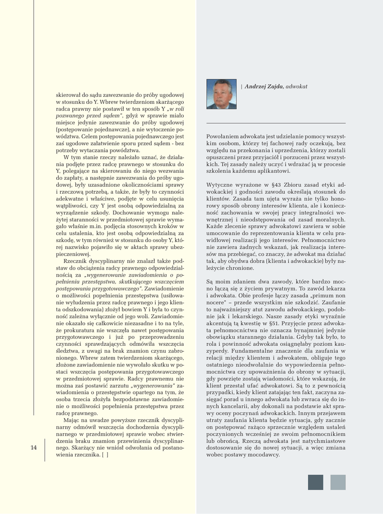 | A ndrzej Zajda, adwokat 14 skierował do sądu zawezwanie do próby ugodowej w stosunku do Y. Wbrew twierdzeniom skarżącego radca prawny nie postawił w ten sposób Y „w roli pozwanego przed sądem”, gdyż w sprawie miało miejsce jedynie zawezwanie do próby ugodowej (postępowanie pojednawcze), a nie wytoczenie powództwa. Celem postępowania pojednawczego jest zaś ugodowe załatwienie sporu przed sądem - bez potrzeby wytaczania powództwa. W tym stanie rzeczy należało uznać, że działania podjęte przez radcę prawnego w stosunku do Y, polegające na skierowaniu do niego wezwania do zapłaty, a następnie zawezwania do próby ugodowej, były uzasadnione okolicznościami sprawy i rzeczową potrzebą, a także, że były to czynności adekwatne i właściwe, podjęte w celu usunięcia wątpliwości, czy Y jest osobą odpowiedzialną za wyrządzenie szkody. Dochowanie wymogu należytej staranności w przedmiotowej sprawie wymagało właśnie m.in. podjęcia stosownych kroków w celu ustalenia, kto jest osobą odpowiedzialną za szkodę, w tym również w stosunku do osoby Y, której nazwisko pojawiło się w aktach sprawy ubezpieczeniowej. Rzecznik dyscyplinarny nie znalazł także podstaw do obciążenia radcy prawnego odpowiedzialnością za „wygenerowanie zawiadomienia o popełnieniu przestępstwa, skutkującego wszczęciem postępowania przygotowawczego”. Zawiadomienie o możliwości popełnienia przestępstwa (usiłowanie wyłudzenia przez radcę prawnego i jego klienta odszkodowania) złożył bowiem Y i była to czynność zależna wyłącznie od jego woli. Zawiadomienie okazało się całkowicie niezasadne i to na tyle, że prokuratura nie wszczęła nawet postępowania przygotowawczego i już po przeprowadzeniu czynności sprawdzających odmówiła wszczęcia śledztwa, z uwagi na brak znamion czynu zabronionego. Wbrew zatem twierdzeniom skarżącego, złożone zawiadomienie nie wywołało skutku w postaci wszczęcia postępowania przygotowawczego w przedmiotowej sprawie. Radcy prawnemu nie można zaś postawić zarzutu „wygenerowania” zawiadomienia o przestępstwie opartego na tym, że osoba trzecia złożyła bezpodstawne zawiadomienie o możliwości popełnienia przestępstwa przez radcę prawnego. Mając na uwadze powyższe rzecznik dyscyplinarny odmówił wszczęcia dochodzenia dyscyplinarnego w przedmiotowej sprawie wobec stwierdzenia braku znamion przewinienia dyscyplinarnego. Skarżący nie wniósł odwołania od postanowienia rzecznika. [ ] Powołaniem adwokata jest udzielanie pomocy wszystkim osobom, którzy tej fachowej rady oczekują, bez względu na przekonania i uprzedzenia, którzy zostali opuszczeni przez przyjaciół i porzuceni przez wszystkich. Tej zasady należy uczyć i wdrażać ją w procesie szkolenia każdemu aplikantowi. Wytyczne wyrażone w §43 Zbioru zasad etyki adwokackiej i godności zawodu określają stosunek do klientów. Zasada tam ujęta wyraża nie tylko honorowy sposób obrony interesów klienta, ale i konieczność zachowania w swojej pracy integralności wewnętrznej i nieodstępowania od zasad moralnych. Każde zlecenie sprawy adwokatowi zawiera w sobie umocowanie do reprezentowania klienta w celu prawidłowej realizacji jego interesów. Pełnomocnictwo nie zawiera żadnych wskazań, jak realizacja interesów ma przebiegać, co znaczy, że adwokat ma działać tak, aby obydwa dobra (klienta i adwokackie) były należycie chronione. Są moim zdaniem dwa zawody, które bardzo mocno łączą się z życiem prywatnym. To zawód lekarza i adwokata. Obie profesje łączy zasada „primum non nocere” – przede wszystkim nie szkodzić. Zaufanie to najważniejszy atut zawodu adwokackiego, podobnie jak i lekarskiego. Nasze zasady etyki wyraźnie akcentują tą kwestię w §51. Przyjęcie przez adwokata pełnomocnictwa nie oznacza bynajmniej jedynie obowiązku starannego działania. Gdyby tak było, to rola i powinność adwokata osiągnęłaby poziom kauzyperdy. Fundamentalne znaczenie dla zaufania w relacji między klientem i adwokatem, obliguje tego ostatniego nieodwołalnie do wypowiedzenia pełnomocnictwa czy upoważnienia do obrony w sytuacji, gdy powzięte zostają wiadomości, które wskazują, że klient przestał ufać adwokatowi. Są to z pewnością przypadki, kiedy klient zatajając ten fakt, zaczyna zasięgać porad u innego adwokata lub zwraca się do innych kancelarii, aby dokonali na podstawie akt sprawy oceny poczynań adwokackich. Innym przejawem utraty zaufania klienta będzie sytuacja, gdy zacznie on postępować rażąco sprzecznie względem ustaleń poczynionych wcześniej ze swoim pełnomocnikiem lub obrońcą. Rzeczą adwokata jest natychmiastowe dostosowanie się do nowej sytuacji, a więc zmiana wobec postawy mocodawcy. Umiejętność budowania relacji z klientem jako gwarancja właściwego postrzegania prowadzonych przez adwokatów spraw Utrata zaufania klienta do adwokata występuje generalnie z dwóch powodów: - po pierwsze, gdy stopień skomplikowanej sprawy cywilnej czy karnej powoduje, że klient mimo swojego przekonania nie zna skomplikowanej materii i nie ma minimalnej wiedzy i doświadczenia, aby trafnie ocenić od strony merytorycznej działanie własnego adwokata; - po drugie, częstą przyczyną jest niespełnienie oczekiwań w zakresie tzw. „skuteczności”; coraz częściej bowiem klienci wierzą w istnienie takich adwokatów, którzy w każdej sprawie znajdą lukę, albo zastosują swoje własne rozwiązania, które nazywają „załatwieniem sprawy”. Myślę, że to ostatnie oczekiwanie jest nasycone postaciami z filmów i książek, ukazujących życie w sposób uproszczony i pokazujących adwokata jako człowieka o nieograniczonych możliwościach, a także zasobach finansowych. Pamiętajmy, że elementarna zasadą wykonywania zawodu jest fakt, że klientowi nie wolno składać jakichkolwiek obietnic oraz zapewniać go co do spełnienia zdarzeń niepewnych, a do takich prawi